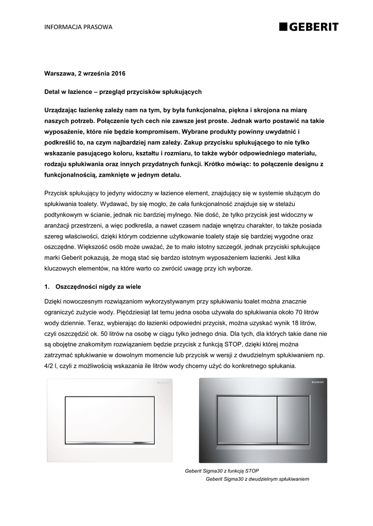 INFORMACJA PRASOWA Warszawa, 2 września 2016 Detal w łazience – przegląd przycisków spłukujących Urządzając łazienkę zależy nam na tym, by była funkcjonalna, piękna i skrojona na miarę naszych potrzeb. Połączenie tych cech nie zawsze jest proste. Jednak warto postawić na takie wyposażenie, które nie będzie kompromisem. Wybrane produkty powinny uwydatnić i podkreślić to, na czym najbardziej nam zależy. Zakup przycisku spłukującego to nie tylko wskazanie pasującego koloru, kształtu i rozmiaru, to także wybór odpowiedniego materiału, rodzaju spłukiwania oraz innych przydatnych funkcji. Krótko mówiąc: to połączenie designu z funkcjonalnością, zamknięte w jednym detalu. Przycisk spłukujący to jedyny widoczny w łazience element, znajdujący się w systemie służącym do spłukiwania toalety. Wydawać, by się mogło, że cała funkcjonalność znajduje się w stelażu podtynkowym w ścianie, jednak nic bardziej mylnego. Nie dość, że tylko przycisk jest widoczny w aranżacji przestrzeni, a więc podkreśla, a nawet czasem nadaje wnętrzu charakter, to także posiada szereg właściwości, dzięki którym codzienne użytkowanie toalety staje się bardziej wygodne oraz oszczędne. Większość osób może uważać, że to mało istotny szczegół, jednak przyciski spłukujące marki Geberit pokazują, że mogą stać się bardzo istotnym wyposażeniem łazienki. Jest kilka kluczowych elementów, na które warto co zwrócić uwagę przy ich wyborze. 1. Oszczędności nigdy za wiele Dzięki nowoczesnym rozwiązaniom wykorzystywanym przy spłukiwaniu toalet można znacznie ograniczyć zużycie wody. Pięćdziesiąt lat temu jedna osoba używała do spłukiwania około 70 litrów wody dziennie. Teraz, wybierając do łazienki odpowiedni przycisk, można uzyskać wynik 18 litrów, czyli oszczędzić ok. 50 litrów na osobę w ciągu tylko jednego dnia. Dla tych, dla których takie dane nie są obojętne znakomitym rozwiązaniem będzie przycisk z funkcją STOP, dzięki której można zatrzymać spłukiwanie w dowolnym momencie lub przycisk w wersji z dwudzielnym spłukiwaniem np. 4/2 l, czyli z możliwością wskazania ile litrów wody chcemy użyć do konkretnego spłukania. Geberit Sigma30 z funkcją STOP Geberit Sigma30 z dwudzielnym spłukiwaniem INFORMACJA PRASOWA 2. Higiena przede wszystkim Dwa okrągłe, lekko wypukłe przyciski zastosowane w spłuczce nie tylko dobrze wyglądają, ale także ułatwiają obsługę dwudzielnego spłukiwania. Ciekawą opcją jest wyposażenie przycisku w pojemnik na kostki higieniczne do spłuczki. Dodatkowo nie trzeba decydować się na to rozwiązanie od razu, ponieważ pojemnik można zamontować w dowolnym momencie, w czasie jego użytkowania. Kostkę aplikuje się w prosty sposób, jedynie odchylając lekko przycisk, a ona uwalniając powoli swój zapach, zapewnia czystość i higienę miski WC przy każdym spłukaniu wody. 3. Nowoczesność w każdym calu W toalecie równie ważny co higiena jest unoszący się zapach. Już nie trzeba inwestować w odświeżacze powietrza, które tylko maskują nieprzyjemne zapachy. Najnowsze rozwiązanie powoduje, że do pomieszczenia dociera czyste powietrze. Wystarczy przy urządzaniu łazienki wybrać odpowiedni stelaż podtynkowy z funkcją eliminowania zapachów u źródła, czyli bezpośrednio z miski WC. Za przyciskiem spłukującym Sigma40 zintegrowanym z odciągiem zanieczyszczonego powietrza znajduje się filtr z aktywnym węglem, który je oczyszcza, a cichy wentylator oddaje czyste powietrze z powrotem do łazienki. Jak na nowoczesne rozwiązanie przystało, gdy filtr będzie wymagał wymiany, zapali się dioda umieszczona w przycisku. 4. Pokuś się o indywidualizm Prosta i bezkompromisowa elegancja znakomicie sprawdzi się w każdej łazience, podkreślając charakter aranżacji i dodając stylu. Nie znaczy to jednak, że trzeba zrezygnować z indywidualizmu. Cenną opcją w przycisku spłukującym może okazać się możliwość wypełnienia go materiałem, który został już użyty w wystroju pomieszczenia lub znakomicie wpasuje się w projekt. Szkło, metal i wysokiej jakości tworzywa sztuczne, które stanowią trzon przycisku są nieocenione, ale wybór materiału, który wyróżni przycisk w łazience sprawi, że będzie on niepowtarzalny. INFORMACJA PRASOWA 5. Nie zapominaj o designie Jakość produktów, ich wygląd oraz funkcje sprawiają, że łazienka może stać się ponadczasowa i służyć nam przez wiele lat, nie wychodząc z mody. Czasem design tkwi w prostocie. Dobrze prezentuje się przycisk spłukujący wykonany z lustrzanego bądź czarnego szkła z dwiema liniami światła. Dlatego przycisk Geberit Sigma80 łączy w sobie jakość wykonania, piękno projektu, ale także nowoczesność oraz higienę, ponieważ sterowany jest w pełni bezdotykowo. Aby uruchomić spłukiwanie wystarczy jedynie ruch ręką przed linią światła, która wskazuje dwie możliwości spłukiwania (krótsze oraz dłuższe). Można także wybrać kolor światła LED, dzięki temu łatwo zmienić w łazience detal, który wpływa na jej wygląd. 6. Nie ma trudności nie do pokonania Nawet jeśli trzeba zaaranżować trudną i wymagającą przestrzeń, nie trzeba rezygnować z dobrego wyglądu i przede wszystkim wygody. Gdy pojawia się brak możliwości zainstalowania nad toaletą przycisku spłukującego, np. w toaletach na poddaszu, to wystarczy sięgnąć po przyciski uruchamiane zdalnie, które można zamontować w innym dowolnym miejscu. Tego typu przyciski są wyjątkowo małe, dzięki czemu nie ma problemu z ich swobodnym umieszczeniem w ścianie, płycie kartonowej lub meblowej, w odległości nawet do 2 metrów od spłuczki. Informacje o Grupie Geberit Grupa Geberit to europejski lider w produkcji zaawansowanej technologii sanitarnej. Od momentu jej powstania w roku 1874 jest pionierem w tym sektorze, nieprzerwanie ustanawiając nowe trendy swoimi wszechstro