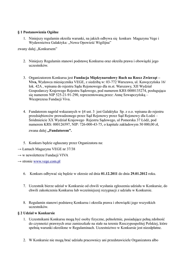 § 1 Postanowienia Ogólne 1. Niniejszy regulamin określa warunki, na jakich odbywa się konkurs Magazynu Vege i Wydawnictwa Galaktyka: „Nowa Opowieść Wigilijna” zwany dalej „Konkursem” 2. Niniejszy Regulamin stanowi podstawę Konkursu oraz określa prawa i obowiązki jego uczestników. 3. Organizatorem Konkursu jest Fundacja Międzynarodowy Ruch na Rzecz Zwierząt – Viva, Wydawca miesięcznika VEGE, z siedzibą w: 03-772 Warszawa, ul. Kawęczyńska 16/ lok. 42A , wpisana do rejestru Sądu Rejonowego dla m.st. Warszawy, XII Wydział Gospodarczy Krajowego Rejestru Sądowego, pod numerem KRS 0000135274, posługująca się numerem NIP 525-21-91-290, reprezentowaną przez: Annę Szwapczyńską – Wiceprezesa Fundacji Viva. 4. Fundatorem nagród wskazanych w §4 ust. 3 jest Galaktyka Sp. z o.o. wpisana do rejestru przedsiębiorców prowadzonego przez Sąd Rejonowy przez Sąd Rejonowy dla Łodzi – Śródmieście XX Wydział Krajowego Rejestru Sądowego, ul Pomorska 37 Łódź, pod numerem KRS: 000126597, NIP: 726-000-43-75, o kapitale zakładowym 50 000,00 zł, zwana dalej „Fundatorem”. 5. Konkurs będzie ogłaszany przez Organizatora na: → Łamach Magazynu VEGE nr 37/38 → w newsletterze Fundacji VIVA → stronie www.vege.com.pl 6. Konkurs odbywać się będzie w okresie od dnia 01.12.2011 do dnia 29.01.2012 roku. 7. Uczestnik bierze udział w Konkursie od chwili wysłania zgłoszenia udziału w Konkursie, do chwili zakończenia Konkursu lub wcześniejszej rezygnacji z udziału w Konkursie. 8. Regulamin stanowi podstawę Konkursu i określa prawa i obowiązki jego wszystkich uczestników. § 2 Udział w Konkursie 1. Uczestnikami Konkursu mogą być osoby fizyczne, pełnoletnie, posiadające pełną zdolność do czynności prawnych oraz zamieszkałe na stałe na terenie Rzeczypospolitej Polskiej, które spełnią warunki określone w Regulaminach. Uczestnictwo w Konkursie jest nieodpłatne. 2. W Konkursie nie mogą brać udziału pracownicy ani przedstawiciele Organizatora albo Fundatora jak i inne osoby biorące udział w przygotowaniu i prowadzeniu Konkursu oraz członkowie ich najbliższej rodziny (tj. wstępni, zstępni, rodzeństwo, małżonkowie, rodzice małżonków, osoby pozostające w stosunku przysposobienia oraz we wspólnym pożyciu). 3. Przystąpienie do Konkursu w sposób określony w § 3 ust. 2 Regulaminu jest równoznaczne z akceptacją przez uczestnika Regulaminów w całości. Uczestnik zobowiązuje się do przestrzegania określonych w nich zasad, jak również potwierdza, iż spełnia wszystkie warunki, które uprawniają go do udziału w Konkursie. 4. Z zastrzeżeniem postanowień Regulaminów uczestnictwa w Konkursie, jak i praw i obowiązków z nimi związanych, w tym także prawa do żądania wydania nagrody, nie można przenosić na inne osoby. 5. Dane osobowe uczestników Konkursu będą przetwarzane, zgodnie z warunkami określonymi w ustawie z dnia 29 sierpnia 1997 r. o ochronie danych osobowych (tekst jednolity: Dz. U. z 2002 r., Nr 101 poz. 926 ze zm.) wyłącznie w celu przeprowadzenia Konkursu, wyłonienia jego zwycięzców i przyznania im nagród przewidzianych niniejszym Regulaminem, i zostaną usunięte niezwłocznie po upływie terminu na składanie reklamacji co do przebiegu Konkursu. Administratorem danych osobowych jest Organizator. Podanie danych osobowych jest dobrowolne, jednak ich brak uniemożliwia przyznanie nagrody konkursowej. Uczestnikowi Konkursu przysługuje prawo wglądu do swoich danych osobowych i ich poprawiania. Organizator zastrzega, że dane osobowe i zdjęcia zwycięzców Konkursu mogą zostać opublikowane w ramach ogłoszenia wyników Konkursu w serwisie internetowym http://www.vege.com.pl oraz na łamach Magazynu VEGE § 3 Przebieg Konkursu 1. Warunkiem udziału w Konkursie jest spełnienie wymagań, określonych w §2 Regulaminu oraz zgłoszenie swojego udziału w Konkursie zgodnie z zasadami niniejszego paragrafu. 2. Zadaniem uczestnika Konkursu jest: Napisanie historii o swoim adoptowanym zwierzęciu i przesałnie go wraz ze zdjęciem swoimi i zwierzęcia na adres mailowy Redakcji Magazynu VEGE ([email protected]) do dnia 10 stycznia 2012 roku. 3. Zgłoszenie konkursowe należy wysyłać tak, aby wpłynęło do Organizatora w terminie przyjmowania zgłoszeń, o którym mowa w §1 ust. 6. Zgłoszenia, które wpłyną do Organizatora po terminie określonym powyżej, nie będą brały udziału w Konkursie. 4. Po przesłaniu zgłoszenia konkursowego uczestnik nie może dokonywać w nim żadnych zmian. 5. Każdy z uczestników może nadesłać jedno zgłoszenie konkursowe. 6. Nad prawidłowością przebiegu Konkursu czuwać będzie jury, złożone z przedstawicieli Organizatora i Fundatora. § 4 Zwycięzcy i nagrody w Konkursie 1. Po zakończeniu okresu przyjmowania zgłoszeń, w dniu 10.01.2012 roku jury konkursowe ogłosi listę zwycięzców Konkursu. Liczba zwycięzców Konkursu to 10 osób. 2. Jeden uczestnik może otrzymać jedną nagrodę w Konkursie. 3. Nagrodami w Konkursie są: Książki autorstwa Jacka Gałuszko „Aria Równaj”. 4. W terminie do 7 dni roboczych od zakończenia Konkursu Organizator powiadomi zwycięzców konkursu o prawie do nagrody, z wykorzystaniem numeru telefonu kontaktowego lub adresu e-mail który został podany w zgłoszeniu konkursowym. 5. W przypadku bezskutecznej dwukrotnej próby poinformowania zwycięzcy o jego wygranej, prawo do nagrody wygasa, a jury wyłoni kolejnego zwycięzcę nagrody głównej spośród uczestników Konkursu. 6. Zwycięzcy zostaną powiadomieni o terminie wysłania nagród za pośrednictwem Poczty Polskiej lub innej firmy specjalizującej się w dostarczaniu przesyłek poleconych lub o możliwości samodzielnego odbioru nagrody w siedzibie Organizatora. 7. Jeżeli osoba uprawniona do nagrody nie spełniła któregokolwiek z warunków określonych w § 2, 3 i 4 Regulaminu bądź nie skontaktuje się w terminie 14 dni od wysłania przez Organizator