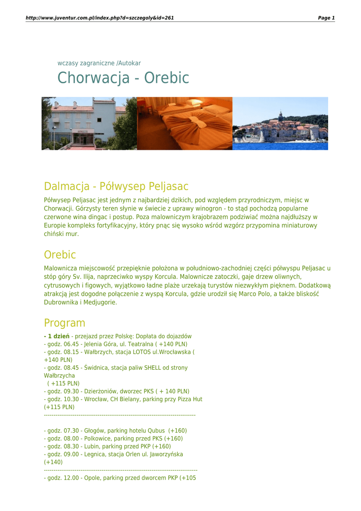 http://www.juventur.com.pl/index.php?d=szczegoly&id=261 Page 1 wczasy zagraniczne /Autokar Chorwacja - Orebic Dalmacja - Półwysep Peljasac Półwysep Peljasac jest jednym z najbardziej dzikich, pod względem przyrodniczym, miejsc w Chorwacji. Górzysty teren słynie w świecie z uprawy winogron - to stąd pochodzą popularne czerwone wina dingac i postup. Poza malowniczym krajobrazem podziwiać można najdłuższy w Europie kompleks fortyfikacyjny, który pnąc się wysoko wśród wzgórz przypomina miniaturowy chiński mur. Orebic Malownicza miejscowość przepięknie położona w południowo-zachodniej części półwyspu Peljasac u stóp góry Sv. Ilija, naprzeciwko wyspy Korcula. Malownicze zatoczki, gaje drzew oliwnych, cytrusowych i figowych, wyjątkowo ładne plaże urzekają turystów niezwykłym pięknem. Dodatkową atrakcją jest dogodne połączenie z wyspą Korcula, gdzie urodził się Marco Polo, a także bliskość Dubrownika i Medjugorie. Program - 1 dzień - przejazd przez Polskę: Dopłata do dojazdów - godz. 06.45 - Jelenia Góra, ul. Teatralna ( +140 PLN) - godz. 08.15 - Wałbrzych, stacja LOTOS ul.Wrocławska ( +140 PLN) - godz. 08.45 - Świdnica, stacja paliw SHELL od strony Wałbrzycha ( +115 PLN) - godz. 09.30 - Dzierżoniów, dworzec PKS ( + 140 PLN) - godz. 10.30 - Wrocław, CH Bielany, parking przy Pizza Hut (+115 PLN) ------------------------------------------------------------------------------- godz. 07.30 - Głogów, parking hotelu Qubus (+160) - godz. 08.00 - Polkowice, parking przed PKS (+160) - godz. 08.30 - Lubin, parking przed PKP (+160) - godz. 09.00 - Legnica, stacja Orlen ul. Jaworzyńska (+140) -------------------------------------------------------------------------------- godz. 12.00 - Opole, parking przed dworcem PKP (+105 http://www.juventur.com.pl/index.php?d=szczegoly&id=261 Page 2 PLN) - godz. 13.15 - Gliwice, stacja Shell ul. Rybnicka - godz. 14.00 - Katowice, dworzec PKS ul p.Skargi - godz. 14.30 - Tychy, stacja Bliska przy trasie - godz. 15.15 - Bielsko-Biała, dworzec PKS dolny poziom - godz. 16.00 - Cieszyn, stacja ARGE przy trasie - 2 dzień - przyjazd do Orebica w godzinach przedpołudniowych, zakwaterowanie, kolacja, nocleg - 2 dzień + 9 dni - pobyt w Orebicu, plażowanie, wypoczynek, wycieczki fakultatywne - 11 dzień - śniadanie, wyjazd do kraju w godzinach południowych - 12 dzień - przyjazd do Polski Świadczenia - 9 noclegów (10 dni) - 9 śniadań (stół szwedzki) i 9 kolacji (serwowane wybór z dwóch zestawów) - opieka rezydenta - ubezpieczenie KL do 15.000 Euro i NW do 7.000 PLN Zakwaterowanie - Hotel Komodor** Kompleks o standardzie turystycznym, prosto wyposażony, otoczony zielenią, usytułowany nad samym morzem w części Orebica o nazwie Perna (3 km od granic Orebica), własna plaża żwirowo-betonowa, częściowo trawiasta o długości 700 m z łagodnym zejściem do morza. Pokoje 2-osobowe z możliwością dostawki, łazienka. W hotelu restauracja, bar, tawerna, sala TV, grill bar na plaży z muzyką na żywo, supermarket, boisko do koszykówki i siatkówki plażowej. Transport - Autokar - autokar lux (klimatyzacja, WC, barek) - przejazd przez Czechy, Austrię, Słowenię, Bośnię i Hercegowinę Autokar docelowy od Wrocławia lub Katowic. Dojazd bus lub autokar. Wycieczki fakultatywne Na życzenie i koszt klienta, organizowane w trakcie pobytu: - wycieczka do Dubrownika (ok. 25 Euro) - Mljet - ( ok. 20 euro) - wycieczka do Medjugorje, Mostaru i Wodospady Kravice (ok. 35 Euro) - Medjugore ( ok. 30 Euro) nr grupy termin miejsce w pokoju 2-osobowym ORB-01/17 04.06-15.06.17 1 345,- ZAREZERWUJ ORB-02/17 13.06-24.06.17 1 345,- ZAREZERWUJ http://www.juventur.com.pl/index.php?d=szczegoly&id=261 Page 3 ORB-03/17 22.06-03.07.17 1 405,- ZAREZERWUJ ORB-04/17 01.07-12.07.17 1 445,- ZAREZERWUJ ORB-05/17 10.07-21.07.17 1 445,- ZAREZERWUJ ORB-06/17 19.07-30.07.17 1 445,- ZAREZERWUJ ORB-07/17 28.07-08.08.17 1 445,- ZAREZERWUJ ORB-08/17 06.08-17.08.17 1 445,- ZAREZERWUJ ORB-09/17 15.08-26.08.17 1 445,- ZAREZERWUJ ORB-10/17 24.08-04.09.17 1 405,- ZAREZERWUJ ORB-11/17 02.09-13.09.17 1 345,- ZAREZERWUJ ORB-12/17 11.09-22.09.17 1 325,- ZAREZERWUJ 1. Opłata miejscowa - 75 zł/os./turnus - płatna w biurze, dziecko do lat 12 bez opłat. 2. Turystyczny Fundusz Gwarancyjny - 10 PLN/OS./POBYT 2. Dopłata do jedynki - 235 PLN. 3. Dziecko do lat 12 jako trzecie w pokoju - opłata stała 550 pln IMPREZA ORGANIZOWANA WSPÓLNIE Z ZAPRZYJAŹNIONYM BIUREM PODRÓŻY