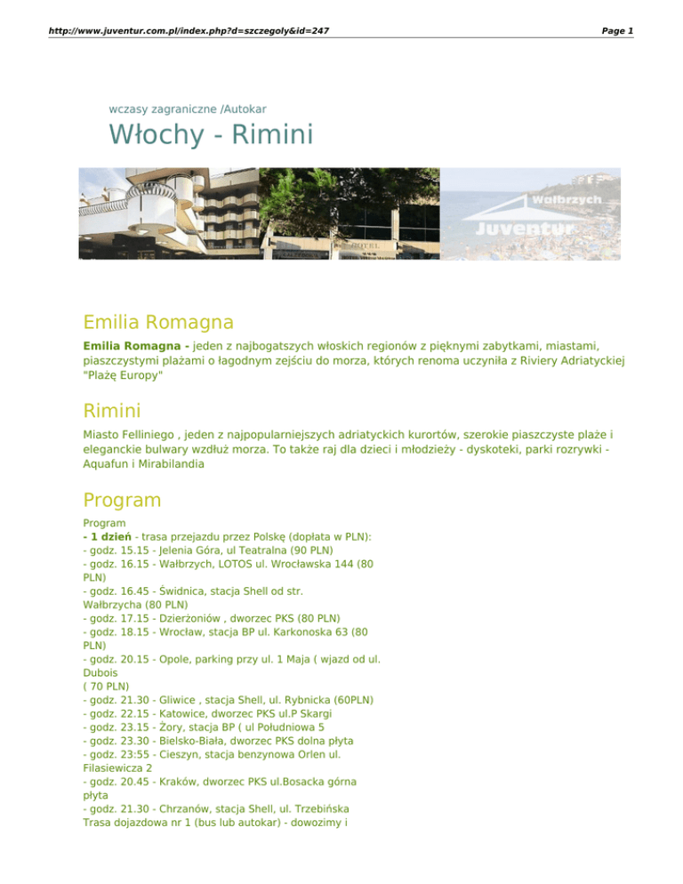 http://www.juventur.com.pl/index.php?d=szczegoly&id=247 Page 1 wczasy zagraniczne /Autokar Włochy - Rimini Emilia Romagna Emilia Romagna - jeden z najbogatszych włoskich regionów z pięknymi zabytkami, miastami, piaszczystymi plażami o łagodnym zejściu do morza, których renoma uczyniła z Riviery Adriatyckiej "Plażę Europy" Rimini Miasto Felliniego , jeden z najpopularniejszych adriatyckich kurortów, szerokie piaszczyste plaże i eleganckie bulwary wzdłuż morza. To także raj dla dzieci i młodzieży - dyskoteki, parki rozrywki Aquafun i Mirabilandia Program Program - 1 dzień - trasa przejazdu przez Polskę (dopłata w PLN): - godz. 15.15 - Jelenia Góra, ul Teatralna (90 PLN) - godz. 16.15 - Wałbrzych, LOTOS ul. Wrocławska 144 (80 PLN) - godz. 16.45 - Świdnica, stacja Shell od str. Wałbrzycha (80 PLN) - godz. 17.15 - Dzierżoniów , dworzec PKS (80 PLN) - godz. 18.15 - Wrocław, stacja BP ul. Karkonoska 63 (80 PLN) - godz. 20.15 - Opole, parking przy ul. 1 Maja ( wjazd od ul. Dubois ( 70 PLN) - godz. 21.30 - Gliwice , stacja Shell, ul. Rybnicka (60PLN) - godz. 22.15 - Katowice, dworzec PKS ul.P Skargi - godz. 23.15 - Żory, stacja BP ( ul Południowa 5 - godz. 23.30 - Bielsko-Biała, dworzec PKS dolna płyta - godz. 23:55 - Cieszyn, stacja benzynowa Orlen ul. Filasiewicza 2 - godz. 20.45 - Kraków, dworzec PKS ul.Bosacka górna płyta - godz. 21.30 - Chrzanów, stacja Shell, ul. Trzebińska Trasa dojazdowa nr 1 (bus lub autokar) - dowozimy i http://www.juventur.com.pl/index.php?d=szczegoly&id=247 odwozimy: - godz. 15.10 - Głogów, dworzec PKS (100 PLN) - godz. 15.50 - Polkowice, dworzec PKS ul. Młyńska (90 PLN) - godz. 16.20 - Lubin, dworzec PKP (90 PLN) - godz. 17.00 - Legnica, dworzec PKS (90 PLN) - 2 dzień + (9) dni - przyjazd w godzinach popołudniowych, kolacja, zakwaterowanie, obiad, kolacja, nocleg - 11 dzień - śniadanie, obiad, wyjazd do kraju w godzinach popołudniowch po ok. 2-godzinnym postoju autokaru - 12 dzień - przyjazd do Polski Świadczenia - 9 noclegów - pełne wyżywienie - śniadania - bufet, obiady, kolacje- wybór z dwóch zestawów (bufet sałatkowy do kolacji - napoje dodatkowo płatne) plus suchy prowiant na drogę powrotną - opieka polskiej obsługi - ubezpieczenie KL (do 10.000 Euro) i NW (do 7.000 PLN) - ubezpieczenie od następstw chorób przewlekłych - opłata klimatyczna Cena nie obejmuje: - ubezpieczenia od kosztów rezygnacji z imprezy (od 60pln/os./turnus) - ubezpieczenie od kosztów przerwania imprezy (od 34 pln/os./turnus) - dopłaty do połączeń antenowych - dopłaty do pok. 1-osob. 200 pln ( hotel Meeting, Venezia, Villa Maria) - dopłata za pokój 2-osobowy do pojedynczego wykorzystania: 450 pln( hotel Meeting, Venezia, Corallo) - serwisu plażowego - dopłaty do lodówki 90 pln - napojów do obiadów i kolacji Zakwaterowanie - hotel Meeting, hotel Venezia, hotel Corallo, hotel Villa Maria Hotel Meeting *** - (Bellaria-Igea Marina), położony w centrum miesteczka, 250 m od pieszczystej plaży, pokoje 2,3,4-osobowe z łazienkami typu włoskiego (w pokojach 4-osob. - łóżko piętrowe), TVSat, telefon, sejf za kaucją. Hotel Venezia *** - (San Mauro Mare), położony w pobliżu rynku, 200 m do piaszczystej plaży, pokoje 1,2,3,4-osob. z łazienką (w pokojach 4-osob. - jedno łóżko piętrowe), TVSat, telefon, sejf. Hotel Corallo *** - Cesenatico Położenie: W odległości 900 m od centrum Cesenatico, ok. 100 m od piaszczystej plaży. Wyposażenie: Funkcjonalnie wyposażony 4-piętrowy hotel. Do Page 2 http://www.juventur.com.pl/index.php?d=szczegoly&id=247 Page 3 dyspozycji gości hol z recepcją, klimatyzowana sala restauracyjna, winda, sala telewizyjna z TV-satelitarną (programy polskie), piłkarzyki, taras zewnętrzny, niewielki parking przy hotelu. Bezpłatny, bezprzewodowy dostęp do internetu w holu hotelu (WiFi). Pokoje: 2, 3, 4-osobowe z łazienką z kabiną prysznicową, balkonem, telewizorem, telefonem, sejfem (za kaucją) i suszarką do włosów. W pokojach 4-osobowych jedno łóżko piętrowe. Obsługa: wyłącznie polska. HOTEL VILLA MARIA ***- Cesenatico Położenie: W odległości 300 m od centrum Cesenatico, ok. 100 m od piaszczystej plaży. Wyposażenie: Funkcjonalnie wyposażony 3-piętrowy hotel. Do dyspozycji gości hol z recepcją, klimatyzowana sala restauracyjna, winda, klimatyzowana sala telewizyjna z TVsatelitarną (programy polskie), piłkarzyki, taras zewnętrzny, niewielki parking przy hotelu. Bezpłatny, bezprzewodowy dostęp do internetu w holu hotelu (WiFi). Pokoje: 1, 2, 3, 4-osobowe z centralnie sterowaną klimatyzacją (czynną w turnusach F-P), łazienką z kabiną prysznicową, telewizorem, telefonem, sejfem (za kaucją) i suszarką do włosów. Niektóre pokoje z balkonem (za dopłatą). W pokojach 4osobowych jedno łóżko piętrowe. Obsługa: wyłącznie polska. Uwaga: Klimatyzacja w hotelach czynna w terminie od 10.06 do 10.09.2015 Transport - Autokar - autokar LUX (klimatyzacja, WC, barek, video) - przejazd przez Czechy, Austri - płatne antenki realizowane przy minimum 6 osobach Wycieczki fakultatywne Na życzenie i koszt klienta, organizowane w trakcie pobytu: - wycieczka do Rzymu (ok. 67 Euro) - wycieczka do San Marino (ok. 20 Euro) - rejs statkiem z degustacją ryb i wina (ok. 22 Euro) - Mirabilandia - park rozrywki (ok. 40 Euro) - Aquafan - park wodny (ok. 36 Euro) - Wenecja (autokarem + statkiem) (ok. 67 Euro) - Oltremare ( pokaz delfinów i sokołów) -statkiem (ok 26 Euro) - Florencja + Bolonia - (72 Euro) - Asyż + Cascia + Loreto ( 67 Euro) nr grupy termin m-ce w pokoju 2-os. trzecia os. w pokoju czwarta os. w pokoju dziecko 713 lat na dostawce* ITB-01/17 09.06-20.06.17 1 669,- 1 459,- 1 359,- 1 159,- ZAREZERWUJ http://www.juventur.com.pl/index.php?d=szczegoly&id=247 Page 4 ITB-02/17 18.06-29.06.17 1 789,- 1 579,- 1 459,- 1 259,- ZAREZERWUJ ITB-03/17 27.06-08.07.17 1 919,- 1 649,- 1 479,- 1 279,- ZAREZERWUJ ITB-04/17 06.07-17.07.17 1 999,- 1 689,- 1 579,- 1 379,- ZA