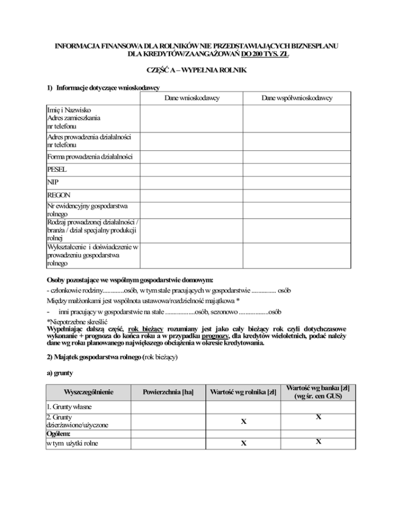 INFORMACJA FINANSOWA DLA ROLNIKÓW NIE PRZEDSTAWIAJĄCYCH BIZNESPLANU DLA KREDYTÓW/ZAANGAŻOWAŃ DO 200 TYS. ZŁ CZĘŚĆ A – WYPEŁNIA ROLNIK 1) Informacje dotyczące wnioskodawcy Dane współwnioskodawcy Dane wnioskodawcy Imię i Nazwisko Adres zamieszkania nr telefonu Adres prowadzenia działalności nr telefonu Forma prowadzenia działalności PESEL NIP REGON Nr ewidencyjny gospodarstwa rolnego Rodzaj prowadzonej działalności / branża / dział specjalny produkcji rolnej Wykształcenie i doświadczenie w prowadzeniu gospodarstwa rolnego Osoby pozostające we wspólnym gospodarstwie domowym: - członkowie rodziny.............osób, w tym stale pracujących w gospodarstwie ............... osób Między małżonkami jest wspólnota ustawowa/rozdzielność majątkowa * inni pracujący w gospodarstwie na stałe ..................osób, sezonowo ..................osób *Niepotrzebne skreślić Wypełniając dalszą część, rok bieżący rozumiany jest jako cały bieżący rok czyli dotychczasowe wykonanie + prognoza do końca roku a w przypadku prognozy, dla kredytów wieloletnich, podać należy dane wg roku planowanego największego obciążenia w okresie kredytowania. - 2) Majątek gospodarstwa rolnego (rok bieżący) a) grunty Wyszczególnienie 1. Grunty własne 2. Grunty dzierżawione/użyczone Ogółem: w tym użytki rolne Powierzchnia [ha] Wartość wg rolnika [zł] X X Wartość wg banku [zł] (wg śr. cen GUS) X X b) budynki i maszyny Wyszczególnienie Wartość w zł (podać wg czego określono wartość np. wg polisy, rzeczoznawcy itp.) Budynki w tym mieszkalny: Maszyny i urządzenia w tym samochód/-chody osobowe: c) inwentarz żywy Wyszczególnienie ( wymienić zwierzęta wg rodzajów) Rok bieżący Ilość (w szt.) Wartość w zł Prognoza na okres kredytowania Ilość (w szt.) Wartość w zł Stado podstawowe: Stado obrotowe: X Razem d) pozostały majątek ( wymienić rodzaj i wartość) Wyszczególnienie Należności Zapasy Produkcja roślinna w toku Gotówka Lokaty Inne Wartość w zł +ewentualny komentarz 3) Planowane przedsięwzięcie inwestycyjne Dla kredytów unijnych Elementy inwestycji Koszt całkowity Środki własne inwestycji brutto/netto1 RAZEM Udział % 1 Kredyt/Kredyt Koszty unijny kwalifikowane Dotacja 100% Niepotrzebne skreślić, wartość netto dla płatników podatku VAT, wartość brutto dla pozostałych podmiotów. Termin realizacji 4) Prowadzona produkcja a) Produkcja zwierzęca Wyszczególnienie Rok ubiegły Rok bieżący Wartość /zł/ ilość A. Sprzedaż produkcji zwierzęcej (wymienić poniżej) RAZEM SPRZEDAŻ B. Koszty produkcji zwierzęcej Zakup zwierząt ……………………. Zakup pasz Koszty weterynaryjne Pozostałe koszty RAZEM KOSZTY Dochód z produkcji zwierzęcej (A - B) b) Produkcja roślinna Wyszczególnienie x x x x Wartość /zł/ x x x Rok bieżący ilość cena A. Struktura zasiewów i sprzedaż produkcji roślinnej (wymienić poniżej) RAZEM SPRZEDAŻ B. Koszty produkcji roślinnej Zakup nasion Zakup nawozów mineralnych Zakup środków ochrony roślin Pozostałe koszty RAZEM KOSZTY Dochód z produkcji roślinnej (A - B) **Wartość 0 jeśli produkcja na paszę Wartość /zł/ x Rok ubiegły Wartość** /zł/ cena Prognoza na okres kredytowania x x x x x x x x x x Prognoza na okres kredytowania Wartość ** /zł/ Wartość ** /zł/ 5) Pozostałe przychody: Rodzaj Rok ubiegły /zł/ Rok bieżący /zł/ Prognoza na okres kredytowania /zł/ Rok ubiegły /zł/ Rok bieżący /zł/ Prognoza na okres kredytowania /zł/ Dopłaty bezpośrednie Przychody spoza gospodarstwa Inne ……………………… RAZEM 6) Pozostałe koszty Rodzaj Koszty pośrednie Koszty utrzymania rodziny Koszty działalności innej niż rolnicza Odsetki od kredytów Inne ……………………… RAZEM Oświadczam(y), iż: 1) w okresie kredytowania utrzymany zostanie trend działalności określony w powyższym dokumencie jako prognoza. 2) gospodarstwo spełnia/nie spełnia* kryteria ubiegania się o dopłaty bezpośrednie w tym dobrej kultury rolnej, ochrony środowiska oraz identyfikacji i rejestracji zwierząt. *Niepotrzebne skreślić Oświadczam/y pod rygorem odpowiedzialności przewidzianej w art. 297 Kodeksu karnego (Dz. U. 1997 r. Nr 88, poz. 553, z późn. zm.), że informacje podane w niniejszym dokumencie są prawdziwe. , miejscowość, data pieczęć i podpis Wnioskodawcy/-ów