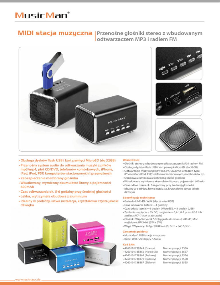 MIDI stacja muzyczna Przenośne głośniki stereo z wbudowanym odtwarzaczem MP3 i radiem FM • Obsługa dysków flash USB i kart pamięci MicroSD (do 32GB) • Przenośny system audio do odtwarzania muzyki z plików mp3/mp4, płyt CD/DVD, telefonów komórkowych, iPhone, iPad, iPod, PSP, komputerów stacjonarnych i przenośnych • Zabezpieczenie membrany głośnika • Wbudowany, wymienny akumulator litowy o pojemności 600mAh • Czas odtwarzania ok. 5-6 godziny przy średniej głośności • Lekka, wytrzymała obudowa z aluminium • Idealny w podróży, łatwa instalacja, kryształowo czysta jakość dźwięku Właściwości: • Głośniki stereo z wbudowanym odtwarzaczem MP3 i radiem FM • Obsługa dysków flash USB i kart pamięci MicroSD (do 32GB) • Odtwarzanie muzyki z plików mp3/4, CD/DVD, urządzeń typu iPhone/iPad/iPod, PSP, telefonów komórkowych, notebooków itp. • Obudowa aluminiowa z ochronną kratką głośnika • Wbudowany, wymienny akumulator litowy o pojemności 600mAh • Czas odtwarzania ok. 5-6 godziny przy średniej głośności • Idealny w podróży, łatwa instalacja, kryształowo czysta jakość dźwięku Specyfikacje techniczne: • Gniazdo LINE–IN / AUX (złącze mini USB) • Czas ładowania baterii: ~ 4 godziny • Czas odtwarzania: ~ 6 godzin (MicroSD), ~ 5 godzin (USB) • Zasilanie: napięcie = 5V DC; natężenie = 0,4-1,0 A przez USB lub zasilacz AC* (*brak w zestawie) • Głośniki: Współczynnik S/N (sygnału do szumu) ≥80 dB; Moc wyjściowa: RMS 6W (3W + 3W) • Waga / Wymiary: 140g / (D) 8cm x (S) 5cm x (W) 5,3cm Zawartość pakietu: • MusicMan® MIDI stacja muzyczna • Kabel USB / Zasilający / Audio Kod EAN: • 4260101738349 (Czarny) • 4260101738356 (Niebieski) • 4260101738363 (Srebrny) • 4260101738370 (Różowy) • 4260101738387 (Zielony) www.technaxx.de Numer pozycji 3556 Numer pozycji 3557 Numer pozycji 3554 Numer pozycji 3558 Numer pozycji 3555