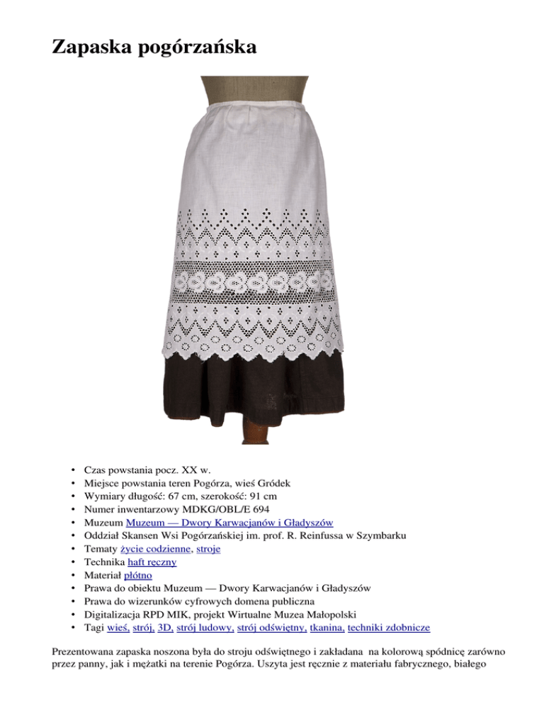 Zapaska pogórzańska • • • • • • • • • • • • • Czas powstania pocz. XX w. Miejsce powstania teren Pogórza, wieś Gródek Wymiary długość: 67 cm, szerokość: 91 cm Numer inwentarzowy MDKG/OBL/E 694 Muzeum Muzeum — Dwory Karwacjanów i Gładyszów Oddział Skansen Wsi Pogórzańskiej im. prof. R. Reinfussa w Szymbarku Tematy życie codzienne, stroje Technika haft ręczny Materiał płótno Prawa do obiektu Muzeum — Dwory Karwacjanów i Gładyszów Prawa do wizerunków cyfrowych domena publiczna Digitalizacja RPD MIK, projekt Wirtualne Muzea Małopolski Tagi wieś, strój, 3D, strój ludowy, strój odświętny, tkanina, techniki zdobnicze Prezentowana zapaska noszona była do stroju odświętnego i zakładana na kolorową spódnicę zarówno przez panny, jak i mężatki na terenie Pogórza. Uszyta jest ręcznie z materiału fabrycznego, białego płócienka, ręcznie haftowana. U dołu zapaski znajduje się bogaty haft wykonany białą nicią bawełnianą, ściegiem płaskim, atłaskiem, łańcuszkiem. Dziurki obhaftowane są wałeczkiem. Brzeg stanowią ząbki dziergane. Zapaska wiązana jest na sznureczkitroczki. Tego rodzaju ozdobne zapaski kobiety haftowały najczęściej same, lecz bywały także hafciarki wiejskie, które trudniły się tym zawodowo. Opisaną zapaskę wyhaftowała matka ostatniej właścicielki — Katarzyny Grucy — przed I wojną światową, a wykonano ją w miejscowości Gródek koło Grybowa. Opracowanie: Anna NiemczyńskaSzurek (Muzeum — Dwory Karwacjanów i Gładyszów), © wszystkie prawa zastrzeżone Strój pogórzański Prezentowane w Skansenie Wsi Pogórzańskiej w Szymbarku elementy stroju kobiecego pochodzą z terenu Pogórza, z jego zachodniej części, okolic Gorlic. Od wieków Pogórze słynęło z wyrobu płócien lnianych i sukna, które były przedmiotem handlu. Wyrobem płócien zajmowali się wyspecjalizowani tkacze, zwani knopami. Pierwotnie z tych materiałów sporządzana była odzież zarówno odświętna, jak i codzienna. Pod koniec XIX wieku strój kobiecy zaczął się zmieniać, zaczęto częściej stosować łatwo dostępne materiały fabryczne. Na przełomie XIX i XX wieku strój pogórzański wyszedł z powszechnego użytku, co było spowodowane zmianami warunków życia mieszkańców wsi związanymi z rozwojem przemysłu naftowego oraz emigracją zarobkową. Przedstawione elementy stroju pogórzańskiego (chusta czepcowa, „budrysówka" i zapaska) są uszyte z materiałów fabrycznych, ręcznie haftowane przez kobiety pogórzańskie. Opracowanie: Anna NiemczyńskaSzurek (Muzeum — Dwory Karwacjanów i Gładyszów), © wszystkie prawa zastrzeżone Zobacz: Zapaska pogórzańska Chusta czepcowa pogórzańska Chusta pogórzańska „ budrysówka ” Tagi: Muzeum Dwory Karwacjanów i Gładyszów w Gorlicach, strój, Skansen Wsi Pogórzańskiej im. R. Reinfussa w Szymbarku, strój ludowy