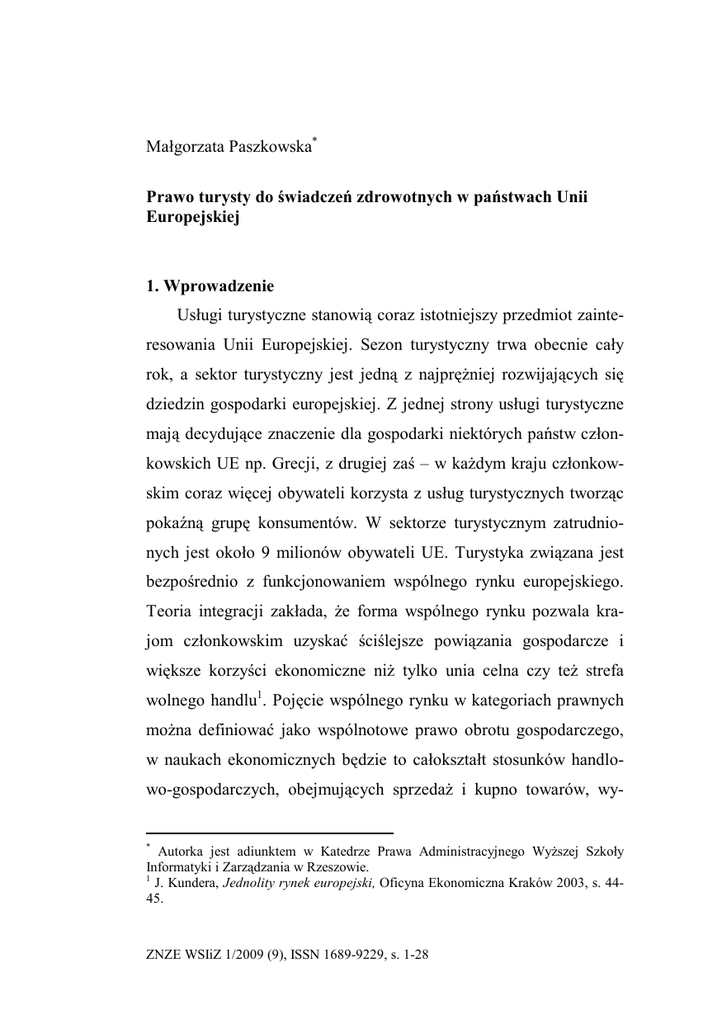 Małgorzata Paszkowska* Prawo turysty do świadczeń zdrowotnych