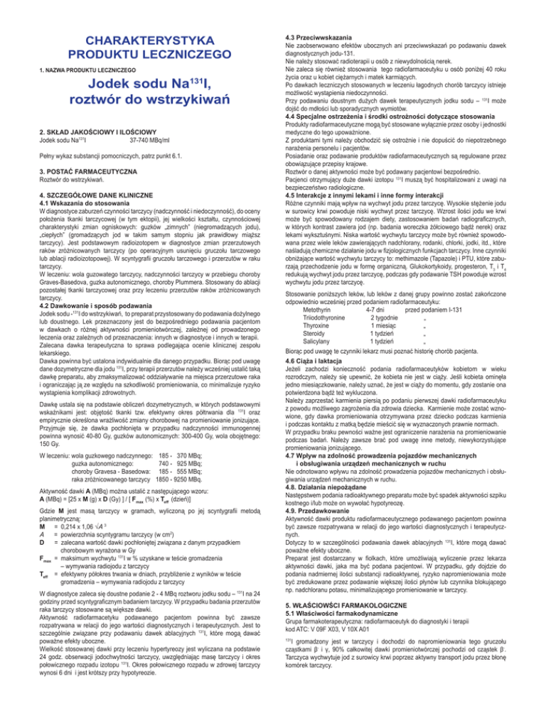 CHARAKTERYSTYKA PRODUKTU LECZNICZEGO 1. NAZWA PRODUKTU LECZNICZEGO Jodek sodu Na131I, roztwór do wstrzykiwań 2. SKŁAD JAKOŚCIOWY I ILOŚCIOWY Jodek sodu Na131I 37-740 MBq/ml Pełny wykaz substancji pomocniczych, patrz punkt 6.1. 3. POSTAĆ FARMACEUTYCZNA Roztwór do wstrzykiwań. 4. SZCZEGÓŁOWE DANE KLINICZNE 4.1 Wskazania do stosowania W diagnostyce zaburzeń czynności tarczycy (nadczynność i niedoczynność), do oceny położenia tkanki tarczycowej (w tym ektopii), jej wielkości kształtu, czynnościowej charakterystyki zmian ogniskowych: guzków „zimnych” (niegromadzących jodu), „ciepłych” (gromadzących jod w takim samym stopniu jak prawidłowy miąższ tarczycy). Jest podstawowym radioizotopem w diagnostyce zmian przerzutowych raków zróżnicowanych tarczycy (po operacyjnym usunięciu gruczołu tarczowego lub ablacji radioizotopowej). W scyntygrafii gruczołu tarczowego i przerzutów w raku tarczycy. W leczeniu: wola guzowatego tarczycy, nadczynności tarczycy w przebiegu choroby Graves-Basedova, guzka autonomicznego, choroby Plummera. Stosowany do ablacji pozostałej tkanki tarczycowej oraz przy leczeniu przerzutów raków zróżnicowanych tarczycy. 4.2 Dawkowanie i sposób podawania Jodek sodu -131I do wstrzykiwań, to preparat przystosowany do podawania dożylnego lub doustnego. Lek przeznaczony jest do bezpośredniego podawania pacjentom w dawkach o różnej aktywności promieniotwórczej, zależnej od prowadzonego leczenia oraz zależnych od przeznaczenia: innych w diagnostyce i innych w terapii. Zalecana dawka terapeutyczna to sprawa podlegająca ocenie klinicznej zespołu lekarskiego. Dawka powinna być ustalona indywidualnie dla danego przypadku. Biorąc pod uwagę dane dozymetryczne dla jodu 131I, przy terapii przerzutów należy wcześniej ustalić taką dawkę preparatu, aby zmaksymalizować oddziaływanie na miejsca przerzutowe raka i ograniczając ją ze względu na szkodliwość promieniowania, co minimalizuje ryzyko wystąpienia komplikacji zdrowotnych. Dawkę ustala się na podstawie obliczeń dozymetrycznych, w których podstawowymi wskaźnikami jest: objętość tkanki tzw. efektywny okres półtrwania dla 131I oraz empirycznie określona wrażliwość zmiany chorobowej na promieniowanie jonizujące. Przyjmuje się, że dawka pochłonięta w przypadku nadczynności immunogennej powinna wynosić 40-80 Gy, guzków autonomicznych: 300-400 Gy, wola obojętnego: 150 Gy. W leczeniu: wola guzkowego nadczynnego: guzka autonomicznego: choroby Gravesa - Basedowa: raka zróżnicowanego tarczycy 185 - 370 MBq; 740 - 925 MBq; 185 - 555 MBq; 1850 - 9250 MBq. Aktywność dawki A (MBq) można ustalić z następującego wzoru: A (MBq) = [25 x M (g) x D (Gy) ] / [ Fmax (%) x Teff (dzień)] Gdzie M jest masą tarczycy w gramach, wyliczoną po jej scyntygrafii metodą planimetryczną: M = 0,214 x 1,06 √A 3 A = powierzchnia scyntygramu tarczycy (w cm2) D = zalecana wartość dawki pochłoniętej związana z danym przypadkiem chorobowym wyrażona w Gy Fmax = maksimum wychwytu 131I w % uzyskane w teście gromadzenia – wymywania radiojodu z tarczycy Teff = efektywny półokres trwania w dniach, przybliżenie z wyników w teście gromadzenia – wymywania radiojodu z tarczycy W diagnostyce zaleca się doustne podanie 2 - 4 MBq roztworu jodku sodu – 131I na 24 godziny przed scyntygraficznym badaniem tarczycy. W przypadku badania przerzutów raka tarczycy stosowane są większe dawki. Aktywność radiofarmacetyku podawanego pacjentom powinna być zawsze rozpatrywana w relacji do jego wartości diagnostycznych i terapeutycznych. Jest to szczególnie związane przy podawaniu dawek ablacyjnych 131I, które mogą dawać poważne efekty uboczne. Wielkość stosowanej dawki przy leczeniu hypertyreozy jest wyliczana na podstawie 24 godz. obserwacji jodochwytności tarczycy, uwzględniając masę tarczycy i okres połowicznego rozpadu izotopu 131I. Okres połowicznego rozpadu w zdrowej tarczycy wynosi 6 dni i jest krótszy przy hypotyreozie. 4.3 Przeciwwskazania Nie zaobserwowano efektów ubocznych ani przeciwwskazań po podawaniu dawek diagnostycznych jodu-131. Nie należy stosować radioterapii u osób z niewydolnością nerek. Nie zaleca się również stosowania tego radiofarmaceutyku u osób poniżej 40 roku życia oraz u kobiet ciężarnych i matek karmiących. Po dawkach leczniczych stosowanych w leczeniu łagodnych chorób tarczycy istnieje możliwość wystąpienia niedoczynności. Przy podawaniu doustnym dużych dawek terapeutycznych jodku sodu – 131I może dojść do mdłości lub sporadycznych wymiotów. 4.4 Specjalne ostrzeżenia i środki ostrożności dotyczące stosowania Produkty radiofarmaceutyczne mogą być stosowane wyłącznie przez osoby i jednostki medyczne do tego upoważnione. Z produktami tymi należy obchodzić się ostrożnie i nie dopuścić do niepotrzebnego narażenia personelu i pacjentów. Posiadanie oraz podawanie produktów radiofarmaceutycznych są regulowane przez obowiązujące przepisy krajowe. Roztwór o danej aktywności może być podawany pacjentowi bezpośrednio. Pacjenci otrzymujący duże dawki izotopu 131I muszą być hospitalizowani z uwagi na bezpieczeństwo radiologiczne. 4.5 Interakcje z innymi lekami i inne formy interakcji Różne czynniki mają wpływ na wychwyt jodu przez tarczycę. Wysokie stężenie jodu w surowicy krwi powoduje niski wychwyt przez tarczycę. Wzrost ilości jodu we krwi może być spowodowany rodzajem diety, zastosowaniem badań radiograficznych, w których kontrast zawiera jod (np. badania woreczka żółciowego bądź nerek) oraz lekami wyksztuśnymi. Niska wartość wychwytu tarczycy może być również spowodowana przez wiele leków zawierających nadchlorany, rodanki, chlorki, jodki, itd., które naśladują chemiczne działanie jodu w fizjologicznych funkcjach tarczycy. Inne czynniki obniżające wartość wychwytu tarczycy to: methimazole (Tapazole) i PTU, które zaburzają przechodzenie j