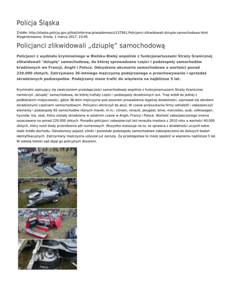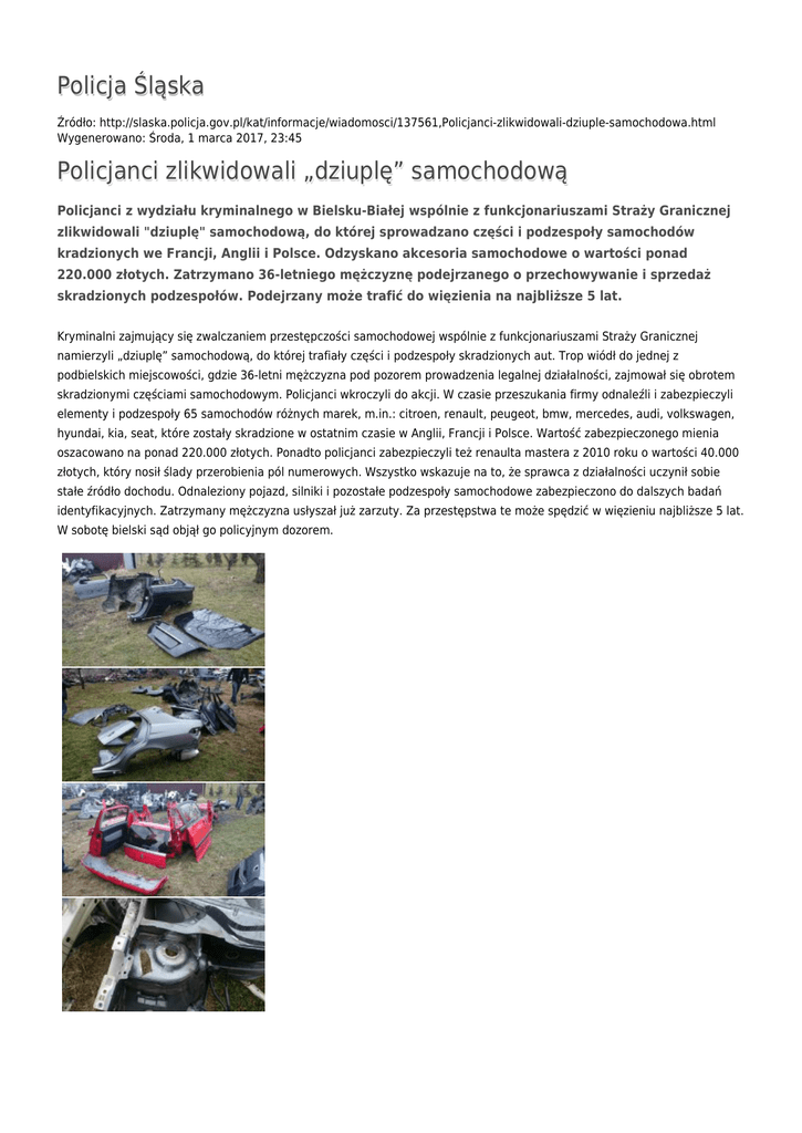 Policja Śląska Źródło: http://slaska.policja.gov.pl/kat/informacje/wiadomosci/137561,Policjanci-zlikwidowali-dziuple-samochodowa.html Wygenerowano: Środa, 1 marca 2017, 23:45 Policjanci zlikwidowali „dziuplę” samochodową Policjanci z wydziału kryminalnego w Bielsku-Białej wspólnie z funkcjonariuszami Straży Granicznej zlikwidowali "dziuplę" samochodową, do której sprowadzano części i podzespoły samochodów kradzionych we Francji, Anglii i Polsce. Odzyskano akcesoria samochodowe o wartości ponad 220.000 złotych. Zatrzymano 36-letniego mężczyznę podejrzanego o przechowywanie i sprzedaż skradzionych podzespołów. Podejrzany może trafić do więzienia na najbliższe 5 lat. Kryminalni zajmujący się zwalczaniem przestępczości samochodowej wspólnie z funkcjonariuszami Straży Granicznej namierzyli „dziuplę” samochodową, do której trafiały części i podzespoły skradzionych aut. Trop wiódł do jednej z podbielskich miejscowości, gdzie 36-letni mężczyzna pod pozorem prowadzenia legalnej działalności, zajmował się obrotem skradzionymi częściami samochodowym. Policjanci wkroczyli do akcji. W czasie przeszukania firmy odnaleźli i zabezpieczyli elementy i podzespoły 65 samochodów różnych marek, m.in.: citroen, renault, peugeot, bmw, mercedes, audi, volkswagen, hyundai, kia, seat, które zostały skradzione w ostatnim czasie w Anglii, Francji i Polsce. Wartość zabezpieczonego mienia oszacowano na ponad 220.000 złotych. Ponadto policjanci zabezpieczyli też renaulta mastera z 2010 roku o wartości 40.000 złotych, który nosił ślady przerobienia pól numerowych. Wszystko wskazuje na to, że sprawca z działalności uczynił sobie stałe źródło dochodu. Odnaleziony pojazd, silniki i pozostałe podzespoły samochodowe zabezpieczono do dalszych badań identyfikacyjnych. Zatrzymany mężczyzna usłyszał już zarzuty. Za przestępstwa te może spędzić w więzieniu najbliższe 5 lat. W sobotę bielski sąd objął go policyjnym dozorem. Ocena: 0/5 (0) Tweetnij