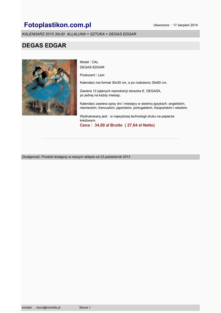Fotoplastikon.com.pl Utworzono : 17 sierpień 2014 KALENDARZ 2015 30x30 ALLALUNA > SZTUKA > DEGAS EDGAR DEGAS EDGAR Model : CAL DEGAS EDGAR Producent : Lem Kalendarz ma format 30x30 cm, a po rozłożeniu 30x60 cm. Zawiera 12 pięknych reprodukcji obrazów E. DEGASA, po jednej na każdy miesiąc. Kalendarz zawiera opisy dni i miesięcy w siedmiu językach: angielskim, niemieckim, francuskim, japońskim, portugalskim, hiszpańskim i włoskim. Wydrukowany jest�w najwyższej technologii druku na papierze kredowym. Cena : 34,00 zł Brutto ( 27,64 zł Netto) Dostępność: Produkt dostępny w naszym sklepie od 23 październik 2013 kontakt : - [email protected] Strona 1