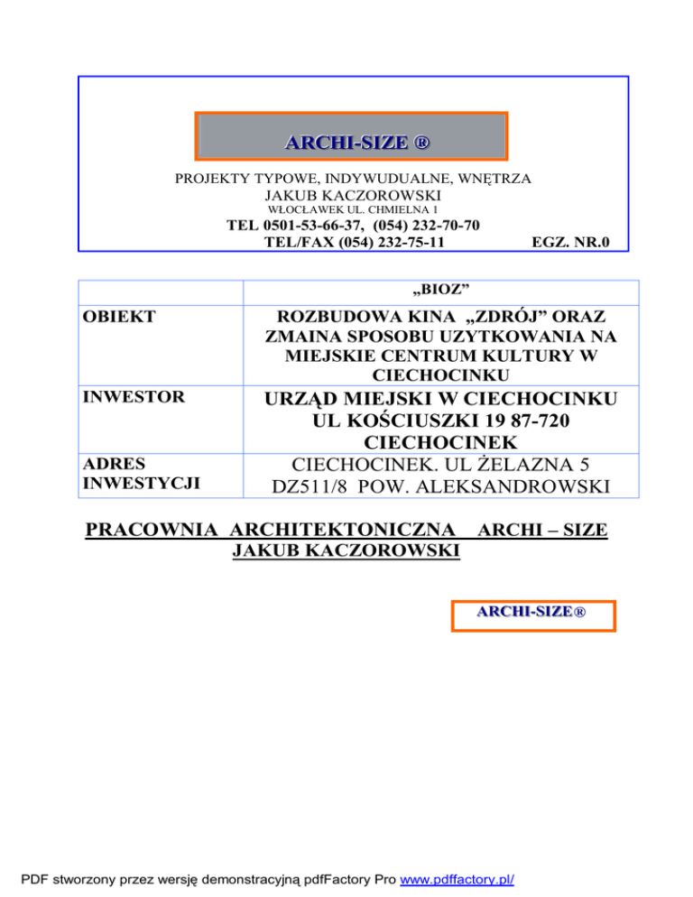 A AR RC CH HII--SSIIZ ZE E® ® PROJEKTY TYPOWE, INDYWUDUALNE, WNĘTRZA JAKUB KACZOROWSKI WŁOCŁAWEK UL. CHMIELNA 1 TEL 0501-53-66-37, (054) 232-70-70 TEL/FAX (054) 232-75-11 EGZ. NR.0 „BIOZ” OBIEKT ROZBUDOWA KINA „ZDRÓJ” ORAZ ZMAINA SPOSOBU UZYTKOWANIA NA MIEJSKIE CENTRUM KULTURY W CIECHOCINKU INWESTOR URZĄD MIEJSKI W CIECHOCINKU UL KOŚCIUSZKI 19 87-720 CIECHOCINEK CIECHOCINEK. UL ŻELAZNA 5 DZ511/8 POW. ALEKSANDROWSKI ADRES INWESTYCJI PRACOWNIA ARCHITEKTONICZNA ARCHI – SIZE JAKUB KACZOROWSKI A E® ZE CH HII--SSIIZ RC AR PDF stworzony przez wersję demonstracyjną pdfFactory Pro www.pdffactory.pl/ INFORMACJA DOTYCZĄCA BEZPIECZEŃSTWA I OCHRONY ZDROWIA - w związku z projektem rozbudowy kina „ZDRÓJ” oraz zmianie sposobu użytkowania na miejskie centrum kultury w Ciechocinku dz. nr. 511/8 Podstawa prawna: Prawo Budowlane z dnia 27 marca 2003r. Art. 20 pkt 1b Rozporządzenia Ministra Infrastruktury 1126 z dnia 23.06.2003r. Dz. U. 120 z dnia 10.07.2003r. w sprawie bezpieczeństwa i higieny pracy podczas wykonywania robót budowlanych. Zakres robót dla zamierzenia budowlanego – w związku z projektem rozbudowy kina „ZDRÓJ” oraz zmianie sposobu użytkowania na miejskie centrum kultury w Ciechocinku dz. nr. 511/8 a. Nie występuje wyłączenie z ponieważ teren inwestycji nie uzgodnieniu. b. Istniejące obiekty budowlane – podlegający rozbudowie kina produkcji rolnej podlega takiemu istniejący obiekt „ZDRÓJ” oraz zmianie sposobu użytkowania na miejskie centrum kultury w Ciechocinku Elementy zagospodarowania działki stwarzające zagrożenie bezpieczeństwa i zdrowia ludzi – nie występują . c. Przewidywane zagrożenia występujące podczas realizacji robót: Roboty ziemne i na wysokości (konstrukcyjno – montażowe), które należy wykonywać zgodnie z wytycznymi Rozdz. 9 ww. Rozporządzenia BHP. d. Wskazanie sposobu prowadzenia instruktażu pracowników przed przystąpieniem do realizacji robót szczególnie niebezpiecznych (praca na wysokości) – to szkolenie BHP pracowników zatrudnionych na budowie z potwierdzeniem 2 PDF stworzony przez wersję demonstracyjną pdfFactory Pro www.pdffactory.pl/ odbycia szkolenia przez osobę uprawnioną do prowadzenia szkoleń BHP. e. Wskazanie środków technicznych i organizacyjnych zapobiegających niebezpieczeństwom wynikających z wykonywania robót budowlanych w sferach szczególnego zagrożenia zdrowia – nie występuje. UWAGA: Zgodnie z Art. 21 A. Prawa Budowlanego I § 3.1 Rozporządzenia BIOZ, kierownik budowy przed rozpoczęciem robót winien opracować Plan Bezpieczeństwa I Ochrony Zdrowia, zwany „PLANEM BIOZ”. 3 PDF stworzony przez wersję demonstracyjną pdfFactory Pro www.pdffactory.pl/ A AR RC CH HII--SSIIZ ZE E® ® PROJEKTY TYPOWE, INDYWUDUALNE, WNĘTRZA JAKUB KACZOROWSKI WŁOCŁAWEK UL. CHMIELNA 1 TEL 0501-53-66-37, (054) 232-70-70 TEL/FAX (054) 232-75-11 EGZ. NR.0 „BIOZ” OBIEKT ROZBUDOWA KINA „ZDRÓJ” ORAZ ZMAINA SPOSOBU UZYTKOWANIA NA MIEJSKIE CENTRUM KULTURY W CIECHOCINKU INWESTOR URZĄD MIEJSKI W CIECHOCINKU UL KOŚCIUSZKI 19 87-720 CIECHOCINEK CIECHOCINEK. UL ŻELAZNA 5 DZ511/8 POW. ALEKSANDROWSKI ADRES INWESTYCJI PRACOWNIA ARCHITEKTONICZNA ARCHI – SIZE JAKUB KACZOROWSKI A E® ZE CH HII--SSIIZ RC AR PDF stworzony przez wersję demonstracyjną pdfFactory Pro www.pdffactory.pl/ INFORMACJA DOTYCZĄCA BEZPIECZEŃSTWA I OCHRONY ZDROWIA - w związku z projektem rozbudowy kina „ZDRÓJ” oraz zmianie sposobu użytkowania na miejskie centrum kultury w Ciechocinku dz. nr. 511/8 Podstawa prawna: Prawo Budowlane z dnia 27 marca 2003r. Art. 20 pkt 1b Rozporządzenia Ministra Infrastruktury 1126 z dnia 23.06.2003r. Dz. U. 120 z dnia 10.07.2003r. w sprawie bezpieczeństwa i higieny pracy podczas wykonywania robót budowlanych. Zakres robót dla zamierzenia budowlanego – w związku z projektem rozbudowy kina „ZDRÓJ” oraz zmianie sposobu użytkowania na miejskie centrum kultury w Ciechocinku dz. nr. 511/8 a. Nie występuje wyłączenie z ponieważ teren inwestycji nie uzgodnieniu. b. Istniejące obiekty budowlane – podlegający rozbudowie kina produkcji rolnej podlega takiemu istniejący obiekt „ZDRÓJ” oraz zmianie sposobu użytkowania na miejskie centrum kultury w Ciechocinku Elementy zagospodarowania działki stwarzające zagrożenie bezpieczeństwa i zdrowia ludzi – nie występują . c. Przewidywane zagrożenia występujące podczas realizacji robót: Roboty ziemne i na wysokości (konstrukcyjno – montażowe), które należy wykonywać zgodnie z wytycznymi Rozdz. 9 ww. Rozporządzenia BHP. d. Wskazanie sposobu prowadzenia instruktażu pracowników przed przystąpieniem do realizacji robót szczególnie niebezpiecznych (praca na wysokości) – to szkolenie BHP pracowników zatrudnionych na budowie z potwierdzeniem 2 PDF stworzony przez wersję demonstracyjną pdfFactory Pro www.pdffactory.pl/ odbycia szkolenia przez osobę uprawnioną do prowadzenia szkoleń BHP. e. Wskazanie środków technicznych i organizacyjnych zapobiegających niebezpieczeństwom wynikających z wykonywania robót budowlanych w sferach szczególnego zagrożenia zdrowia – nie występuje. UWAGA: Zgodnie z Art. 21 A. Prawa Budowlanego I § 3.1 Rozporządzenia BIOZ, kierownik budowy przed rozpoczęciem robót winien opracować Plan Bezpieczeństwa I Ochrony Zdrowia, zwany „PLANEM BIOZ”. 3 PDF stworzony przez wersję demonstracyjną pdfFactory Pro www.pdffactory.pl/ A AR RC CH HII--SSIIZ ZE E® ® PROJEKTY TYPOWE, INDYWUDUALNE, WNĘTRZA JAKUB KACZOROWSKI WŁOCŁAWEK UL. CHMIELNA 1 TEL 0501-53-66-37, (054) 232-70-70 TEL/FAX (054) 232-75-11 EGZ. NR.0 „BIOZ” OBIEKT ROZBUDOWA KINA „ZDRÓJ” ORAZ ZMAINA SPOSOBU UZYTKOWANIA NA MIEJSKIE CENTRUM KULTURY W CIECHOCINKU INWESTOR URZĄD MIEJSKI W CIECHOCINKU UL KOŚCIUSZKI 19 87-720 CIECHOCINEK CIECHOCINEK. UL ŻELAZNA 5 DZ511/8 POW. ALEKSANDROWSKI ADRES INWESTYCJI PRACOWNIA ARCHITEKTONICZNA ARCHI – SIZE JAKUB KACZOROWSKI A E® ZE CH HII--SSIIZ 