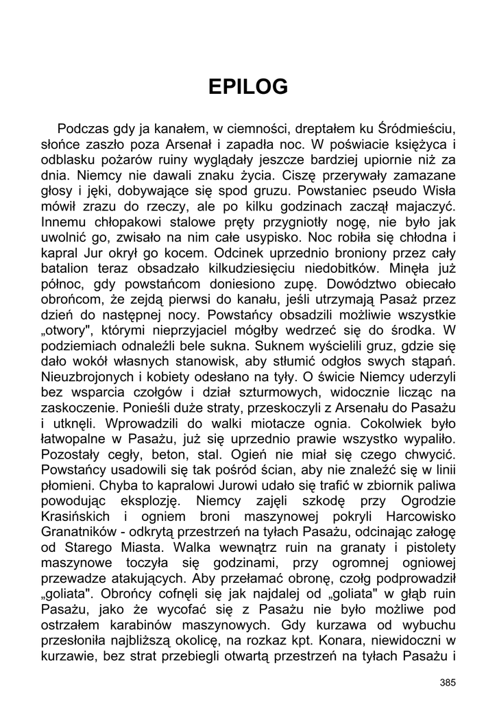 EPILOG Podczas gdy ja kanałem, w ciemności, dreptałem ku Śródmieściu, słońce zaszło poza Arsenał i zapadła noc. W poświacie księżyca i odblasku pożarów ruiny wyglądały jeszcze bardziej upiornie niż za dnia. Niemcy nie dawali znaku życia. Ciszę przerywały zamazane głosy i jęki, dobywające się spod gruzu. Powstaniec pseudo Wisła mówił zrazu do rzeczy, ale po kilku godzinach zaczął majaczyć. Innemu chłopakowi stalowe pręty przygniotły nogę, nie było jak uwolnić go, zwisało na nim całe usypisko. Noc robiła się chłodna i kapral Jur okrył go kocem. Odcinek uprzednio broniony przez cały batalion teraz obsadzało kilkudziesięciu niedobitków. Minęła już północ, gdy powstańcom doniesiono zupę. Dowództwo obiecało obrońcom, że zejdą pierwsi do kanału, jeśli utrzymają Pasaż przez dzień do następnej nocy. Powstańcy obsadzili możliwie wszystkie „otwory", którymi nieprzyjaciel mógłby wedrzeć się do środka. W podziemiach odnaleźli bele sukna. Suknem wyścielili gruz, gdzie się dało wokół własnych stanowisk, aby stłumić odgłos swych stąpań. Nieuzbrojonych i kobiety odesłano na tyły. O świcie Niemcy uderzyli bez wsparcia czołgów i dział szturmowych, widocznie licząc na zaskoczenie. Ponieśli duże straty, przeskoczyli z Arsenału do Pasażu i utknęli. Wprowadzili do walki miotacze ognia. Cokolwiek było łatwopalne w Pasażu, już się uprzednio prawie wszystko wypaliło. Pozostały cegły, beton, stal. Ogień nie miał się czego chwycić. Powstańcy usadowili się tak pośród ścian, aby nie znaleźć się w linii płomieni. Chyba to kapralowi Jurowi udało się trafić w zbiornik paliwa powodując eksplozję. Niemcy zajęli szkodę przy Ogrodzie Krasińskich i ogniem broni maszynowej pokryli Harcowisko Granatników - odkrytą przestrzeń na tyłach Pasażu, odcinając załogę od Starego Miasta. Walka wewnątrz ruin na granaty i pistolety maszynowe toczyła się godzinami, przy ogromnej ogniowej przewadze atakujących. Aby przełamać obronę, czołg podprowadził „goliata". Obrońcy cofnęli się jak najdalej od „goliata" w głąb ruin Pasażu, jako że wycofać się z Pasażu nie było możliwe pod ostrzałem karabinów maszynowych. Gdy kurzawa od wybuchu przesłoniła najbliższą okolicę, na rozkaz kpt. Konara, niewidoczni w kurzawie, bez strat przebiegli otwartą przestrzeń na tyłach Pasażu i 385 obsadzili nowe stanowiska. Niemcy zaraz zajęli Pasaż i zapewne sądząc, że obrona rozpierzchła się, zapędzili się za daleko. Przeskoczyli Harcowisko Granatników i wpadli do wypalonej fabryczki, nie wiedząc że Polacy są tuż obok. Powstańcy obrzucali ich granatami. Za dnia Niemcy nie mogli wydostać się z fabryczki, bo jedyne wyjście było pod ostrzałem. Niemcy w Pasażu, widząc co się dzieje, próbowali ustawić na piętrach karabiny maszynowe, aby ogniem osłonić swych kolegów. Zbyt byli widoczni, aby im to się udało. Lech, ten który ocalał przy bombardowaniu myjąc się ze mną, teraz rzucając granat polskiej produkcji, zwany sidolówką, został ranny. Sidolówką wybuchła za wcześnie i dostał odłamkiem w pośladek. Z nastaniem nocy walka ustała. Niemcy, odcięci w fabryczce, obrzuciwszy powstańców granatami, aby odsłonić swój odwrót, przeskoczyli do Pasażu. Kapitan Konar, po powrocie z narady w dowództwie, wręczył kapralowi Jurowi puszkę konserw mówiąc - to za Pasaż Simonsa. Osiemdziesięciu kilku ostatnich obrońców Pasażu, to co pozostało z batalionu, zeszło do kanału. W kompanii Lisa dwóch zostało odznaczonych Krzyżem Virtuti Militari: ppor. Szofer i kpr. Jur. * * * Jabłońskiego nie odnaleziono. Barykada zmarł z ran po Powstaniu. Major Sosna zginął w Śródmieściu. Kapitan Kamień zginął na Starówce. Ankę ranny powstaniec wyniósł z płonącego „szpitala". Przed rozstrzelaniem podobno ocalili ją i innych Niemcyjeńcy, którzy ujęli się za rannymi powstańcami. Jurka Adamczyka rozstrzelali. Por. Jerzyk z batalionu Zośka i Wis II, cekaemista z kompanii Lisa, zginęli na Wilanowskiej. Pchor. Roman poległ przy Solcu. Edek, Hanka i Witek przepłynęli Wisłę na praski brzeg. Kanonier Sław, wzięty do niewoli przy Solcu, przeżył. Pchor. Sław, którego karabin służył mi na Starówce, zginął. Ppor. Jeleń, pchor. Jeleń i plut. Tur zaginęli. Pchor. Miś z batalionu Zośka przeszedł kanałem z Czerniakowa na Mokotów, z Mokotowa do Śródmieścia i przeżył. Kpt. Konar - piąty dowódca batalionu, por. Lis, por. Klim, ppor. Szofer, sierżant Wierny, Kobuz, Kawka, kpr. Jur - artylerzysta, Reniek, Kuba, Szarota, Lech, Mały, Krypo, Sylwia, przeszli kanałem do Śródmieścia i przeżyli Powstanie. Z tych, co byli ranni jeszcze na Woli, ppor. Kenar, piegowaty, w granatowej cyklistówce, ten co nas musztrował i rugał, wylizał się z ran; ppor. Tadzik przeżył; ppor. Tytus zmarł po Powstaniu. * * * 386 Stryjo wrócił do Pasażu krótko przed bombardowaniem. Po trzech latach podczas ekshumacji znaleziono przy nim list do jego dwunastoletniej córki. List doręczono. Gdy w marcu 1945 roku obchodziłem moje pobojowiska powstania odnalazłem i studzienkę. Na dnie leżała butelka cacao chois. Legitymacji Armii Krajowej którą Adamczyk wcisnął w szparę pomiędzy deskami nie było. * * * Jerzy Schabowicz, Jur – artylerzysta, końcowe godziny obrony Pasażu Simonsa opisuje na podstawie własnych przeżyć. W rękopisie wspomnień [kopii] liczących 32 strony ta ostatnia obrona opisana jest na pięciu stronach: 11, 12, 13, 14, 15. „... Dopiero w dniu 31 sierpnia specjalny nalot lotniczy zamienił ostatnie punkty oporu batalionu „Chrobry I” tj. Pasażu Simonsa i Szkoły na ul. Barokowej w kupę gruzów grzebiąc pod nimi ponad 200 żołnierzy batalionu. Nalot zastał żołnierzy batalionu, gdy odpoczywa po nocnej nieudanej próbie przebijania się do Śródmieścia. W innym miejscu opisuję przypadek, któremu zawdzięcz