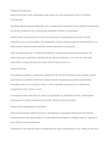 Polityka Prywatności Serwis Iluzjonisci.com zastrzega sobie prawo do wprowadzania zmian w Polityce Prywatności. Każdego klienta Serwis Iluzjonisci.com i użytkownika serwisów oraz publikacji należących do Serwis Iluzjonisci.com obowiązuje aktualna Polityka Prywatności. Jakiekolwiek wprowadzane zmiany nie wpływają na podstawową zasadę: Serwis Iluzjonisci.com nie sprzedaje i nie udostępnia osobom trzecim danych personalnych czy adresowych klientów/użytkowników swoich serwisów i czasopism. Jeśli nie zgadzasz się z Polityką Prywatności, proszę nie odwiedzać serwisów, nie prenumerować czasopism należących do Serwis Iluzjonisci.com oraz nie nabywać produktów i usług oferowanych przez Serwis Iluzjonisci.com. Dane Osobowe W czasie korzystania z serwisów należących do Serwis Iluzjonisci.com możesz zostać poproszony o podanie niektórych swoich danych osobowych poprzez wypełnienie formularza lub w inny sposób. Dane, o które będziesz proszony, to w większości przypadków imię i adres e-mail. Wymagamy tylko tych danych, które są niezbędne do działania serwisu. Niepodanie wymaganych danych zablokuje czynność, którą te dane dotyczyły. Subskrypcja bezpłatnych czasopism Zaprenumerowanie elektronicznych i bezpłatnych czasopism należących do Serwis Iluzjonisci.com wymaga podania w odpowiednim formularzu swojego imienia i adresu email. Pola te są obowiązkowe. Uzyskane w ten sposób dane są dodawane do listy mailingowej e-zinu. Adres e-mail jest niezbędny do tego, aby można było wysłać danemu czytelnikowi numer czasopisma. Imię pozwala Serwis Iluzjonisci.com zwracać się do czytelników po imieniu. Zamawianie usług i produktów Zamawianie usług i produktów oferowanych przez Serwis Iluzjonisci.com wymaga podania w odpowiednim formularzu pełniejszych danych adresowych. Pola obowiązkowe są oznaczone. Obsługę płatności stanowi system Płatności.pl Niezapowiedziane Wiadomości Serwis Iluzjonisci.com zastrzega sobie prawo do wysyłania niezapowiedzianych wiadomości osobom, których dane kontaktowe posiada i które zgodziły się z Polityką Prywatności. Pod pojęciem niezapowiedzianych wiadomości Serwis Iluzjonisci.com rozumie informacje odnoszące się bezpośrednio do jego serwisów, czasopism, usług i produktów (np. zmiany, wewnętrzne promocje), niekomercyjne listy (np. życzenia, komentarze osobiste itp.) oraz informacje komercyjne, których rozsyłka została opłacona przez klientów Serwis Iluzjonisci.com. Podmioty zlecające komercyjne mailingi nie mają wglądu w dane kontaktowe osób znajdujących się na listach adresowych Serwis Iluzjonisci.com. Informacje komercyjne są filtrowane w stopniu w jakim jest to możliwe, ograniczana jest ich objętość i wysyłane są sporadycznie. Jawne Dane Osobowe Dane osobowe podane na serwisach należących do Serwis Iluzjonisci.com przy okazji wysyłania komentarzy do artykułów, odpowiedzi na forum itp. są dostępne dla wszystkich odwiedzających strony zawierające te dane. Serwis Iluzjonisci.com nie ma możliwości zabezpieczenia użytkowników przed osobami prywatnymi lub firmami, które te dane wykorzystają do przesłania nieokreślonych informacji. Dlatego dane te nie podlegają Polityce Prywatności. Inne formularze Formularze znajdujące się gościnnie na serwisach należących do Serwis Iluzjonisci.com i dotyczące usług, produktów, serwisów i czasopism nieobsługiwanych przez Serwis Iluzjonisci.com nie podlegają Polityce Prywatności. Cookies (Ciasteczka) Niektóre obszary serwisów należących do Serwis Iluzjonisci.com mogą wykorzystywać cookies, czyli małe pliki tekstowe wysyłane do komputera internauty identyfikujące go w sposób potrzebny do uproszczenia lub umorzenia danej operacji. Cookies są nieszkodliwe ani dla komputera ani dla jego użytkownika i jego danych. Warunkiem działania cookies jest ich akceptacja przez przeglądarkę i nie usuwanie ich z dysku. Partnerzy Polityka Prywatności nie dotyczy serwisów i firm, których dane kontaktowe podane są w serwisach i czasopismach należących do Serwis Iluzjonisci.com. Wyłączenie Odpowiedzialności Serwis Iluzjonisci.com został stworzony, aby pomagać prowadzeniu biznesu. Nie powinno się bezwarunkowo korzystać z dokumentów, które udostępniamy. Zawsze pamiętaj, aby dany dokument dokładnie przeczytać i szczegółowo przeanalizować, gdyż może nie być stosowny do Twojej sytuacji, ewentualnie skonfrontuj z innymi podobnymi publikacjami. Opinie wyrażone przez społeczność na forum, w komentarzach lub w inny sposób nie zawsze są zgodne z opinią Serwisu Iluzjonisci.com. Serwis Iluzjonisci.com oraz jego redakcja nie bierze na siebie odpowiedzialności za zamieszczone reklamy. Kupujący powinien być ostrożny odpowiadając na reklamę, bądź wysyłając pieniądze.