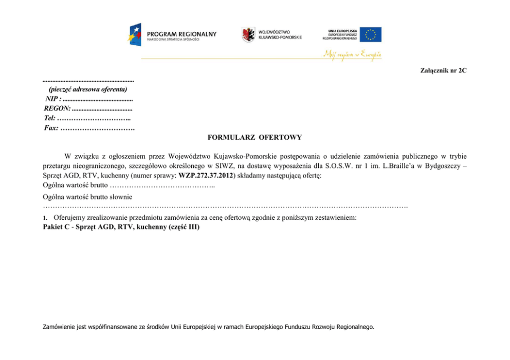 Załącznik nr 2C ........................................................ (pieczęć adresowa oferenta) NIP : ........................................... REGON: ..................................... Tel: ………………………….. Fax: …………………………. FORMULARZ OFERTOWY W związku z ogłoszeniem przez Województwo Kujawsko-Pomorskie postępowania o udzielenie zamówienia publicznego w trybie przetargu nieograniczonego, szczegółowo określonego w SIWZ, na dostawę wyposaŜenia dla S.O.S.W. nr 1 im. L.Braille’a w Bydgoszczy – Sprzęt AGD, RTV, kuchenny (numer sprawy: WZP.272.37.2012) składamy następującą ofertę: Ogólna wartość brutto …………………………………….. Ogólna wartość brutto słownie ……………………………………………………………………………………………………………………………………. Oferujemy zrealizowanie przedmiotu zamówienia za cenę ofertową zgodnie z poniŜszym zestawieniem: Pakiet C - Sprzęt AGD, RTV, kuchenny (część III) 1. Zamówienie jest współfinansowane ze środków Unii Europejskiej w ramach Europejskiego Funduszu Rozwoju Regionalnego. Lp. 1 Nazwa produktu Kuchnia elektryczna z piekarnikiem elektrycznym oraz okapem Opis produktu Kuchnia elektryczna wolnostojąca • 4 okrągłe Ŝeliwne płyty o średnicy 220 mm o mocy 2,6 kW kaŜdy • Ŝaroodporne elementy grzewcze ze stali nierdzewnej, • Kontrolki zasilania i pracy • Płyta ze stali nierdzewnej AISI 304 • Wymiary: kuchnia - głębokość 700 mm - szerokość 800 mm - wysokość 900 mm • piekarnik elektryczny np. GN2/1 statyczny z 4 poziomami • 1 ruszt • Wymiary piekarnika 530mmx650mm • Moc piekarnika 7,5kW • W zestawie pojemnik np. GN 2/1 o wysokości 40mm • Gwarancja 3 lata Okap kuchenny • Wymiary: 70 x 73-100 x 49 cm • Wydajność maksymalna:490m3/h • Poziom hałasu: 66dB • Oświetlenie: halogenowe 2x20 W • Sterowanie: elektroniczne • Regulacja prędkości: skokowa 3stopnie • Liczba silników:1 • Tryb pracy: pochłaniacz, wyciąg • Filtry przeciwtłuszczowe: metalowe • Średnica wylotu powietrza:15cm • Kolor (wykończenie): srebrny - stal nierdzewna • Funkcje dodatkowe: przyciski "soft touch" • W zestawie przewód doprowadzający do komina o dł 200 m • Gwarancja: 24 miesiące Zamówienie jest współfinansowane ze środków Unii Europejskiej w ramach Europejskiego Funduszu Rozwoju Regionalnego. ilość 1 2 Kuchnia elektryczna z podstawą i okapem Całość wyposaŜenia składa się z : 3 szt. zestawów A oraz 1 szt. zestawu B Zestaw A (3 szt.) 1. kuchnia czteropalnikowa, • wymiary: - głębokość 700 mm - szerokość 800 mm - wysokość 290 mm • Zasilanie 400-415V, 3N~ • Płyty Ŝeliwne elektryczne o średnicy 220mm i mocy 2,6 kW z Ŝaroodpornymi elementami grzewczymi ze stali nierdzewnej. • Kontrolki świetlne napięcia i pracy • Gruba przetłoczona płyta ze stali nierdzewnej AISA 304 • Gwarancja 3 lata 2. Podstawa • otwarta • wykonane ze stali nierdzewnej, • regulowane nóŜki ze stali nierdzewnej • wymiary 800x560x600mm 3. okap kuchenny • Wymiary: 70 x 73-100 x 49 cm • Wydajność maksymalna:490m3/h • Poziom hałasu: 66dB • Oświetlenie: halogenowe 2x20 W • Sterowanie: elektroniczne • Regulacja prędkości: skokowa 3stopnie • Liczba silników:1 • Tryb pracy: pochłaniacz, wyciąg • Filtry przeciwtłuszczowe: metalowe • Średnica wylotu powietrza:15cm • Kolor (wykończenie): srebrny - stal nierdzewna • Funkcje dodatkowe: przyciski "soft touch" • W zestawie przewód doprowadzający do komina o dł 200 cm • Gwarancja: 24 miesiące Zamówienie jest współfinansowane ze środków Unii Europejskiej w ramach Europejskiego Funduszu Rozwoju Regionalnego. 4 Zestaw B (1 szt.) 1. Kuchenka - płyta grzejna montowana na szafce, • 4 pola elektryczne • Moc 7 kW • 4 pola elektryczne • Moc całkowita 7000 W • Wymiary urządzenia: - wysokość 880 mm • - szerokość 600 mm • - głębokość 530 mm • 1 pole szybkogrzejne • Wskaźnik dziania płyty • Materiał wykonania – stal nierdzewna • Kolor srebrny • Pokrętła z prawej strony płyty • Rodzaj miejsc do gotowania: • Dwa pola 145 mm, 1,5 kW, płytki szybkogrzejne • Dwa pola 180 mm, 2 kW, płytki szybkogrzejne • Wymiary do zabudowy: - wysokość 160 mm - szerokość 560mm - głębokość 490 mm • Gwarancja 24 miesiące • W zestawie okap kuchenny 2. Okap kuchenny: • Wymiary: 60 x 72,5-100 x 48 cm • Wydajność maksymalna:390m3/h • Poziom hałasu: 61dB • Oświetlenie: Ŝarówki 2x20 W • Sterowanie: elektroniczne • Regulacja prędkości: skokowa 3stopnie • Liczba silników:1 • Tryb pracy: pochłaniacz, wyciąg • Filtry przeciwtłuszczowe: metalowe • Średnica wylotu powietrza:15cm • Kolor (wykończenie): srebrny - stal nierdzewna • Funkcje dodatkowe: przyciski "soft touch" • W zestawie przewód doprowadzający do komina o dł 200 m • Gwarancja: 24 miesiące , wykonany ze stali nierdzewnej Zamówienie jest współfinansowane ze środków Unii Europejskiej w ramach Europejskiego Funduszu Rozwoju Regionalnego. 3 Piec elektryczny konwekcyjnoparowy z szafką i okapem Piec typu 3xGN1/1 wentylator o zmiennym kierunku obrotów system obiegu powietrza wewnątrz komory pieca system bezpośredniej produkcji pary system usuwana pary z komory pieca system pozwalający na ustawienie do 9 odrębnych czasów dla róŜnych potraw przygotowywanych w tym samym środowisku; • system pozwalający uzyskać powtarzalność wypieków; • system obniŜający i stabilizujący temperaturę obudowy pieca do ok.60st C • system myjący automatyczny • sonda temperatury • dotykowy panel sterowania • automatycznie regulowana moc grzałek • pojemność 3 GN 1/1 • w zestawie 3 pojemniki GN 1/1 o wysokościach 40, 65 i 100mm • odległość miedzy półkami 67 mm • wymiary: - głębokość 750 mm - szerokość 761 mm - wysoko