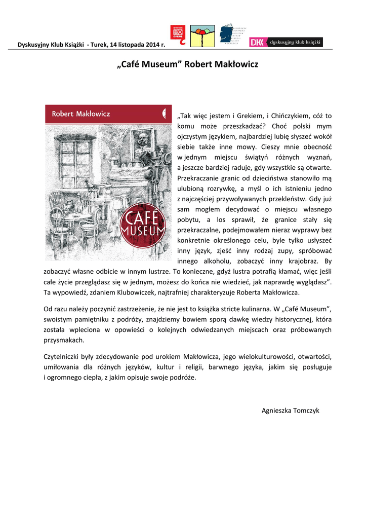 Dyskusyjny Klub Książki - Turek, 14 listopada 2014 r. „Café Museum” Robert Makłowicz „Tak więc jestem i Grekiem, i Chińczykiem, cóż to komu może przeszkadzać? Choć polski mym ojczystym językiem, najbardziej lubię słyszeć wokół siebie także inne mowy. Cieszy mnie obecność w jednym miejscu świątyń różnych wyznań, a jeszcze bardziej raduje, gdy wszystkie są otwarte. Przekraczanie granic od dzieciństwa stanowiło mą ulubioną rozrywkę, a myśl o ich istnieniu jedno z najczęściej przywoływanych przekleństw. Gdy już sam mogłem decydować o miejscu własnego pobytu, a los sprawił, że granice stały się przekraczalne, podejmowałem nieraz wyprawy bez konkretnie określonego celu, byle tylko usłyszeć inny język, zjeść inny rodzaj zupy, spróbować innego alkoholu, zobaczyć inny krajobraz. By zobaczyć własne odbicie w innym lustrze. To konieczne, gdyż lustra potrafią kłamać, więc jeśli całe życie przeglądasz się w jednym, możesz do końca nie wiedzieć, jak naprawdę wyglądasz”. Ta wypowiedź, zdaniem Klubowiczek, najtrafniej charakteryzuje Roberta Makłowicza. Od razu należy poczynić zastrzeżenie, że nie jest to książka stricte kulinarna. W „Café Museum”, swoistym pamiętniku z podróży, znajdziemy bowiem sporą dawkę wiedzy historycznej, która została wpleciona w opowieści o kolejnych odwiedzanych miejscach oraz próbowanych przysmakach. Czytelniczki były zdecydowanie pod urokiem Makłowicza, jego wielokulturowości, otwartości, umiłowania dla różnych języków, kultur i religii, barwnego języka, jakim się posługuje i ogromnego ciepła, z jakim opisuje swoje podróże. Agnieszka Tomczyk