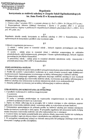 Zespół Szkól Ogólnokształcących im. Jana J‘aivla II w Krasnobrodzie 22-440 Krasnobród, ul. Lelewela 37 tel./fax (84) 660 70 80, 660 89 25 NIP 922-24-18-383 Regulamin korzystania ze stołówki szkolnej w Zespole Szkół Ogólnokształcących im. Jana Pawła II w Krasnobrodzie PODSTAWA PRAWNA: 1.. Ustawa z dnia 7 września 1991 r. o systemie oświaty (t.j. Dz. U. z 2004 r. Nr 256poz.2572 ze.zm.). 2. Rozporządzenie Ministra Edukacji Narodowej i Sportu z 31 grudnia 2002 r. w sprawie bezpieczeństwa i higieny w publicznych i niepublicznych szkołach i placówkach (Dz. U. z 2003 r. Nr 6, poz. 69 z późn. zm.) Regulamin określa zasady korzystania ze stołówki szkolnej w ZSO w Krasnobrodzie, w tym uprawnionych do korzystania z posiłków oraz wysokości opłat. §2 1.Ilekroć w regulaminie jest mowa o: 1) szkole — należy przez to rozumieć szkoły , których organem prowadzącym jest Miasto Krasnobród. 2) uczniu — należy przez to rozumieć dzieci i młodzież uczęszczającą do oddziałów przedszkolnych, szkół podstawowych, gimnazjum i liceum ogólnokształcącego, których organem prowadzącym jest Miasto Krasnobród. 3) pracownicy szkoły - należy przez to rozumieć aktualnie zatrudnione osoby (nauczyciele i pozostali pracownicy ZSO i ZSP w Krasnobrodzie) §3 POSTANOWIENIA OGOLNE 1. Stołówka jest miejscem spożywania posiłków przygotowanych przez pracowników kuchni szkolnej 2. Posiłki dla uczniów i pracowników wydawane są w czasie trwania rocznych zajęć dydaktycznowychowawczych i harmonogramu wywieszonego na tablicy informacyjnej w stołówce szkolnej 3. Postanowienia niniejszego regulaminu, ogłoszenia dotyczące stołówki szkolnej (w tym wysokość opłat za posiłki) znajdują się u kierownika stołówki szkoły, wywieszone są na tablicy informacyjnej w stołówce szkolnej oraz umieszczone na stronie internetowej szkoły www.zsokrasnobrod.pl. 4. Aktualny jadłospis wywieszony jest na tablicy informacyjnej w stołówce szkolnej. §4 UPRAWNIENIA DO KORZYSTANIA ZE STOŁÓWKI 1. Z posiłków wydawanych w stołówce mogą korzystać: 1) uczniowie 2) pracownicy szkoły 3) osoby z zewnątrz przebywające na wypoczynku zorganizowanym na terenie szkoły na podstawie podpisanych umów na wyżywienie 2. Zapisy na obiady odbywają się na początku lub w trakcie miesiąca w roku szkolnym, poprzez zgłoszenie u kierownika stołówki szkoły i wniesienie opłaty za wyżywienie na konto bankowe. 3. Dokumentem uprawniającym do pobrania posiłku na stołówce szkolnej jest imienna miesięczna kartka żywieniowa wydawana w dniu zapisu. W przypadku zagubienia lub zniszczenia kartki, kolejną można otrzymać u kierownika stołówki ( ale tylko maksymalnie trzy w miesiącu) 4. Uczniowi który nie będzie posiadał kartki przy poborze obiadu, pracownicy kuchni nie wydadzą na stołówce posiłku ( zapis nie dotyczy dzieci z przedszkola oraz oddziałów zerowych). 5. W szczególnie uzasadnionej sytuacji na wniosek nauczyciela lub pedagoga szkolnego uczeń może skorzystać z ciepłego posiłku nieodpłatnie. USTALANIE WYSOKOŚCI OPŁAT ZA POSIŁKI 1. Stołówka szkolna zapewnia posiłki gotowane w formie : 1) zupa 2) pełny obiad 3) drugie danie 4) wyżywienie całodzienne w przedszkolu (śniadanie, obiad, podwieczorek) 2. Wysokość opłat: 1) Wysokość cen za posiłki ustala Dyrektor ZSO w porozumieniu z organem prowadzącym. 2) Cena za wyżywienie uczniów uwzględnia koszt surowców zużytych do przygotowania posiłku. 3) Cena za posiłek dla pracowników szkoły, obejmuje pełny koszt przygotowania posiłku. Odpłatność składa się z kosztów surowców zużytych do przygotowania posiłku, wydatków na wynagrodzenia osób zatrudnionych przy przygotowaniu, pochodne od wynagrodzeń, oraz koszty utrzymania stołówki. 4) Ustala się ceny posiłków a. cena za jeden posiłek dla ucznia wynosi: 1,00 - zupa 2,50 - drugie danie 3,50 - pełny obiad 5,00 - wyżywienie całodzienne w przedszkolu za jeden posiłek dla pracownika wynosi: 2,00 - zupa 5,00 - drugie danie 7,00 - pełny obiad c. opłaty za osoby z zewnątrz na podstawie podpisanych umów na wyżywienie ustalane są w dniu podpisania umowy §6 WNOSZENIE OPŁAT ZA POSIŁKI 1. Wszyscy korzystający z posiłków wydawanych przez stołówkę szkolną zobowiązani są do regularnego wnoszenia opłat. 2. Szkoła nie przyjmuje wpłat gotówkowych, opłaty za wyżywienie dokonuje się na konto bankowe numer 57 9639 0009 2002 0057 6938 0003 w terminie do 30 dnia każdego miesiąca, jeżeli trzydziesty dzień miesiąca jest dniem wolnym , to wpłaty należy dokonać wcześniej. 3. Nieterminowe dokonywanie wpłat za dany miesiąc spowoduje wypisanie dziecka z obiadów od następnego miesiąca. 4. Wysokość opłaty za konkretny miesiąc ustala i podaje do wiadomości kierownik stołówki. Kwota wpłacona na konto szkoły musi być zgodna z kwotą wskazaną przez kierownika stołówki. Kierownik stołówki szkoły podaje rodzicom lub uczniom kwotę jaka powinna być uiszczona za wyżywienie w danym miesiącu w dniu zapisu /zgłoszenia/ na obiady. 5. Istnieje możliwość wykupienia obiadów w wybrane dni tygodnia, dogodne dla osób korzystających ze stołówki. Opłata za obiady w wybrane dni tygodnia wnoszona jest z góry, do 30 dnia miesiąca poprzedzającego miesiąc korzystania. 6. W przypadku wnoszenia opłat za posiłki dla uczniów przez Gminne Ośrodki Pomocy Społecznej zasady i terminy dokonywania tych opłat regulują odrębne ustalenia. 7. Jeżeli do trzydziestego dnia danego miesiąca uczeń nie uiści odpłatności za obiady wówczas kierownik stołówki natychmiast pisemnie upomina rodziców o zaległości w zapłacie. 8. Kierownik stołówki odmawia zapisania uczniów na korzystanie z posiłków na stołówce szkolnej, którzy zalegają z wpłatami za poprzedni okres rozliczeniowy. ZWROTY ZA NIEWYKORZYSTANE OBIADY 1 Rodzic opiekun prawny ucznia lub osoba dorosła korzystająca z posiłku zgłasza do kierownika