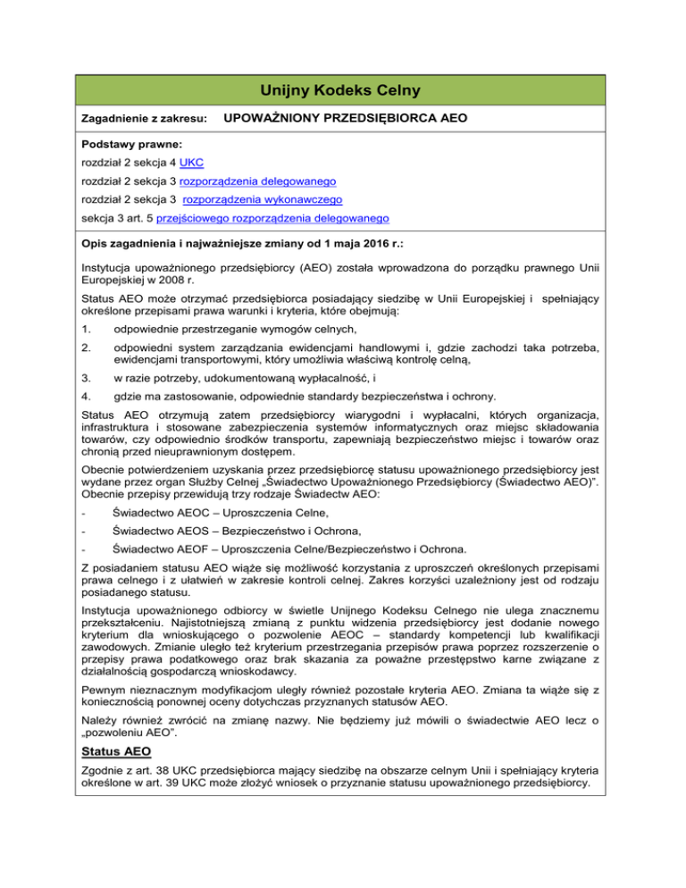 Unijny Kodeks Celny Zagadnienie z zakresu: UPOWAŻNIONY PRZEDSIĘBIORCA AEO Podstawy prawne: rozdział 2 sekcja 4 UKC rozdział 2 sekcja 3 rozporządzenia delegowanego rozdział 2 sekcja 3 rozporządzenia wykonawczego sekcja 3 art. 5 przejściowego rozporządzenia delegowanego Opis zagadnienia i najważniejsze zmiany od 1 maja 2016 r.: Instytucja upoważnionego przedsiębiorcy (AEO) została wprowadzona do porządku prawnego Unii Europejskiej w 2008 r. Status AEO może otrzymać przedsiębiorca posiadający siedzibę w Unii Europejskiej i spełniający określone przepisami prawa warunki i kryteria, które obejmują: 1. odpowiednie przestrzeganie wymogów celnych, 2. odpowiedni system zarządzania ewidencjami handlowymi i, gdzie zachodzi taka potrzeba, ewidencjami transportowymi, który umożliwia właściwą kontrolę celną, 3. w razie potrzeby, udokumentowaną wypłacalność, i 4. gdzie ma zastosowanie, odpowiednie standardy bezpieczeństwa i ochrony. Status AEO otrzymują zatem przedsiębiorcy wiarygodni i wypłacalni, których organizacja, infrastruktura i stosowane zabezpieczenia systemów informatycznych oraz miejsc składowania towarów, czy odpowiednio środków transportu, zapewniają bezpieczeństwo miejsc i towarów oraz chronią przed nieuprawnionym dostępem. Obecnie potwierdzeniem uzyskania przez przedsiębiorcę statusu upoważnionego przedsiębiorcy jest wydane przez organ Służby Celnej „Świadectwo Upoważnionego Przedsiębiorcy (Świadectwo AEO)”. Obecnie przepisy przewidują trzy rodzaje Świadectw AEO: - Świadectwo AEOC – Uproszczenia Celne, - Świadectwo AEOS – Bezpieczeństwo i Ochrona, - Świadectwo AEOF – Uproszczenia Celne/Bezpieczeństwo i Ochrona. Z posiadaniem statusu AEO wiąże się możliwość korzystania z uproszczeń określonych przepisami prawa celnego i z ułatwień w zakresie kontroli celnej. Zakres korzyści uzależniony jest od rodzaju posiadanego statusu. Instytucja upoważnionego odbiorcy w świetle Unijnego Kodeksu Celnego nie ulega znacznemu przekształceniu. Najistotniejszą zmianą z punktu widzenia przedsiębiorcy jest dodanie nowego kryterium dla wnioskującego o pozwolenie AEOC – standardy kompetencji lub kwalifikacji zawodowych. Zmianie uległo też kryterium przestrzegania przepisów prawa poprzez rozszerzenie o przepisy prawa podatkowego oraz brak skazania za poważne przestępstwo karne związane z działalnością gospodarczą wnioskodawcy. Pewnym nieznacznym modyfikacjom uległy również pozostałe kryteria AEO. Zmiana ta wiąże się z koniecznością ponownej oceny dotychczas przyznanych statusów AEO. Należy również zwrócić na zmianę nazwy. Nie będziemy już mówili o świadectwie AEO lecz o „pozwoleniu AEO”. Status AEO Zgodnie z art. 38 UKC przedsiębiorca mający siedzibę na obszarze celnym Unii i spełniający kryteria określone w art. 39 UKC może złożyć wniosek o przyznanie statusu upoważnionego przedsiębiorcy. Status upoważnionego przedsiębiorcy obejmuje następujące rodzaje pozwolenia: a) upoważniony przedsiębiorca w zakresie uproszczeń celnych, które umożliwia mu korzystanie z niektórych uproszczeń zgodnie z przepisami prawa celnego – AEOC; lub b) upoważniony przedsiębiorca w zakresie bezpieczeństwa i ochrony, które uprawnia do korzystania z ułatwień dotyczących bezpieczeństwa i ochrony – AEOS. Można jednocześnie posiadać oba rodzaje pozwolenia AEOC/AEOS. Świadectwo połączone zachowuje dotychczasowy znacznik literowy AEOF. Warunki i kryteria Kryteria i warunki jakie powinna spełniać osoba ubiegająca się o uzyskanie statusu AEO określone zostały w art. 39 UKC i obejmują one: a) przestrzeganie przepisów prawa – brak poważnego naruszenia lub powtarzających się naruszeń przepisów prawa celnego i przepisów podatkowych, w tym brak skazania za poważne przestępstwo karne związane z działalnością gospodarczą wnioskodawcy; b) odpowiedni system zarządzania ewidencjami – wykazanie przez wnioskodawcę, iż posiada wysoki poziom kontroli swoich operacji i przepływu towarów zapewniony poprzez system zarządzania ewidencją handlową oraz – w stosownych przypadkach – transportową co umożliwia przeprowadzanie właściwych kontroli celnych; c) wypłacalność finansową – wypłacalność, którą uznaje się za udowodnioną, gdy wnioskodawca ma dobrą sytuację finansową pozwalającą mu na wypełnianie zobowiązań, stosownie do rodzaju prowadzonej przez niego działalności gospodarczej; d) standardy kompetencji lub kwalifikacji zawodowych – w odniesieniu do pozwolenia, o którym mowa w art. 38 ust. 2 lit. a) – dotyczy AEOC – spełnienie praktycznych standardów w zakresie kompetencji lub kwalifikacji zawodowych bezpośrednio związanych z prowadzoną działalnością; oraz e) standardy bezpieczeństwa i ochrony – w odniesieniu do pozwolenia, o którym mowa w art. 38 ust. 2 lit. b) – dotyczy AEOS - odpowiednie standardy bezpieczeństwa i ochrony, które uznaje się za spełnione, gdy wnioskodawca wykaże, że utrzymuje odpowiednie środki mające na celu zagwarantowanie bezpieczeństwa i ochrony międzynarodowego łańcucha dostaw, w tym w obszarze odnoszącym się do integralności fizycznej i kontroli dostępu, procesów logistycznych, procesów związanych z postępowaniem z określonymi rodzajami towarów, w obszarze odnoszącym się do personelu oraz w obszarze identyfikacji partnerów handlowych. Przedmiotowe kryteria zostały doprecyzowane w art. 24-28 rozporządzenia wykonawczego. Korzyści z posiadania statusu AEO Korzyści przysługujące upoważnionym przedsiębiorcom uzależnione są od rodzaju statusu AEO. Wynikają one bezpośrednio z przepisów prawa unijnego i obejmują: mniejszą liczbę kontroli dokumentów i kontroli fizycznych (art. 38 ust. 6 UKC), priorytetowe traktowanie przesyłki w przypadku wytypowania do kontroli – przeprowadzenie kontroli poza kolejnością (art. 24 ust. 4 akapit 1 rozporządzenia del