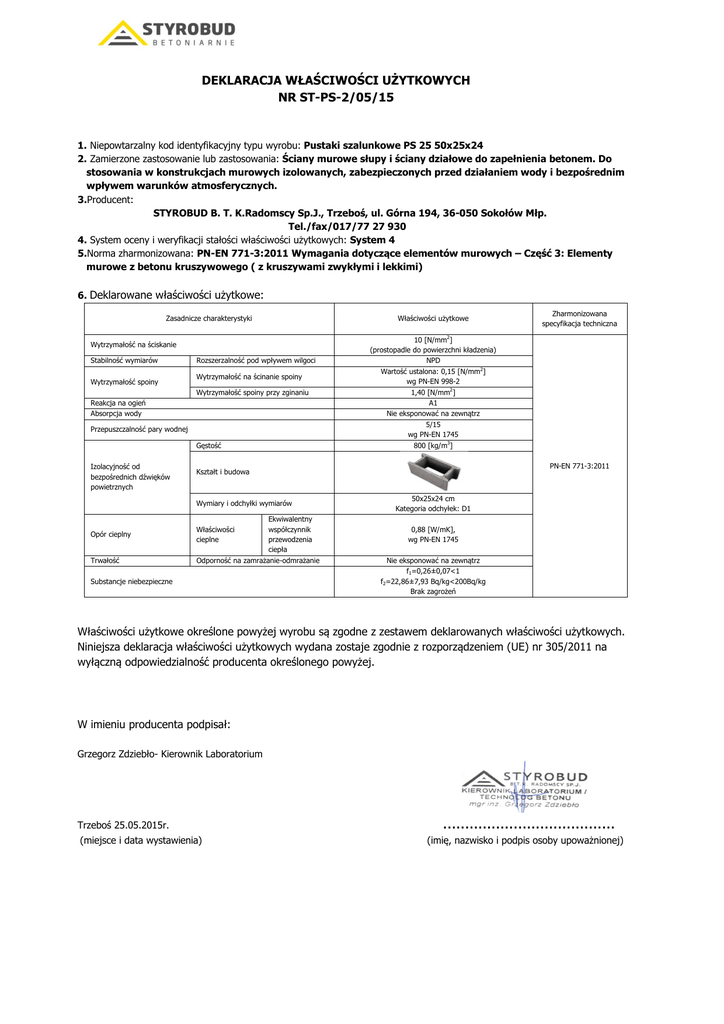 DEKLARACJA WŁAŚCIWOŚCI UŻYTKOWYCH NR ST-PS-2/05/15 1. Niepowtarzalny kod identyfikacyjny typu wyrobu: Pustaki szalunkowe PS 25 50x25x24 2. Zamierzone zastosowanie lub zastosowania: Ściany murowe słupy i ściany działowe do zapełnienia betonem. Do stosowania w konstrukcjach murowych izolowanych, zabezpieczonych przed działaniem wody i bezpośrednim wpływem warunków atmosferycznych. 3.Producent: STYROBUD B. T. K.Radomscy Sp.J., Trzeboś, ul. Górna 194, 36-050 Sokołów Młp. Tel./fax/017/77 27 930 4. System oceny i weryfikacji stałości właściwości użytkowych: System 4 5.Norma zharmonizowana: PN-EN 771-3:2011 Wymagania dotyczące elementów murowych – Część 3: Elementy murowe z betonu kruszywowego ( z kruszywami zwykłymi i lekkimi) 6. Deklarowane właściwości użytkowe: Zasadnicze charakterystyki Wytrzymałość na ściskanie Stabilność wymiarów Wytrzymałość spoiny Rozszerzalność pod wpływem wilgoci Wytrzymałość na ścinanie spoiny Wytrzymałość spoiny przy zginaniu Reakcja na ogień Absorpcja wody Przepuszczalność pary wodnej Gęstość Izolacyjność od bezpośrednich dźwięków powietrznych Trwałość Ekwiwalentny współczynnik przewodzenia ciepła Odporność na zamrażanie-odmrażanie Właściwości cieplne Substancje niebezpieczne Zharmonizowana specyfikacja techniczna 10 [N/mm2] (prostopadle do powierzchni kładzenia) NPD Wartość ustalona: 0,15 [N/mm2] wg PN-EN 998-2 1,40 [N/mm2] A1 Nie eksponować na zewnątrz 5/15 wg PN-EN 1745 800 [kg/m3] PN-EN 771-3:2011 Kształt i budowa Wymiary i odchyłki wymiarów Opór cieplny Właściwości użytkowe 50x25x24 cm Kategoria odchyłek: D1 0,88 [W/mK], wg PN-EN 1745 Nie eksponować na zewnątrz f1=0,26±0,07<1 f2=22,86±7,93 Bq/kg<200Bq/kg Brak zagrożeń Właściwości użytkowe określone powyżej wyrobu są zgodne z zestawem deklarowanych właściwości użytkowych. Niniejsza deklaracja właściwości użytkowych wydana zostaje zgodnie z rozporządzeniem (UE) nr 305/2011 na wyłączną odpowiedzialność producenta określonego powyżej. W imieniu producenta podpisał: Grzegorz Zdziebło- Kierownik Laboratorium Trzeboś 25.05.2015r. (miejsce i data wystawienia) ....................................... (imię, nazwisko i podpis osoby upoważnionej)