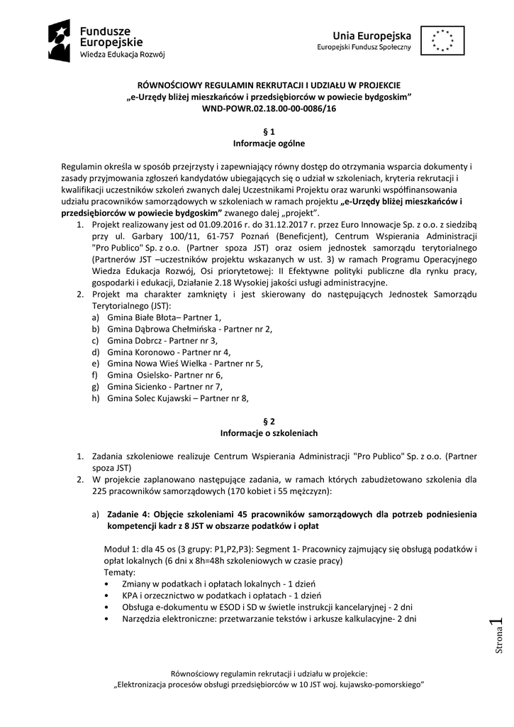 RÓWNOŚCIOWY REGULAMIN REKRUTACJI I UDZIAŁU W PROJEKCIE „e-Urzędy bliżej mieszkańców i przedsiębiorców w powiecie bydgoskim” WND-POWR.02.18.00-00-0086/16 §1 Informacje ogólne Regulamin określa w sposób przejrzysty i zapewniający równy dostęp do otrzymania wsparcia dokumenty i zasady przyjmowania zgłoszeń kandydatów ubiegających się o udział w szkoleniach, kryteria rekrutacji i kwalifikacji uczestników szkoleń zwanych dalej Uczestnikami Projektu oraz warunki współfinansowania udziału pracowników samorządowych w szkoleniach w ramach projektu „e-Urzędy bliżej mieszkańców i przedsiębiorców w powiecie bydgoskim” zwanego dalej „projekt”. 1. Projekt realizowany jest od 01.09.2016 r. do 31.12.2017 r. przez Euro Innowacje Sp. z o.o. z siedzibą przy ul. Garbary 100/11, 61-757 Poznań (Beneficjent), Centrum Wspierania Administracji "Pro Publico" Sp. z o.o. (Partner spoza JST) oraz osiem jednostek samorządu terytorialnego (Partnerów JST –uczestników projektu wskazanych w ust. 3) w ramach Programu Operacyjnego Wiedza Edukacja Rozwój, Osi priorytetowej: II Efektywne polityki publiczne dla rynku pracy, gospodarki i edukacji, Działanie 2.18 Wysokiej jakości usługi administracyjne. 2. Projekt ma charakter zamknięty i jest skierowany do następujących Jednostek Samorządu Terytorialnego (JST): a) Gmina Białe Błota– Partner 1, b) Gmina Dąbrowa Chełmińska - Partner nr 2, c) Gmina Dobrcz - Partner nr 3, d) Gmina Koronowo - Partner nr 4, e) Gmina Nowa Wieś Wielka - Partner nr 5, f) Gmina Osielsko- Partner nr 6, g) Gmina Sicienko - Partner nr 7, h) Gmina Solec Kujawski – Partner nr 8, §2 Informacje o szkoleniach 1. Zadania szkoleniowe realizuje Centrum Wspierania Administracji "Pro Publico" Sp. z o.o. (Partner spoza JST) 2. W projekcie zaplanowano następujące zadania, w ramach których zabudżetowano szkolenia dla 225 pracowników samorządowych (170 kobiet i 55 mężczyzn): Strona Moduł 1: dla 45 os (3 grupy: P1,P2,P3): Segment 1- Pracownicy zajmujący się obsługą podatków i opłat lokalnych (6 dni x 8h=48h szkoleniowych w czasie pracy) Tematy: • Zmiany w podatkach i opłatach lokalnych - 1 dzień • KPA i orzecznictwo w podatkach i opłatach - 1 dzień • Obsługa e-dokumentu w ESOD i SD w świetle instrukcji kancelaryjnej - 2 dni • Narzędzia elektroniczne: przetwarzanie tekstów i arkusze kalkulacyjne- 2 dni 1 a) Zadanie 4: Objęcie szkoleniami 45 pracowników samorządowych dla potrzeb podniesienia kompetencji kadr z 8 JST w obszarze podatków i opłat Równościowy regulamin rekrutacji i udziału w projekcie: „Elektronizacja procesów obsługi przedsiębiorców w 10 JST woj. kujawsko-pomorskiego” b) Zadanie 5: Objęcie szkoleniami 30 pracowników samorządowych dla potrzeb podniesienia kompetencji kadr z 8 JST w obszarze zarządzania nieruchomościami Moduł 2: dla 30 os (2 grupa: N1, N2): Segment 2 - Pracownicy zajmujący się zarządzaniem nieruchomościami, lokalami użytkowymi i nieruchomościami gruntowymi przeznaczonymi pod inwestycje lub promocją inwestycji w regionie (6 dni x 8h=48h szkoleniowych w czasie pracy) Tematy: • Zarządzanie samorządowym zasobem nieruchomości i zasobem Skarbu Państwa - 1 dzień • Procedury oddawania nieruchomości w użytkowanie wieczyste wraz z ustaleniem opłat i ich aktualizacją - 1 dzień • Praktyczne aspekty promocji i zbywania zasobów nieruchomości - 1 dzień • Obsługa e-dokumentu w ESOD i ePUAP 2 - 1 dzień • Narzędzia elektroniczne: przetwarzanie tekstów i arkusze kalkulacyjne w pracy urzędnika 2 dni c) Zadanie 6: Objęcie szkoleniami 150 pracowników samorządowych dla potrzeb podniesienia kompetencji kadr z 8 JST w obszarach niezbędnych dla poprawy efektywności zarządzania usługami dziedzinowymi Moduł 3: dla 60 os (4 grupy: K1, K2, K3, K4): Segment 3 - Pracownicy na stanowiskach kierowniczych (6 dni x 8h=48h szkoleniowych w czasie pracy) Tematy: • Zarządzanie personelem - 1 dzień • Zarządzanie satysfakcją - 1 dzień • Komunikacja i obsługa klienta - 1 dzień • Zarządzanie e-dokumentem w świetle KPA i instrukcji kancelaryjnej – 2 dni • Bezpieczeństwo w pracy z komputerem i przeglądarką internetową - 1 dzień Równościowy regulamin rekrutacji i udziału w projekcie: „Elektronizacja procesów obsługi przedsiębiorców w 10 JST woj. kujawsko-pomorskiego” Strona Moduł 5 dla 75 os. (5 grup: U1, U2, U3, U4, U5, ): Segment 5 - Pracownicy według potrzeb stanowisk pracy, zajmujący się przepływem korespondencji elektronicznej i obsługą klienta (6 dni x 8h=48h szkoleniowych w czasie pracy) Tematy: • Komunikacja i obsługa klienta - 1 dzień • KPA i orzecznictwo – 1 dzień • Obsługa e-dokumentu w ESOD i ePUAP 2 – 2 dni • Narzędzia elektroniczne: przetwarzanie tekstów i arkusze kalkulacyjne w pracy urzędnika 2 dni 2 Moduł 4: dla 15 os. (1 grupa: I): Segment 4 - Pracownicy zajmujący się obsługą informatyczną urzędu (6 dni x 8h=48h szkoleniowych w czasie pracy) Tematy: • Tworzenie kart usług z obsługą e-płatności-2 dni • Budowa i implementacja formularzy elektronicznych z zakresu podatków i opłat na ePUAP 2 -2 dni • Bezpieczeństwo sieci (Testy Penetracyjne)-1 dzień • Obsługa i konfiguracja urządzeń UTM/ Firewall-1 dzień Dodatkowo dla 10 osób: Certyfikowane szkolenia NSE4 FORTIGATE (2 dni dla 10 os) Certyfikowane szkolenia MS-20411 Administering Windows Server® 2012 (5 dni dla 10 os) 3. Wszystkie szkolenia są współfinansowane przez Unię Europejską w ramach Europejskiego Funduszu Społecznego. 4. Szkolenia odbywać się będą w godzinach pracy pracowników. 5. Jednostki samorządu terytorialnego objęte wsparciem w ramach projektu nie ponoszą kosztów uczestnictwa delegowanych pracowników w projekcie. Wymagany wkład własny JST (15,72% kosztów ogółem projektu) jest wnoszony w formie wynagrodzenia uczestników projektu oddelegowanych na szkolenia w projekcie w czasie pracy. 6.