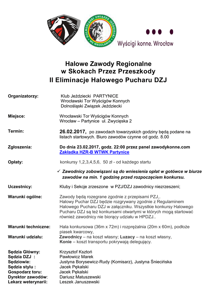 Halowe Zawody Regionalne w Skokach Przez Przeszkody II Eliminacje Halowego Pucharu DZJ Organizatorzy: Klub Jeździecki PARTYNICE Wrocławski Tor Wyścigów Konnych Dolnośląski Związek Jeździecki Miejsce: Wrocławski Tor Wyścigów Konnych Wrocław – Partynice ul. Zwycięska 2 Termin: 26.02.2017, po zawodach towarzyskich godziny będą podane na listach startowych. Biuro zawodów czynne od godz. 8.00 Zgłoszenia: Do dnia 23.02.2017, godz. 22:00 przez panel zawodykonne.com Zakładka HZR-B WTWK Partynice Opłaty: konkursy 1,2,3,4,5,6, 50 zł - od każdego startu Zawodnicy zobowiązani są do wniesienia opłat w gotówce w biurze zawodów na min. 1 godzinę przed rozpoczęciem konkursu. Uczestnicy: Kluby i Sekcje zrzeszone w PZJ/DZJ zawodnicy niezrzeszeni; Warunki ogólne: Zawody będą rozegrane zgodnie z przepisami PZJ,. Halowy Puchar DZJ będzie rozgrywany zgodnie z Regulaminem Halowego Pucharu DZJ w załączniku. Wszystkie konkursy Halowego Pucharu DZJ są też konkursami otwartymi w których mogą startować również zawodnicy nie biorący udziału w HPDZJ.. Warunki techniczne: Hala konkursowa (36m x 72m) i rozprężalnia (20m x 60m), podłoże piasek kwarcowy, Zawodnicy – na koszt własny; Luzacy – na koszt własny, Konie – koszt transportu pokrywają delegujący. Warunki udziału: Sędzia Główny: Sędzia DZJ : Sędziowie: Sędzia stylu : Gospodarz toru: Dyrektor zawodów: Lekarz weterynarii: Krzysztof Ksztoń Pawłowicz Marek Justyna Borysewicz-Rudy (Komisarz), Justyna Śniecińska Jacek Pękalski Jacek Pękalski Dariusz Matuszewski Leszek Januszewski Program Zawodów: 1. Konkurs Pony LL 80-90 cm (otwarty) HPDZJ Konkurs zwykły (art. 238.2.1) 2. Konkurs LL 80-90 cm , Konkurs dokładności (art.238.1.1) 3. Konkurs L –Licencyjny 4. Konkurs Junior Młodszy L 100 cm (otwarty) HPDZJ Konkurs dwufazowy (I faza zwykły, II faza zwykły (art.274.5.3) 5. Konkurs Junior P 110 cm (otwarty) HPDZJ Konkurs dwufazowy ( I faza zwykły, II faza zwykły (art.274.5.3 ) 6. Konkurs Senior N 120 cm (otwarty) HPDZJ Konkurs dwufazowy ( zwykły art.238.2.1) 7. Konkurs C 130 cm Konkurs zwykły (art.238.2.1) Listy startowe: Sprawy organizacyjne: Listy będą widoczne na stronie: www.zawodykonne.com Zakładka HZR-B WTWK Partynice najpóźniej 25.02.2017 od godz. 18.00. Zgłoszenia powinny zawierać nr PZJ/ DZJ konia, imię i nazwisko i nr PZJ/ DZJ zawodnika, klub oraz nr konkursu i ilość przejazdów, należy też podać chęć uczestnictwa w Halowym Pucharze DZJ, w jakiej kategorii oraz podać rok urodzenia uczestnika w kategoriach młodzieżowych. Zmiany na listach startowych po terminie zgłoszeń lub w dniu zawodów: opłata 40 zł. Dokumentacja zgodnie z przepisami PZJ. Obowiązują aktualne badania weterynaryjne koni oraz szczepienia. Bez w/w dokumentów konie nie będą dopuszczone do startów! Osoby nieletnie proszone są o przedstawienie pisemnej zgody rodziców na start w zawodach. Na całym terenie zawodów, wszystkie osoby dosiadające koni obowiązuje noszenie prawidłowo zapiętego ochronnego nakrycia głowy (kask) Organizator nie ponosi odpowiedzialności za wypadki, szkody i kradzieże podczas zawodów. Organizator zastrzega sobie prawo do zmiany w programie zawodów, a w przypadku niewystarczającej liczby zgłoszeń - do odwołania niektórych konkursów lub ograniczenia puli nagród finansowych. Prosimy o dostarczenie paszportów koni do biura zawodów. Przypominamy o obowiązku posiadania numerów startowych. Wszelkie nieczystości pochodzenia zwierzęcego należy usuwać do gnojownika usytułowanego koło stajni sportowej- czterdziesto boksowej. Przyczepy i koniowozy prosimy parkować wyłącznie na miejscu wyznaczonym przez WTWK Partynice- parking przy stajni letniej w załączeniu mapa. Jeżeli ktoś chce zamówić boks na zawody prosimy to zrobić przez panel zawodykonne.com zakładka HZT-B Partynice oraz wysłać maila na adres [email protected], za boks należy też uregulować wpłatę na konto Klub Jeździecki Partynice numer konta 42 1140 2017 0000 4402 1302 0203 do dnia 23.02.2017 roku, bez wpłaty na konto nie gwarantujemy otrzymania boksów !!!! Kolejność rozgrywania konkursów : 1. HZT konkurs 1 2. HZR konkurs 1 3. HZT konkurs 2 4. HZR konkurs 2 5. HZT Konkurs 3 6. HZR konkurs 3 7. HZR konkurs 4 8. HZR konkurs 5 9. HZR konkurs 6 10. HZR konkurs 7 Za nieprzestrzegania ustaleń osoby naruszające będą ponosiły konsekwencje finansowe W PRZYPADKU REZYGNACJI Z UDZIAŁU W ZAWODACH, INFORMACJE NALEŻY PODAĆ NAJPÓŹNIEJ DO SOBOTY 25.02.2017 r. DO GODZINY 15:00 NA ADRES: [email protected] ORAZ ANULOWAĆ ZGŁOSZENIE NA PANELU www.zawodykonne.com NAGRODY KONKURSY OTWARTE : Konkurs 1.LL - 80-90 cm Planowane nagrody dla zwycięzców Flot’s i za zajęte miejsca (25% startujących) 2.L – 100 cm Flot’s i za zajęte miejsca (25% startujących) 3.Legzaminacyjny 4. P – 110 cm Flot’s i za zajęte miejsca (25% startujących) Nagrody finansowe za miejsca 1-3 (I-200 zł, II- 150 zł, III-100 zł) 5. N – 120 cm Nagrody finansowe za miejsca 1-3 (I-250 zł, II-200 zł, III-150 zł) 6. N – 120 cm Flot’s i za zajęte miejsca (25% startujących) 7. C – 130 cm Nagrody finansowe za miejsca 1-3 (I-300 zł, II-250 zł, III-200 zł) Suma nagród finansowych to: 1800 zł W przypadku małej ilości zgłoszeń organizator zastrzega sobie prawo do zmniejszenia nagród finansowych o 50% : 1. dla konkursu P jeżeli liczba koni będzie mniej niż 15. 2. dla konkursu N jeżeli liczba koni będzie mniejsza niż 10. 3. dla konkursu C jeżeli liczba koni będzie mniejsza niż 6. KODEKS POSTĘPOWANIA Z KONIEM: Polski Związek Jeździecki prosi wszystkie osoby zaangażowane w jakikolwiek sposób w sporty konne, o przestrzeganie poniżej przedstawionego kodeksu oraz zasady, że dobro konia jest najważniejsze. Dobro konia musi być zawsze i wszędzie uwzględniane w sportach konnych i nie może być podporządkowane współzawodnictwu sportowemu ani innym celom np. komercyjnym. I. Na w