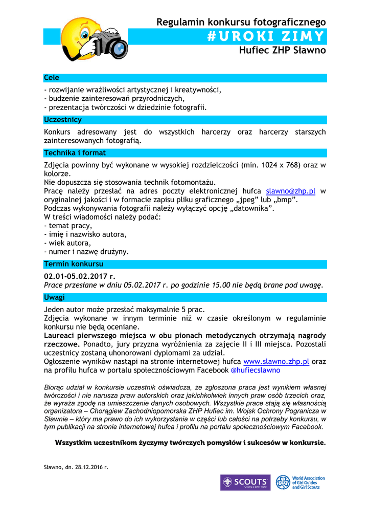 Regulamin konkursu fotograficznego #UROKI ZIMY Hufiec ZHP Sławno Cele - rozwijanie wrażliwości artystycznej i kreatywności, - budzenie zainteresowań przyrodniczych, - prezentacja twórczości w dziedzinie fotografii. Uczestnicy Konkurs adresowany jest do wszystkich harcerzy oraz harcerzy starszych zainteresowanych fotografią. Technika i format Zdjęcia powinny być wykonane w wysokiej rozdzielczości (min. 1024 x 768) oraz w kolorze. Nie dopuszcza się stosowania technik fotomontażu. Pracę należy przesłać na adres poczty elektronicznej hufca [email protected] w oryginalnej jakości i w formacie zapisu pliku graficznego „jpeg” lub „bmp”. Podczas wykonywania fotografii należy wyłączyć opcję „datownika”. W treści wiadomości należy podać: - temat pracy, - imię i nazwisko autora, - wiek autora, - numer i nazwę drużyny. Termin konkursu 02.01-05.02.2017 r. Prace przesłane w dniu 05.02.2017 r. po godzinie 15.00 nie będą brane pod uwagę. Uwagi Jeden autor może przesłać maksymalnie 5 prac. Zdjęcia wykonane w innym terminie niż w czasie określonym w regulaminie konkursu nie będą oceniane. Laureaci pierwszego miejsca w obu pionach metodycznych otrzymają nagrody rzeczowe. Ponadto, jury przyzna wyróżnienia za zajęcie II i III miejsca. Pozostali uczestnicy zostaną uhonorowani dyplomami za udział. Ogłoszenie wyników nastąpi na stronie internetowej hufca www.slawno.zhp.pl oraz na profilu hufca w portalu społecznościowym Facebook @hufiecslawno Biorąc udział w konkursie uczestnik oświadcza, że zgłoszona praca jest wynikiem własnej twórczości i nie narusza praw autorskich oraz jakichkolwiek innych praw osób trzecich oraz, że wyraża zgodę na umieszczenie danych osobowych. Wszystkie prace stają się własnością organizatora – Chorągiew Zachodniopomorska ZHP Hufiec im. Wojsk Ochrony Pogranicza w Sławnie – który ma prawo do ich wykorzystania w części lub całości na potrzeby konkursu, w tym publikacji na stronie internetowej hufca i profilu na portalu społecznościowym Facebook. Wszystkim uczestnikom życzymy twórczych pomysłów i sukcesów w konkursie. Sławno, dn. 28.12.2016 r.
