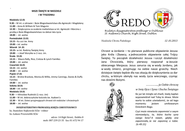 3 MSZE ŚWIĘTE W NIEDZIELE I W TYGODNIU Niedziela 12.01 9.30 – W int. o zdrowie i Boże Błogosławieństwo dla Agnieszki i Magdaleny 11.00 – Anna & William & Tom Maguire 12.30 – Dziękczynna za ocalenie małżeństwa w int. Agnieszki i Marcina z prośbą o Boże Błogosławieństwo na dalsze lata życia 18.00 – int. wolna Poniedziałek 13.01 13.15 - Ku czci św. Anny 19.00 – int. wolna Wtorek 14 .01 13.15– w int. Rodziny Świętej Anny 19.00 - + Józef Worytko w 2 rocz. śm. Środa 15.01 13.15 – Maura Rally, Rice, Cretow & Lynch Families 19.00 – int. wolna Czwartek 16.01 13.15 - int. wolna 19.00 – int. wolna Piątek 17.01 13.15 - Brickie Brackow, Monica & Willie, Jimmy Cannings, Davies & Duffy Families 19.00 – int. wolna Sobota 18.01 18.00 – int. wolna Niedziela 19.01 9.30 – + Mirosław Rudnicki (1 rocz. śm) 11.00 – W int. dobroczyńców kościoła św. Audoen’a 12.30 – W int. Dzieci przyjmujących chrzest ich rodziców i chrzestnych 18.00 – int. wolna DUSZPASTERSTWO PROWADZĄ KSIĘŻA CHRYSTUSOWCY ks. Stanisław Hajkowski SChr –rektor ks. Łukasz Przewieślik SChr adres: 14 High Street; Dublin 8 mob: 087 239 23 35 fax: 01 672 94 17 http://www.polish-chaplaincy.ie e-mail: [email protected] Niedziela Chrztu Pańskiego 12 .01.2013 Chrzest w Jordanie – to pierwsze publiczne objawienie Jezusa jako Króla i Zbawcy, a jednocześnie objawienie całej Trójcy Świętej. To początek działalności Jezusa i szczyt działalności Jana Chrzciciela, który pierwszy rozpoznał w Jezusie obiecanego Mesjasza. Jezus zanurza się w wody Jordanu, jak w wody śmierci, przyjmując na siebie nasze grzechy. Niech dzisiejsze święto będzie dla nas okazją do dziękczynienia za dar chrztu, w którym obmyły nas wody życia wiecznego, czyniąc nas dziećmi Bożymi. …………….., ja Ciebie chrzczę w Imię Ojca i Syna i Ducha Świętego Ile już lat minęło od chwili, kiedy kapłan wypowiedział nad Tobą te słowa. Może warto to sobie uświadomić, że od tego momentu jestem umiłowanym Dzieckiem Boga. Czyż może niewiasta zapomnieć o swym niemowlęciu, ta, która kocha syna swego łona? A nawet, gdyby ona zapomniała, Ja nie zapomnę o tobie. (Iz 49.15) OGŁOSZENIA DUSZPASTERSKIE ŚPIEWAJ RAZEM Z NAMI… Po krótkiej, świąteczno-noworocznej przerwie zapraszamy do wspólnego działania. Jeśli potrafisz śpiewać, może grać, a może po prostu chcesz z nami pobyć i nauczyć się wykorzystywać swój talent (może jeszcze ukryty) to zapraszamy w każdą niedzielę o godz. 16.30 do salki św. Anny.. Przyjdź, zobacz, posłuchaj i zaśpiewaj razem z nami. KURS PRRZEDMAŁŻEŃSKI 14 -16 marca 2014 PLAN 25.10 Piątek – 19.00 Katecheza, 26.10 Sobota – 11.00 – 13.00 – poradnia Małżeńska 13.00 – 17.00 Katechezy, 27.10 Niedziela zakończenie podczas Mszy Świętej o godz. 12.30 BIULETYN ELEKTRONICZNY Zapraszam do nowego sposobu otrzymywania naszego biuletynu CREDO. Napisz do nas na adres: [email protected]. Gotowy numer biuletynu w formie PDF otrzymasz na swoją skrzynkę w każdą sobotę. KOLEKTA POPRZEDNIEJ NIEDZIELI I Kolekta II Kolekta Ofiary w kopertach 495€ 190 € 180€ Bóg zapłać za składane ofiary 1. Serdecznie dziękujemy wszystkim, którzy poświęcili swój czas, by pomóc w sprzątaniu kościoła i uprzątnięciu dekoracji świątecznych. Zapraszamy na Mszę Świętą sprawowaną w intencji wszystkich dobroczyńców kościoła św. Audoen’a w przyszłą niedzielę o godz.11.00 2. Dziś wznawiamy zbiórkę pieniędzy na ogrzewania naszego kościoła. Ofiary można składać po każdej Mszy Świętej niedzielnej. W okresie od 10 listopada do 5 stycznia wykorzystaliśmy 2000 litrów oleju, za który zapłaciliśmy 1902€ (zbiórka wyniosła 1955€). Następne 2000 l zostało zamówione 3. Kolejne spotkanie dla dzieci przygotowujących się do I Komunii Świętej i ich rodziców w niedzielę 19 stycznia po Mszy Świętej o godz.12.30 4. Katecheza przed chrztem, który będzie udzielany 19 stycznia podczas Mszy świętej o godz. 12.30, odbędzie się w piątek 17 stycznia po Mszy Świętej wieczornej w salce św. Anny. Zapraszamy rodziców, rodziców chrzestnych, a także tych, którzy zostali poproszeni, by być chrzestnymi w Polsce. 5. Wszystkim solenizantom i jubilatom nadchodzącego tygodnia składamy serdeczne życzenia 6. W liturgii wspominamy: W niedzielę – Święto Chrztu Pańskiego W piątek – św. Antoniego, opata
