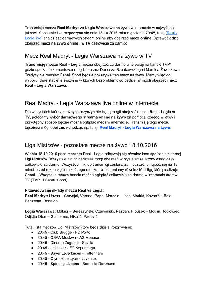 Transmisja meczu Real Madryt vs Legia Warszawa na żywo w internecie w najwyższej jakości. Spotkanie live rozpoczyna się dnia 18.10.2016 roku o godzinie 20:45, tutaj (Real Legia live) znajdziesz darmowych stream online aby obejrzeć m ecz online. Sprawdź gdzie obejrzeć mecz na żywo online i w TV całkowicie za darmo: Mecz Real Madryt - Legia Warszawa na zywo w TV Transmisję meczu Real - Legia można obejrzeć za darmo w telewizji na kanale TVP1 gdzie spotkanie komentowane będzie przez Dariusza Szpakowskiego i Marcina Żewłakowa. Tradycyjnie również Canal+Sport będzie pokazywał ten mecz na żywo. Mamy więc do wyboru dwie stacje telewizyjne w których bezproblemowo będziemy mogli obejrzeć mecz Real - Legia Warszawa. Real Madryt - Legia Warszawa live online w internecie Dla wszystkich którzy z różnych przyczyn nie będą mogli obejrzeć meczu Real - Legia w TV, polecamy wybór darmowego streama online na żywo za pomocą którego w łatwy i przystępny sposób będzie można oglądać mecz w internecie. Transmisję tego meczu będziesz mógł obejrzeć wchodząc np. tutaj: Real Madryt - Legia Warszawa na żywo. Liga Mistrzów - pozostałe mecze na żywo 18.10.2016 W dniu 18.10.2016 poza meczem Real - Legia odbywają się również inne spotkania elitarnej Ligi Mistrzów. Wszystkie z nich będziesz mógł obejrzeć korzystając ze strony estadios.pl całkowicie za darmo. Wszystkie linki do transmisji zostaną zamieszczone najpóźniej na 15 minut przed rozpoczęciem każdego meczu. Udostępniamy również Multiligę którą realizuje Canal+. Wszystkie mecze będzie można oglądać całkowicie za darmo w internecie oraz w TV (TVP1 i Canal+Sport). Przewidywane składy meczu Real vs Legia: Real Madryt: Navas – Carvajal, Varane, Pepe, Marcelo – Isco, Modrić, Kovacić – Bale, Benzema, Ronaldo Legia Warszawa: Malarz – Bereszyński, Czerwiński, Pazdan, Hlousek – Moulin, Jodłowiec, Odjidja Ofoe – Guilherme, Nikolić, Radović Tutaj lista meczów Ligi Mistrzów które będą dzisiaj rozgrywane: ● 20:45 - Club Brugge - FC Porto ● 20:45 - CSKA Moskwa - AS Monaco ● 20:45 - Dinamo Zagrzeb - Sevilla ● 20:45 - Leicester - FC Kopenhaga ● 20:45 - Bayer Leverkusen - Tottenham ● 20:45 - Olympique Lyon - Juventus ● 20:45 - Sporting Lizbona - Borussia Dortmund Wszystkie te mecze będziesz mógł obejrzeć na zywo za darmo online klikając w ten link (Liga Mistrzów online ) Znajdziesz u nas również wszystkie pozostałe mecze Ligi Mistrzów klikając tutaj.