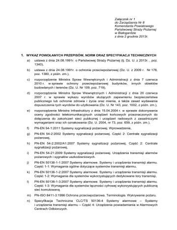 Załącznik nr 1 do Zarządzenia Nr 8 Komendanta Powiatowego Państwowej Straży Pożarnej w Białogardzie z dnia 2 grudnia 2013r. 1. WYKAZ POWOŁANYCH PRZEPISÓW, NORM ORAZ SPECYFIKACJI TECHNICZNYCH a) ustawa z dnia 24.08.1991r. o Państwowej Straży Pożarnej (tj. Dz. U. z 2013r. , poz. 1340), b) ustawa z dnia 24.08.1991r. o ochronie przeciwpożarowej (Dz. U. z 2009 r. Nr 178, poz. 1380, z późn. zm.), c) rozporządzenie Ministra Spraw Wewnętrznych i Administracji z dnia 7 czerwca 2010 r. w sprawie ochrony przeciwpożarowej budynków, innych obiektów budowlanych i terenów (Dz. U. Nr 109, poz. 719), d) rozporządzenie Ministra Spraw Wewnętrznych i Administracji z dnia 20 czerwca 2007 r. w sprawie wykazu wyrobów służących zapewnieniu bezpieczeństwa publicznego lub ochronie zdrowia i życia oraz mienia, a także zasad wydawania dopuszczenia tych wyrobów do użytkowania (Dz. U. Nr 143, poz. 1002, z późn. zm.), e) rozporządzenie Ministra Infrastruktury z dnia 15.04.2004 r. w sprawie dokonywania oceny zgodności telekomunikacyjnych urządzeń końcowych przeznaczonych do dołączenia do zakończeń sieci publicznej i urządzeń radiowych z zasadniczymi wymaganiami oraz ich oznakowania (Dz. U. 2004, nr 73, poz. 659, z późn. zm.), f) PN-EN 54-1:2011 Systemy sygnalizacji pożarowej. Wprowadzenie, g) PN-EN 54-2:2002 Systemy sygnalizacji pożarowej. Część 2: Centrale sygnalizacji pożarowej, h) PN-EN 54-2:2002/A1:2007 Systemy sygnalizacji pożarowej. Część 2: Centrale sygnalizacji pożarowej, i) PN-EN 54-21:2009 Systemy sygnalizacji pożarowej. Urządzenia transmisji alarmów pożarowych i sygnałów uszkodzeniowych. j) PN-EN 50136-1-1:2007 Systemy alarmowe. Systemy i urządzenia transmisji alarmu. Część 1-1: Wymagania ogólne dotyczące systemów transmisji alarmu, k) PN-EN 50136-1-2:2007 Systemy alarmowe. Systemy i urządzenia transmisji alarmu. Część 1-2: Wymagania dla systemów wykorzystujących dedykowane tory transmisji, l) PN-EN 50136-1-3:2007 Systemy alarmowe. Systemy i urządzenia transmisji alarmu. Część 1-3: Wymagania dla systemów łączności cyfrowej wykorzystujących publiczną sieć komutowaną. m) PN-ISO 8411-3:1996 Ochrona przeciwpożarowa. Terminologia. Wykrywanie pożaru. n) Specyfikacja Techniczna CLC/TS 50136-4 Systemy alarmowe – Systemy i urządzenia transmisji alarmu – Część 4: Urządzenia powiadamiania w Alarmowych Centrach Odbiorczych. 2 o) Specyfikacja Techniczna PKN-CEN/TS 54-14:2006 Systemy sygnalizacji pożarowej – Część 14: Wytyczne planowania, projektowania, instalowania, odbioru i konserwacji. 2. DEFINICJE I OKREŚLENIA Abonent Osoba fizyczna lub prawna odpowiedzialna za organizację systemu sygnalizacji pożarowej i systemu transmisji sygnału alarmu pożarowego w obiekcie, która jest stroną umowy z Operatorem. Centrala sygnalizacji pożarowej (CSP) Urządzenie, poprzez które czujki pożarowe mogą być zasilane energią, służące do potwierdzenia wykrytego sygnału i wywołania alarmu pożarowego, przesłania sygnału o wykryciu pożaru, poprzez układ transmisji alarmów pożarowych, do straży pożarnej lub automatycznych urządzeń gaśniczych oraz automatycznej kontroli prawidłowego funkcjonowania systemu sygnalizacji pożarowej. Centrum odbiorcze alarmów pożarowych (COAP) Miejsce z ciągłą obsługą, z którego dysponowane są siły i środki będące jednostkami ochrony przeciwpożarowej, wskazane przez właściwego miejscowo komendanta powiatowego/miejskiego Państwowej Straży Pożarnej, wyposażone w stację odbiorczą alarmów pożarowych oraz system wizualizacji informacji. Centrum monitorowania operatora systemu (CMOS) Miejsce z ciągłą obsługą, należące do operatora systemu monitoringu pożarowego, z którego nadzorowany jest stan systemu transmisji alarmów pożarowych i sygnałów uszkodzeniowych oraz skąd dysponowany jest serwis tego systemu. Może być zintegrowane z centrum odbiorczym sygnałów uszkodzeniowych. Centrum monitorowania operatora systemu (CMOS) wchodzi w skład Centrum Odbiorczego Operatora. Centrum odbiorcze sygnałów uszkodzeniowych (COSU) Miejsce z ciągłą obsługą, należące do operatora systemu monitoringu pożarowego, odbierające sygnały uszkodzeniowe z urządzenia transmisji alarmów pożarowych i sygnałów uszkodzeniowych (UTASU), z którego mogą być również powiadamiane firmy serwisujące systemy sygnalizacji pożarowej o uszkodzeniach tych systemów. Zawiera stację odbiorczą sygnałów uszkodzeniowych. Centrum odbiorcze sygnałów uszkodzeniowych (COSU) wchodzi w skład Centrum Odbiorczego Operatora. Dwustopniowe alarmowanie Jest to alarmowanie polegające na takim zaprogramowaniu systemu sygnalizacji pożarowej, aby po wykryciu pożaru przez element liniowy (np. czujkę pożarową) w centrali sygnalizacji pożarowej (CSP) był sygnalizowany alarm wstępny (alarm I stopnia) przez czas T1 przewidziany na zgłoszenie się personelu. Alarm I stopnia jest przeznaczony wyłącznie dla przeszkolonego personelu obsługującego CSP. Brak reakcji personelu w czasie T1 powoduje automatyczne przejście CSP w stan alarmu głównego (alarm II stopnia). Alarm II stopnia jest przeznaczony dla użytkowników obiektu chronionego instalacją sygnalizacji pożarowej. Moment potwierdzenia przyjęcia alarmu wstępnego przez personel powoduje wyciszenie sygnalizacji akustycznej w CSP i jest początkiem odliczania czasu T2 przeznaczonego na 3 rozpoznanie zagrożenia pożarowego. Jeżeli w czasie T2 personel nie skasuje alarmu wstępnego, CSP automatycznie przejdzie w stan alarmu głównego. W czasie T2 alarm wstępny może być skasowany tylko wtedy, gdy personel ugasi pożar lub stwierdzi, że jest to alarm fałszywy. Łącze publicznych sieci telekomunikacyjnych ISDN Łącze cyfrowe z integracją usług (ang. Integrated Services Digital Network), zapewniające realizację wielu usług telekomunikacyjnych w jednolitym standardzie cyfrowym. System ISDN oparto o metody pr