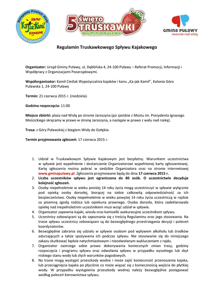 Regulamin Truskawkowego Spływu Kajakowego Organizator: Urząd Gminy Puławy, ul. Dęblioska 4, 24-100 Puławy – Referat Promocji, Informacji i Współpracy z Organizacjami Pozarządowymi. Współorganizator: Kamil Cieślak Wypożyczalnia kajaków i kanu „Ka-jak-Kamil”, Kolonia Góra Puławska 1, 24-100 Puławy Termin: 21 czerwca 2015 r. (niedziela). Godzina rozpoczęcia: 11:00 Miejsce zbiórki: plaża nad Wisłą po stronie Jaroszyna (po zjeździe z Mostu im. Prezydenta Ignacego Mościckiego skręcamy w prawo w stronę Jaroszyna, a następie w prawo z wału nad rzekę). Trasa: z Góry Puławskiej z biegiem Wisły do Gołębia. Termin przyjmowania zgłoszeo: 17 czerwca 2015 r. 1. Udział w Truskawkowym Spływie Kajakowym jest bezpłatny. Warunkiem uczestnictwa w spływie jest wypełnienie i dostarczenie Organizatorowi wypełnionej karty zgłoszeniowej. Kartę zgłoszenia można pobrad w siedzibie Organizatora oraz na stronie internetowej www.gminapulawy.pl. Zgłoszenia przyjmowane będą do dnia 17 czerwca 2015 r. 2. Liczba uczestników spływu jest ograniczona do 80 osób. O uczestnictwie decyduje kolejnośd zgłoszeo. 3. Osoby niepełnoletnie w wieku poniżej 14 roku życia mogą uczestniczyd w spływie wyłącznie pod opieką osoby dorosłej, biorącej na siebie całkowitą odpowiedzialnośd za ich bezpieczeostwo. Osoby niepełnoletnie w wieku powyżej 14 roku życia uczestniczą w rajdzie za pisemną zgodą rodzica lub opiekuna prawnego. Osoba dorosła, która zadeklarowała opiekę nad niepełnoletnim uczestnikiem musi wziąd udział w spływie. 4. Organizator zapewnia kajaki, wiosła oraz kamizelki asekuracyjne uczestnikom spływu. 5. Uczestnicy zobowiązani są do zapoznania się z treścią Regulaminu oraz jego stosowania. Na trasie spływu uczestnicy zobowiązani są do bezwzględnego przestrzegania decyzji i poleceo koordynatorów. 6. Bezwzględnie zabrania się udziału w spływie osobom pod wpływem alkoholu lub środków odurzających a także spożywania ich podczas spływu. Nie stosowanie się do niniejszego zakazu skutkowad będzie natychmiastowym i nieodwołanym wykluczeniem z rajdu. 7. Organizator zastrzega sobie prawo dokonywania koniecznych zmian trasy, godziny rozpoczęcia i programu spływu oraz odwołania spływu w przypadku wysokiego lub zbyt niskiego stanu wody lub złych warunków pogodowych. 8. Na trasie mogą wystąpid przeszkody wodne i może zajśd koniecznośd przenoszenia kajaka, lub przeciągnięcia kajaka po płyciźnie co może wiązad się z koniecznością wejścia do płytkiej wody. W przypadku wystąpienia przeszkody wodnej należy bezwzględnie postępowad według poleceo kierownictwa spływu. 9. Każdy uczestnik biorący udział w spływie oświadcza, że potrafi pływad oraz że ta umiejętnośd oraz stan zdrowia uczestnika pozwalają na podjęcie przez niego wysiłku związanego z uczestnictwem w spływie. 10. Zabrania się płynięcia na wierzchu kajaka, w innym sposób niż typowy, zgodny z przeznaczeniem kajaka. 11. Zabrania się wyprzedzania instruktora prowadzącego spływ oraz pozostawania za instruktorem zamykającym spływ. 12. Na spływie obowiązuje zakaz kąpieli. 13. Wszyscy uczestnicy spływu zobowiązani są do płynięcia w zapiętej kamizelce. 14. Organizator nie bierze na siebie odpowiedzialności za rzeczy zgubione, szkody osobowe, rzeczowe i majątkowe, które wystąpią przed, w trakcie lub po spływie kajakowym. Cenne przedmioty (dokumenty osobiste, telefony, aparaty fotograficzne etc.) powinny byd zabezpieczone przed zamoczeniem i utonięciem. 15. Uczestnik spływu ponosi pełne koszty utraconego lub zniszczonego sprzętu pływającego oraz pokrywa wyrządzone przez siebie szkody. 16. Uczestnik spływu zobowiązuje się do pokrycia wszelkich strat materialnych spowodowanych przez siebie na rzecz organizatora lub osób trzecich. 17. Każdy uczestnik spływu jest zobowiązany jest do przestrzegania przepisów prawa wodnego, ochrony przyrody oraz karty turysty. Za skutki naruszenia powyższych przepisów, uczestnik spływu odpowiada osobiście. 18. Uczestnik zobowiązuje się do dbania o sprzęt wypożyczony od organizatora i zabezpieczenie go po spływie zgodnie z zaleceniami kierownictwa spływu. 19. Organizator zaleca, aby każdy uczestnik posiadał okulary chroniące oczy przed słoocem, wiatrem, kurzem i gałęziami drzew, ubranie dostosowane do aury, wodoszczelnie zapakowaną zmianę odzieży, buty w których można wejśd do wody, napoje chłodzące oraz wysokokaloryczną żywnośd. 20. Uczestnicy spływu ubezpieczeni są od NNW. 21. Uczestnik rajdu wypełniając i podpisując Kartę Zgłoszeniową oświadcza, że zapoznał się i akceptuje warunki niniejszego Regulaminu. 22. Uczestnik rajdu składając Kartę Zgłoszeniową oświadcza, że wyraża zgodę na przetwarzanie swoich danych osobowych dla potrzeb organizacji rajdu oraz działao informacyjnych i promocyjnych prowadzonych przez Organizatora. 23. Uczestnik rajdu składając Kartę Zgłoszeniową oświadcza, że wyraża nieodpłatną zgodę na utrwalanie podczas rajdu swojego wizerunku i wykorzystywania go dla potrzeb działao informacyjnych i promocyjnych prowadzonych przez Organizatora.