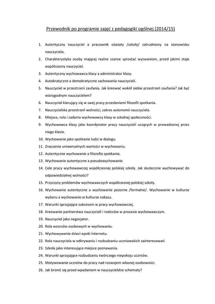 Przewodnik po programie zajęć z pedagogiki ogólnej (2014/15) 1. Autentyczny nauczyciel a pracownik oświaty /szkoły/ zatrudniony na stanowisku nauczyciela. 2. Charakterystyka osoby mającej realne szanse sprostać wyzwaniom, przed jakimi staje współczesny nauczyciel. 3. Autentyczny wychowawca klasy a administrator klasy. 4. Autokratyczne a demokratyczne zachowania nauczycieli. 5. Nauczyciel w przestrzeni zaufania. Jak kreować wokół siebie przestrzeń zaufania? Jak być wiarygodnym nauczycielem? 6. Nauczyciel kierujący się w swej pracy przesłaniami filozofii spotkania. 7. Nauczycielska przestrzeń wolności, zakres autonomii nauczyciela. 8. Miejsce, rola i zadania wychowawcy klasy w szkolnej społeczności. 9. Wychowawca klasy jako koordynator pracy nauczycieli uczących w prowadzonej przez niego klasie. 10. Wychowanie jako spotkanie ludzi w dialogu. 11. Znaczenie uniwersalnych wartości w wychowaniu. 12. Autentyczne wychowanie a filozofia spotkania. 13. Wychowanie autentyczne a pseudowychowanie. 14. Cele pracy wychowawczej współczesnej polskiej szkoły. Jak skutecznie wychowywać do odpowiedzialnej wolności? 15. Przyczyny problemów wychowawczych współczesnej polskiej szkoły. 16. Wychowanie autentyczne a wychowanie pozorne /formalne/. Wychowanie w kulturze wyboru a wychowanie w kulturze nakazu. 17. Warunki sprzyjające sukcesom w pracy wychowawczej. 18. Kreowanie partnerstwa nauczycieli i rodziców w procesie wychowawczym. 19. Nauczyciel jako negocjator. 20. Rola wzorców osobowych w wychowaniu. 21. Wychowywanie dzieci epoki Internetu. 22. Rola nauczyciela w odkrywaniu i rozbudzaniu uczniowskich zainteresowań. 23. Szkoła jako interesujące miejsce poznawania. 24. Warunki sprzyjające rozbudzaniu twórczego niepokoju uczniów. 25. Motywowanie uczniów do pracy nad rozwojem własnej osobowości. 26. Jak bronić się przed wpadaniem w nauczycielskie schematy? 27. Obszar autonomii szkoły. Polska szkoła w przestrzeni wolności – fikcja czy rzeczywistość? 28. Edukacja wg klasycznych liberałów. 29. Model szkoły opartej na założeniach myśli liberalnej – cele, najważniejsze zadania nauczyciela, struktura wewnętrzna, relacje nauczyciel – uczeń. 30. Edukacja wg konserwatystów. 31. Model szkoły opartej na założeniach myśli konserwatywnej – cele, najważniejsze zadania nauczyciela, struktura wewnętrzna, relacje nauczyciel – uczeń. 32. Libertariańskie spojrzenie na edukację. Szkoła libertariańska. 33. Pedagogika krytyczna – model szkoły kreowanej przez zwolenników tej pedagogiki. 34. Antypedagogika – podstawowe założenia i cele. 35. Wpływ pragmatyzmu na edukację. 36. Model szkoły inspirowanej pragmatyzmem – cele, najważniejsze zadania nauczyciela, struktura wewnętrzna, relacje nauczyciel – uczeń. 37. Wpływ progresywizmu na edukację. 38. Model szkoły inspirowanej progresywizmem - cele, najważniejsze zadania nauczyciela, struktura wewnętrzna, relacje nauczyciel – uczeń. 39. W kręgu polskiej myśli pedagogicznej – Janusz Korczak, Maria Grzegorzewska, Aleksander Kamiński. 40. Realizm wychowawczy Janusza Korczaka. Charakterystyka wychowawcy zainspirowanego korczakowską pedagogiką. 41. Postać nauczyciela wyłaniająca się z przemyśleń Marii Grzegorzewskiej. 42. Model szkoły zakorzeniony w myśli pedagogicznej Aleksandra Kamińskiego. 43. Pedagogiki alternatywne – przegląd. 44. Dokumenty kreujące tożsamość szkoły. Statut szkoły jako podstawowy dokument prawa wewnątrzszkolnego. 45. Awans zawodowy nauczycieli, ze szczególnym uwzględnieniem zadań i wymagań przed jakimi staje nauczyciel – stażysta. 46. Polski system oświatowy. Cele pracy szkół poszczególnych typów. 47. Myślenie osadzone w filozofii spotkania kluczem do kreowania dobrej szkoły. Model szkoły zakorzenionej w filozofii spotkania. 48. Warunki skutecznego nauczycielskiego działania. 49. Edukacja jako proces kształtowania umiejętności ciągłego osobistego rozwoju /”konkurowania ze sobą”, „stawania się liderem”/. 50. Upowszechnienie edukacji na coraz wyższych poziomach a jakość kształcenia.