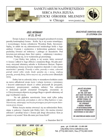 SANKTUARIUM NAJŚWIĘTSZEGO SERCA PANA JEZUSA JEZUICKI OŚRODEK MILENIJNY w Chicago www.jezuici.org król wyśmiany Łk 23, 35-43 Święty Łukasz w dzisiejszej Ewangelii przedstawił swoistą parodię kontemplacji Jezusa – Króla. Są w tej scenie triumfujący i wyszydzający Jezusa członkowie Wysokiej Rady, faryzeusze. Sądzą, że udało im się zdetronizować niedoszłego króla z Jego ambicji. Cynizm i szyderstwa z królewskiej godności Jezusa pochodzą również od żołnierzy i jednego ze skazańców. Pod krzyżem jest milczący tłum. Stoi i patrzy – zalękniony i niezdecydowany. Wydaje się, że te wydarzenia go przerastają. I jest Dobry łotr, jedyny w tej scenie, który uwierzył w Jezusa i odkrył w Jego obliczu i cierpieniu Boga. On jako pierwszy otrzymał obietnicę udziału w Królestwie Bożym. Poprzez kontemplację Jezusa na krzyżu stopniowo dojrzało w nim ziarno uczciwości i prawdy. Prawdę o sobie, prawdę o winie, człowiek potrafi znieść tylko wtedy, kiedy spotyka się z nową, większą prawdą, prawdą Bożą, która nazywa się: przebaczenie (Benedykt XVI). Dobry łotr to człowiek, który w stosunkowo krótkim czasie na nowo odbudował swoje życie i relacje życiowe; z przemocy i krzywd zadawanych innym (i sobie) przeszedł do przyjaźni, wierności, przejrzystości, zaufania, miłości. Ten człowiek w doskonały sposób zrozumiał Ewangelię; zrozumiał, że w Ukrzyżowanym objawia się potęga Boga w sposób odmienny od jego wyobrażeń i życia. Na tak głębokie nawrócenie Jezus miał tylko jedną odpowiedź: zaprawdę, powiadam ci, dziś ze Mną będziesz w raju. Nawrócony, umierający na krzyżu przestępca jest pierwszym zbawionym przez Jezusa. Wobec krzyża można otworzyć się na miłosierdzie Boże, stając w pokorze i bojaźni (jak Dobry łotr). Ale można również odrzucić i przekląć krzyż i Jezusa (jak drugi złoczyńca). Kim ja jestem w tej scenie? Kim dla mnie jest Jezus Król? o. Stanisław Biel SJ RADIO DEON WNWI 1080 AM Uroczystość Chrystusa Króla 20 listopada 2016 ,,Miłość wzajemna nie polega na tym, żeby nam nikt nigdy przykrości nie zrobił, ale na tym, abyśmy starali się drugim przykrości nie sprawiać i nabrali wprawy w natychmiastowym i całkowitym przebaczaniu wszystkiego co nas urazi.” św. Maksymilian Maria Kolbe pon. - pt. 12:00 AM - 11:00 AM całą dobę www.radiodeon.com Tel. (773) 283 2425 / Fax. (773) 283 2435 PORZĄDEK MSZY ŚWIĘTYCH Poniedziałek - pi¹tek: 8:00, 18:00, 19:00 1 piątek miesiąca: 8:00, 18:00 i 19:00 Środa: 19:00 - nowenna do Matki Bożej Nieustającej Pomocy Sobota: 8:00 i 19:00 , tylko w I sobotę miesiąca o 17:00 dla chorych, Niedziela: 8:00 (radiowa), 9:30, 11:00, 13:00, 19:00, 20:30 -=- SpowiedŸ św.: od poniedziałku do soboty - 7:30 i 18:30, w niedzielę - pó³ godziny przed ka¿d¹ Msz¹ Œwiêt¹, W 1. pi¹tek miesi¹ca - od 17:30 do 20:00 Adoracja Najświętszego Sakramentu - od poniedziałku do czwartku - od 18:30 do 19:00 sobota - od 18:00 do 19:00 Sanktuarium Najświętszego Serca Pana Jezusa Jezuicki Ośrodek Milenijny 5835 W. Irving Park Rd.; Chicago, IL 60634, tel. 773 777 7000 fax 773 427 0126 www.jezuici.org e-mail: [email protected] Audycje Radia DEON: tel. 773 283 2425 Fax. 773 283 2435 www. radiodeon.com e-mail: [email protected] Biuro czynne: od poniedziałku do soboty: 8:30 - 9:00, 15:30 - 20:30 niedziela: 8:30 - 15:00 Biblioteka czynna: niedziela: 10:30 - 14:30 Kawiarenka czynna: niedz.: 10:00 - 15:00 Sacred Heart Mission House 4105 N. Avers Ave., Chicago, IL 60618 tel. 773 588 74 76; fax 773 588 65 17 Rektor Sanktuarium i Przełożony Jezuitów o. Tomasz Oleniacz , SJ (773-588-7476 - ext. 224) o. Paweł Kosiński , SJ (773-777-7000 - ext. 121) o. Jerzy Mordarski, SJ (773-588-7476 - ext. 234) o. Jerzy Karpiński, SJ (773-588-7476 - ext. 237) o. Paweł Witon, SJ (773-588-7476 - ext. 227) br. Adam Poręba, SJ (773-777-7000 - ext. 122) Wszelkie ofiary i donacje prosimy kierowaæ na adres Sanktuarium. Donacje s¹ wolne od podatku i mo¿na je odpisywaæ przy rozliczeniu z IRS. TRANSMISJE RADIOWE I INTERNETOWE w internecie pod adresem: http://75.145.184.1/polishmass poniedziałku do piątku falach 1450 AM niedziela: godz 8:00, Radio WCEV 1450 Codziennie przez całą dobę: Kamera internetowa z Sanktuarium (obraz i dźwięk; używać Internet Explorer): www.jezuici.org - link „Transmisje na żywo” – wpisać jako użytkownik i hasło: 5835 INTENCJE MSZY ŚWIĘTYCH Niedziela, 20 XI 8:00 + Bolesław Zapora 9:30 Zbiorowa 11:00 + Jan Polek w 15. rocznicę śmierci 13:00 + + Stanisław i Zofia Dedel 19:00 Wypominki 20:30 + Leonard Żukowski Poniedziałek, 21 XI - Ofiarowania Najświętszej Maryi Panny 8:00 o zdrowie, błogosławieństwo Boże i 7darów Ducha Św. dla synowej Beatki 18:00 Zbiorowa 19:00 Wypominki Wtorek, 22 XI - św. Cecylii 8:00 + Marek Karasiński z rodziną 18:00 Zbiorowa 19:00 Wypominki Środa, 23 XI 8:00 za Dobroczyńców Jezuickiego Ośrodka Milenijnego 18:00 Zbiorowa 19:00 Wypominki Czwartek, 24 XI 8:00 w intencji Bogu wiadomej 11:00 Dziękczynna 19:00 Wypominki Piątek, 25 XI 8:00 o zdrowie i wszelkie łaski Matki Bozej dla Marii Koszyk 18:00 Zbiorowa 19:00 Wypominki Sobota, 26 XI - św. Jana Berchmansa, jezuity, patrona ministrantów 8:00 Zbiorowa 19:00 Wypominki Przez cały listopad odprawiamy Msze św. „wypominkowe” – codziennie o godz. 19:00. Zapraszamy do wspólnej modlitwy za naszych bliskich zmarłych. Fundacja „Strong Family - Silna Rodzina” Fundacja Strong Family oraz SAINT BERNARD TRAVEL & REK 5 STAR TRAVEL zapraszają na pielgrzymki tel. 773 777 7722, tel. 773 777 7733 Słuchaj! RadioDeon.com - WNWI 1080 AM pon. - pt. 12:00 AM - 11:00 AM - tel. (773) 283 2425 OG£OSZENIA Niedziele, 20 XI - Dzisiaj zbieramy drugą tacę zarządzoną przez Archidiecezję Chicago na Katolicką Kampanię na Rzecz Rozwoju Człowieka. Poniedziałek, 21 XI - 17:00 - w sali Colombiere przygotowanie do wysyłki dla naszych Przyjaciół i D