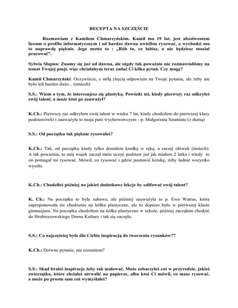 RECEPTA NA SZCZĘŚCIE Rozmawiam z Kamilem Chmarzyńskim. Kamil ma 19 lat, jest absolwentem liceum o profilu informatycznym i od bardzo dawna uwielbia rysować, a wychodzi mu to naprawdę pięknie. Jego motto to : „Rób to, co lubisz, a nie będziesz musiał pracować”. Sylwia Słupna: Znamy się już od dawna, ale nigdy tak poważnie nie rozmawialiśmy na temat Twojej pasji, więc chciałabym teraz zadać Ci kilka pytań. Czy mogę? Kamil Chmarzyński: Oczywiście, z miłą chęcią odpowiem na Twoje pytania, ale żeby nie było ich bardzo dużo... (śmiech) S.S.: Wiem o tym, że interesujesz się plastyką. Powiedz mi, kiedy pierwszy raz odkryłeś swój talent, a może ktoś go zauważył? K.Ch.: Pierwszy raz odkryłem swój talent w wieku 7 lat, kiedy chodziłem do pierwszej klasy podstawówki i zauważyła to moja pani wychowawczyni - p. Małgorzata Szumiata (z dumą) S.S.: Od początku tak pięknie rysowałeś? K.Ch.: Tak, od początku kiedy tylko dostałem kredkę w rękę, a raczej ołówek (śmiech). A tak poważnie, to mój wujek zaczął mnie uczyć podstaw już jak miałem 2 latka i wtedy to on pomagał mi rysować. Mówił, co rysować i gdzie postawić kreskę, żeby ładnie wszystko wyszło. K.Ch.: Chodziłeś później na jakieś dodatkowe lekcje by szlifować swój talent? K. Ch.: Na początku to była zabawa, ale później zauważyła to p. Ewa Watras, która zaproponowała mi chodzenie na kółka plastyczne, ale to dopiero było w pierwszej klasie gimnazjum. Na początku chodziłem na kółka plastyczne w szkole, później zacząłem chodzić do Hrubieszowskiego Domu Kultury i tak się zaczęło. S.S.: Co najczęściej było dla Ciebie inspiracją do tworzenia rysunków?? K.Ch.: Dziwne pytanie, nie rozumiem? S.S.: Skąd brałeś inspiracje żeby tak malować. Może zobaczyłeś coś w przyrodzie, jakieś zwierzątko, które chciałeś utrwalić na papierze, albo ktoś Ci mówił, co masz rysować, a może po prostu sam coś wymyślałeś? K. Ch.: Kiedy nie chodziłem na kółka plastyczne, to sam rysowałem z głowy, z własnej inicjatywy, ale jak już zacząłem chodzić na kółka plastyczne, które prowadziła p. Ewa Watras, to ona dawała mi jakieś pomysły, kazała coś rysować, dawała temat do tworzenia i starałem się wykonywać to, co ona mówi najlepiej jak potrafiłem, a potem dawałem to do oceny Jej i innych uczestników tego kółka plastycznego. S.S.: Rozumiem, że kontynuujesz rozwijanie swojego talentu plastycznego? K.Ch.: Tak, kontynuuje, staram się cały czas tworzyć coś nowego S.S.: Tworzysz tylko dla siebie, czy malujesz też dla innych? K. Ch.: Tworzę dla siebie, ale też maluję dla innych, jeśli ktoś mnie o to poprosi. S.S.: Czerpiesz z tego jakieś korzyści materialne, czy przyjemności? robisz to dla własnej K.Ch.: Robię to dla własnej przyjemności i żeby się szkolić, rozwijać umiejętności i stawać się co raz lepszym w tym, co lubię. S.S.: Słyszałam, że pracujesz projektując grafikę do stron internetowych, więc jednak zarabiasz na swoim talencie? K.Ch.: Tak, to prawda, projektuję grafikę na strony internetowe. S.S.: Jest to dla Ciebie przyjemnością, czy bardziej robisz to dla zysku? K.Ch.: To zależy od upodobań klienta, bo czasami zdarzają się tacy, którzy znają się lepiej niż ty, a przynajmniej tak im się wydaje, no ale zdarzają się też tacy, którzy dają ci wolną rękę i to staje się przyjemnością, bo mogę pokazać, na co tak naprawdę mnie stać (uśmiech). S.S.: Sprawia Ci to taką samą przyjemność jak kiedyś, a może już się wyczerpałeś? K.Ch.: Nie wyczerpałem się. Tak jak mówię, to zależy od klientów. Jeżeli klient jest taki, który daje ci wolną rękę, no to jest to dla mnie przyjemne i mogę pokazać swoje pomysły i robię to z zadowoleniem, a jeżeli klient mi wszystko mówi jak mam robić, to już przestaje czerpać z tego taką przyjemność. S.S.: Czy można zobaczyć gdzieś Twoje prace? K.Ch.: Tak, u mnie w domu mam galerie (śmiech), a tak poważnie to posiadam własne portfolio, jest to strona internetowa, gdzie umieszczam swoje nowe prace. Tam można obejrzeć wybrane prace. S.S.: Możesz podać adres internetowy tego portfolio, bo jestem bardzo ciekawa Twoich najnowszych dzieł? K.Ch.: Tak, oczywiście. Ta strona to www.kchmarzynski.daportfolio.com S.S.: Dziękuję za wyczerpujący wywiad i za adres , który z pewnością niejednokrotnie odwiedzę. Życzę Ci dalszego rozwijania swego talentu plastycznego. K.Ch.: Ja również dziękuję. Sylwia Słupna (klasa III L „c”)