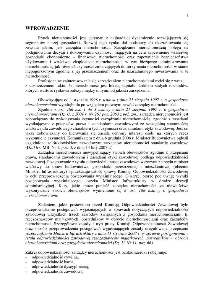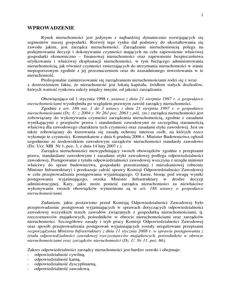 1 WPROWADZENIE Rynek nieruchomości jest jedynym z najbardziej dynamicznie rozwijających się segmentów naszej gospodarki. Rozwój tego rynku dał podstawy do ukształtowania się zawodu jakim, jest zarządca nieruchomości. Zarządzanie nieruchomością polega na podejmowaniu decyzji i dokonywaniu czynności mających na celu zapewnienie właściwej gospodarki ekonomiczno – finansowej nieruchomości oraz zapewnienie bezpieczeństwa użytkowania i właściwej eksploatacji nieruchomości, w tym bieżącego administrowania nieruchomością, jak również czynności zmierzających do utrzymania nieruchomości w stanie niepogorszonym zgodnie z jej przeznaczeniem oraz do uzasadnionego inwestowania w te nieruchomość. Profesjonalne zainteresowanie się zarządzaniem nieruchomościami rodzi się z wraz z dostrzeżeniem faktu, że nieruchomość jest lokatą kapitału, źródłem stałych dochodów, których wartość rynkowa zależy między innymi, od jakości zarządzania. Obowiązująca od 1 stycznia 1998 r. ustawa z dnia 21 sierpnia 1997 r. o gospodarce nieruchomościami wyodrębniła po względem prawnym zawód zarządcy nieruchomości. Zgodnie z art. 186 ust. 1 do 3 ustawy z dnia 21 sierpnia 1997 r. o gospodarce nieruchomościami (Dz. U. z 2004 r. Nr 261 poz. 2063 z póź. zm.) zarządca nieruchomości jest zobowiązany do wykonywania czynności zarządzania nieruchomością, zgodnie z zasadami wynikającymi z przepisów prawa i standardami zawodowymi ze szczególną starannością właściwą dla zawodowego charakteru tych czynności oraz zasadami etyki zawodowej. Jest on także zobowiązany do kierowania się zasadą ochrony interesu osób, na których rzecz wykonuje te czynności. Komunikatem z dnia 6 grudnia 2006 r. Minister Budownictwa ogłosił uzgodnione ze środowiskiem zawodowym zarządców nieruchomości standardy zawodowe (Dz. Urz. MB Nr 1, poz. 3, z dnia 14 luty 2007 r.). Zarządca nieruchomości niewypełniający swoich obowiązków zgodnie z przepisami prawa, standardami zawodowymi i zasadami etyki zawodowej podlega odpowiedzialności zawodowej. Postępowanie z tytułu odpowiedzialności zawodowej wszczyna z urzędu minister właściwy do spraw budownictwa, gospodarki przestrzennej i mieszkaniowej (obecnie Minister Infrastruktury) i przekazuje całość sprawy Komisji Odpowiedzialności Zawodowej w celu przeprowadzenia postępowania wyjaśniającego. O karze, biorąc pod uwagę wyniki postępowania wyjaśniającego, orzeka Minister Infrastruktury w drodze decyzji administracyjnej. Kary, jakie może ponieść zarządca nieruchomości za niewłaściwe wykonywanie swoich obowiązków wymienione są w art. 188 ustawy o gospodarce nieruchomościami. Zadaniem, jakie postawiono przed Komisją Odpowiedzialności Zawodowej było przeprowadzenie postępowań wyjaśniających w sprawach dotyczących odpowiedzialności zawodowej wszystkich trzech zawodów związanych z gospodarką nieruchomościami, tj. rzeczoznawców majątkowych, pośredników w obrocie nieruchomościami oraz zarządców nieruchomości. Szczegółowe zasady i tryb pracy Komisji Odpowiedzialności Zawodowej oraz sposób przeprowadzenia postępowań wyjaśniających zostały uregulowane przepisami rozporządzenia Ministra Infrastruktury z dnia 11 stycznia 2008 r. w sprawie postępowania z tytułu odpowiedzialności zawodowej rzeczoznawców majątkowych, pośredników w obrocie nieruchomościami oraz zarządców nieruchomości (Dz. U. Nr 11, poz. 66). Zakres odpowiedzialności zarządcy nieruchomości jest bardzo szeroki i obejmuje: - odpowiedzialność cywilną, - odpowiedzialność karną, - odpowiedzialność dyscyplinarną, - odpowiedzialność zawodową. 2 Komisja Odpowiedzialności Zawodowej sekcja zarządców nieruchomości rozstrzyga o odpowiedzialności zawodowej, której podlegają zarządcy nieruchomości. W dotychczasowej działalności (do końca 2007 r.) do Komisji Odpowiedzialności Zawodowej sekcji zarządców nieruchomości skierowano 206 spraw w celu przeprowadzenia postępowań wyjaśniajacych, które zostały zakończone wnioskami skierowanymi do organu o zastosowaniu kary dyscyplinarnej bądź o umorzenie postępowania, gdy postawione zarzuty w toku przeprowadzanego postępowania wyjaśniającego okazały się bezzasadne. Komisja Odpowiedzialności Zawodowej sekcja zarządców nieruchomości dotychczas wnioskowała o następujące kary dyscyplinarne: - umorzenie – 63 spraw, - upomnienie – 44 sprawy, - nagana – 35 spraw, - zawieszenie licencji na okres od 6 miesięcy do jednego roku – 9 spraw, - zawieszenie licencji zawodowej do czasu ponownego zdania egzaminu w wynikiem pozytywnym – 3 sprawy, - pozbawienie licencji zawodowej z możliwością ubiegania się o ponowne jej nadanie po upływie 3 lat od dnia pozbawienia – 2 sprawy. Poniżej przedstawiamy Państwu wybrane przypadki, które były przedmiotem postępowań wyjaśniających prowadzonych przez Komisję Odpowiedzialności Zawodowej wg stanu przed dniem 1 stycznia 2008 r. Publikacja wyników postępowań wyjaśniających ma na celu zwrócenie uwagi zarządców nieruchomości na zachowania i działania, które w ocenie Komisji zostały uznane za naganne, niezgodne z obowiązującymi przepisami prawa i standardami zawodowymi. I. Zarządzanie nieruchomością bez zawartej umowy 1. Zarządzanie nieruchomością wspólną bez zawarcia umowy o zarządzanie nieruchomością 2. Zarządzanie nieruchomością wspólną tzw. małej wspólnoty mieszkaniowej bez zawartej umowy o zarządzanie nieruchomością 3. Zarządzanie współwłasnością II. Nieprawidłowe prowadzenie dokumentacji nieruchomości 1. Nieprawidłowe prowadzenie dokumentacji wspólnoty mieszkaniowej 2. Nieprawidłowości przy rozliczeniach finansowych wspólnoty mieszkaniowej 3. Zwołanie rocznego zebrania właścicieli lokali z naruszeniem przepisów prawa 4. Nieprawidłowości przy podejmowaniu uchwał przez właścicieli lokali III. Nieprawidłowe działania zarządcy ni