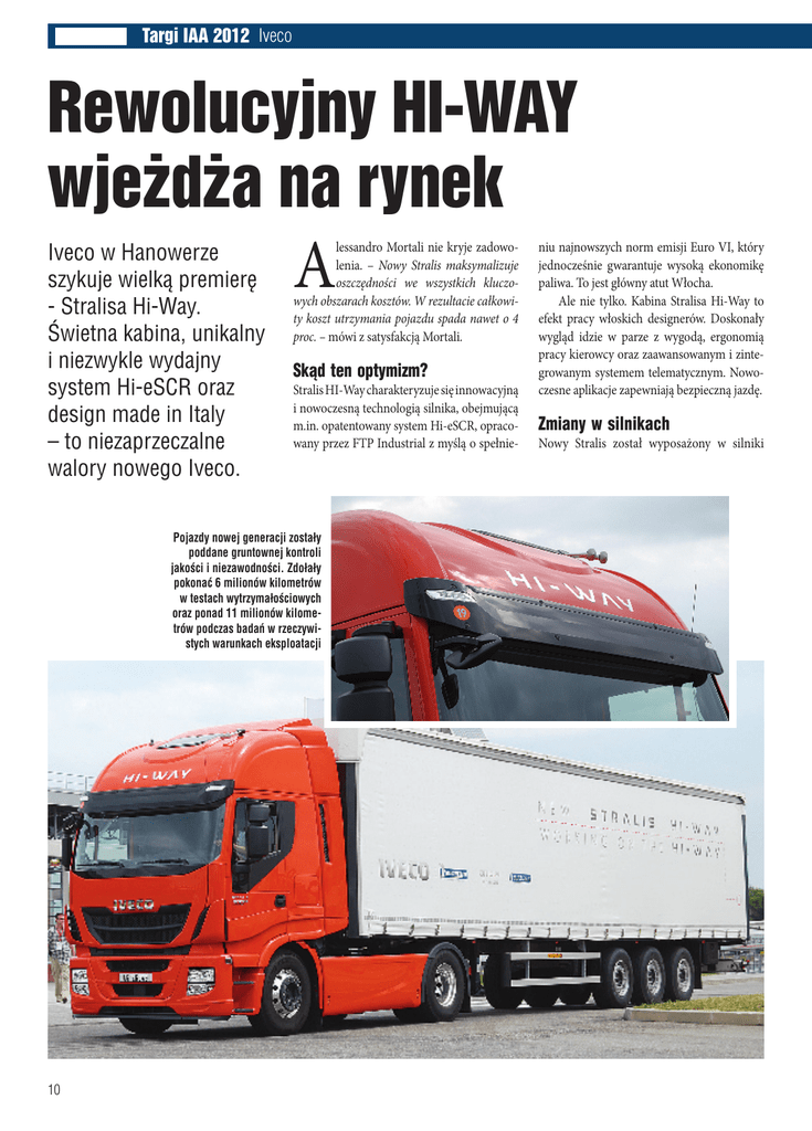 Targi IAA 2012 Iveco Rewolucyjny HI-WAY wjeżdża na rynek Iveco w Hanowerze szykuje wielką premierę - Stralisa Hi-Way. Świetna kabina, unikalny i niezwykle wydajny system Hi-eSCR oraz design made in Italy – to niezaprzeczalne walory nowego Iveco. A lessandro Mortali nie kryje zadowolenia. – Nowy Stralis maksymalizuje oszczędności we wszystkich kluczowych obszarach kosztów. W rezultacie całkowity koszt utrzymania pojazdu spada nawet o 4 proc. – mówi z satysfakcją Mortali. Skąd ten optymizm? Stralis HI-Way charakteryzuje się innowacyjną i nowoczesną technologią silnika, obejmującą m.in. opatentowany system Hi-eSCR, opracowany przez FTP Industrial z myślą o spełnie- Pojazdy nowej generacji zostały poddane gruntownej kontroli jakości i niezawodności. Zdołały pokonać 6 milionów kilometrów w testach wytrzymałościowych oraz ponad 11 milionów kilometrów podczas badań w rzeczywistych warunkach eksploatacji 10 niu najnowszych norm emisji Euro VI, który jednocześnie gwarantuje wysoką ekonomikę paliwa. To jest główny atut Włocha. Ale nie tylko. Kabina Stralisa Hi-Way to efekt pracy włoskich designerów. Doskonały wygląd idzie w parze z wygodą, ergonomią pracy kierowcy oraz zaawansowanym i zintegrowanym systemem telematycznym. Nowoczesne aplikacje zapewniają bezpieczną jazdę. Zmiany w silnikach Nowy Stralis został wyposażony w silniki Cursor, zaprojektowane przez FPT Industrial. Absolutną nowością jest system redukcji katalitycznej High Efficiency SCR (HI-eSCR), także dzieło FPT Industrial. Ów sprawia, że nowy Stralis jest jedynym na rynku ciężkim pojazdem spełniającym normy emisji Euro VI bez użycia systemu recyrkulacji spalin (EGR). W Stralisie pełną mocą „biją” 6-cylindrowe silniki z rodziny Cursor, dostępne w trzech pojemnościach skokowych: 8, 10 i 13 litrów z Euro 5 oraz 9, 11 i 13 litrów z Euro 6. Silniki są oferowane w ośmiu wariantach mocy dla diesla (od 310 do 560 KM); w technologii CNG (od 270 do 330 KM). Wszystkie silniki zapewniają niskie zużycie paliwa przy doskonałych osiągach z maksymalnym momentem obrotowym już przy bardzo niskich prędkościach obrotowych (począwszy od 1000 obr./min). W silnikach Cursor Euro 6 z turbosprężarką o zmiennej geometrii łopatek wprowadzono sterowanie elektroniczne w celu optymalizacji reakcji na obciążenie przy małych obrotach silnika oraz zwiększenia skuteczności hamulca silnikowego. Aby uzyskać bardzo dobre wyniki w zakresie ochrony środowiska, silniki z serii Euro V zostały wyposażone w układy odpowietrzania silnika w obwodzie zamkniętym. Rozwiązanie to zachowano nawet w silnikach z serii Euro 6. W celu niedopuszczenia do przenoszenia mgły olejowej w gazach przedmuchowych wprowadzono wysokosprawne układy oddzielania oleju, zmniejszające do absolutnego minimum spalanie oleju, skutkujące zanieczyszczeniem filtra cząstek stałych. Dzięki programowi optymalizacji warunków spalania emisja cząstek stałych z silnika została zredukowana, dzięki czemu wymuszona regeneracja filtra cząstek stałych nie jest już wymagana. To ważny aspekt w kategoriach zużycia paliwa i okresowej obsługi technicznej. Ponadto, ponieważ silnik pobiera tylko czyste, przefiltrowane powietrze, a nie recyrkulowane spaliny, jego zużycie jest mniejsze, przebiegi pomiędzy wymianami oleju są wydłużone, a przebiegi między przeglądami sięgają do 150000 kilometrów. Ograniczenia emisji wprowadzone przez normę Euro 6 można osiągnąć tylko przy zastosowaniu systemu selektywnej redukcji katalitycznej połączonej lub niepołączonej z recyrkulacją spalin (EGR). Zastosowanie układu recyrkulacji spalin (EGR) zmniejsza emisję NOx w komorze spalania, ale jednocześnie wpływa na zwiększenie liczby cząstek stałych i zmniejszenie sprawności spalania. Ponadto przy dużych ilościach cząstek stałych emitowanych z silnika jest wymagana wymuszona regeneracja filtra cząstek stałych silnika wysokoprężnego (DPF). Firma FPT Industrial zdecydowała się natomiast na zwiększenie sprawności silnika i zmniejszenie liczby cząstek stałych w procesie spalania, rezygnując z recyrkulacji spalin. Pozostałe cząstki stałe są redukowane w fil- trze cząstek stałych z pasywną regeneracją, NOx są natomiast redukowane w układzie wydechowym, co ogranicza zużycie paliwa, a także podnosi osiągi i niezawodność. Stworzony przez FPT Industrial układ SCR High Efficiency może zmniejszyć poziom emisji NOx o ponad 95%. Wyjątkowy zakres operacyjny pojazdu gwarantuje zbiornik paliwa o pojemności do 1400 litrów. Wszystkie jednostki napędowe zostały wyposażone w dekompresyjny hamulec silnikowy, który zwiększa bezpieczeństwo oraz przyczynia się do redukcji kosztów eksploatacji systemu hamulcowego. 11 Targi IAA 2012 Iveco Starannie odnowiona kabina Stralisa Hi-Way o zwiększonej ergonomii i wyższym komforcie to wynik bliskiej współpracy Iveco z dealerami i użytkownikami Jak w domu Starannie odnowiona kabina Stralisa HiWay o zwiększonej ergonomii i wyższym komforcie to wynik bliskiej współpracy Iveco z dealerami i użytkownikami. Celem zewnętrznych zmian stylistyki kabiny było przede wszystkim polepszenie aerodynamiki pojazdu, a tym samym również ekonomiki zużycia paliwa. Nowy model wyróżnia się m. in. zmienionymi owiewkami wlotu powietrza, nową centralną kratą wlotu powietrza i nową stylistyką osłony zderzaka. Oferując wszechstronne rozwiązania w zakresie wszystkich typów transportu oraz wszystkich czynności i potrzeb związanych z zarządzeniem flotą, nowy Stralis rozszerza bogatą ofertę wyposażenia o unikalną funkcję Driving Style Evaluation, wyjątkowy system Iveconnect, który w jednym urządzeniu łączy funkcje systemu informacyjno-rozrywkowego, nawigacji, wsparcia podczas jazdy, a także o funkcję Iveconnect Fleet ułatwiającą zarządzanie flotą. Stralis Hi-Way korzysta również z najbardziej zaawansowanych systemów elektro