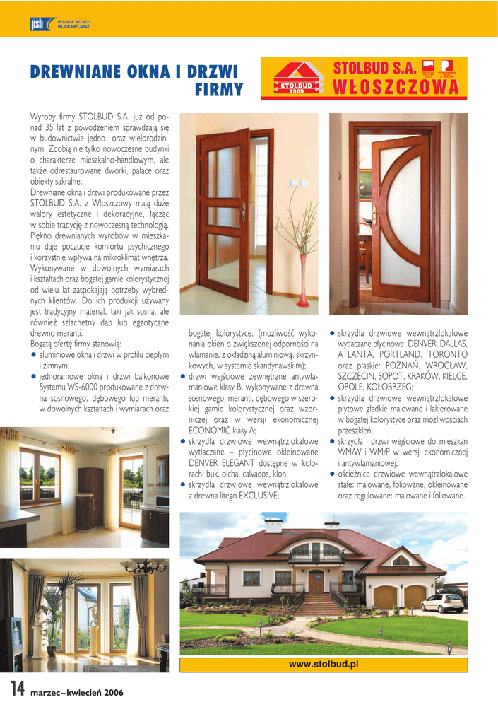 DREWNIANE OKNA I DRZWI FIRMY Wyroby firmy STOLBUD S.A. już od ponad 35 lat z powodzeniem sprawdzają się w budownictwie jedno- oraz wielorodzinnym. Zdobią nie tylko nowoczesne budynki o charakterze mieszkalno-handlowym, ale także odrestaurowane dworki, pałace oraz obiekty sakralne. Drewniane okna i drzwi produkowane przez STOLBUD S.A. z Włoszczowy mają duże walory estetyczne i dekoracyjne, łącząc w sobie tradycję z nowoczesną technologią. Piękno drewnianych wyrobów w mieszkaniu daje poczucie komfortu psychicznego i korzystnie wpływa na mikroklimat wnętrza. Wykonywane w dowolnych wymiarach i kształtach oraz bogatej gamie kolorystycznej od wielu lat zaspokajają potrzeby wybrednych klientów. Do ich produkcji używany jest tradycyjny materiał, taki jak sosna, ale również szlachetny dąb lub egzotyczne drewno meranti. Bogatą ofertę firmy stanowią: ! aluminiowe okna i drzwi w profilu ciepłym i zimnym; ! jednoramowe okna i drzwi balkonowe Systemu WS-6000 produkowane z drewna sosnowego, dębowego lub meranti, w dowolnych kształtach i wymiarach oraz bogatej kolorystyce, (możliwość wykonania okien o zwiększonej odporności na włamanie, z okładziną aluminiową, skrzynkowych, w systemie skandynawskim); ! drzwi wejściowe zewnętrzne antywłamaniowe klasy B, wykonywane z drewna sosnowego, meranti, dębowego w szerokiej gamie kolorystycznej oraz wzorniczej oraz w wersji ekonomicznej ECONOMIC klasy A; ! skrzydła drzwiowe wewnątrzlokalowe wytłaczane – płycinowe okleinowane DENVER ELEGANT dostępne w kolorach: buk, olcha, calvados, klon; ! skrzydła drzwiowe wewnątrzlokalowe z drewna litego EXCLUSIVE; ! skrzydła drzwiowe wewnątrzlokalowe wytłaczane płycinowe: DENVER, DALLAS, ATLANTA, PORTLAND, TORONTO oraz płaskie: POZNAŃ, WROCŁAW, SZCZECIN, SOPOT, KRAKÓW, KIELCE, OPOLE, KOŁOBRZEG; ! skrzydła drzwiowe wewnątrzlokalowe płytowe gładkie malowane i lakierowane w bogatej kolorystyce oraz możliwościach przeszkleń; ! skrzydła i drzwi wejściowe do mieszkań WM/W i WM/P w wersji ekonomicznej i antywłamaniowej; ! ościeżnice drzwiowe wewnątrzlokalowe stałe: malowane, foliowane, okleinowane oraz regulowane: malowane i foliowane. www.stolbud.pl 14 marzec – kwiecień 2006