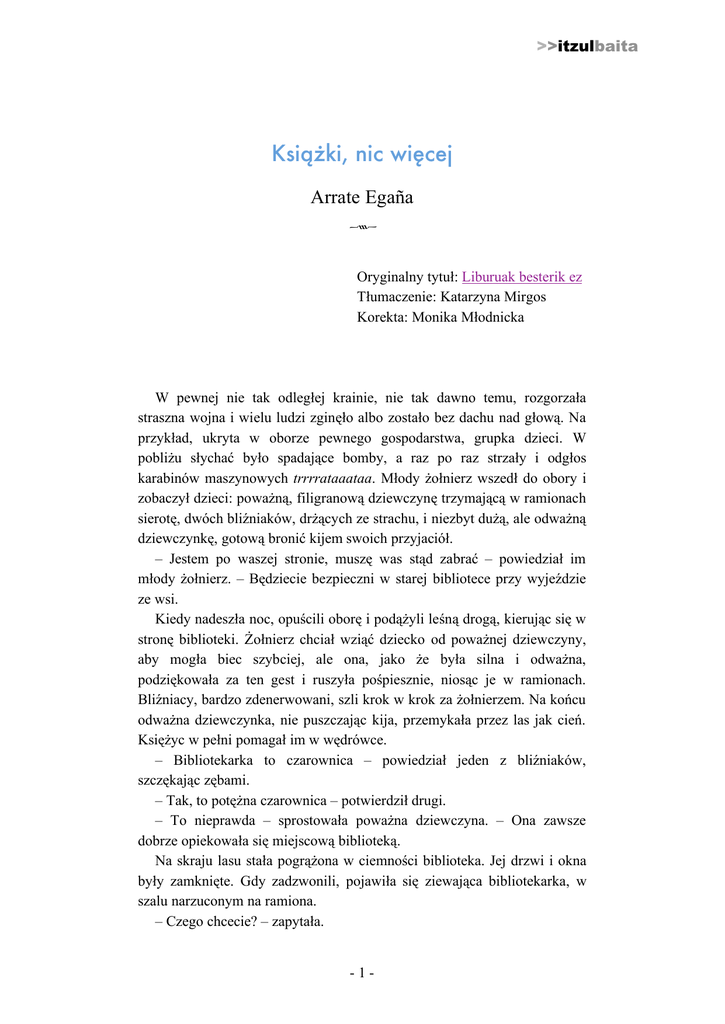 >>itzulbaita Książki, nic więcej Arrate Egaña Oryginalny tytuł: Liburuak besterik ez Tłumaczenie: Katarzyna Mirgos Korekta: Monika Młodnicka W pewnej nie tak odległej krainie, nie tak dawno temu, rozgorzała straszna wojna i wielu ludzi zginęło albo zostało bez dachu nad głową. Na przykład, ukryta w oborze pewnego gospodarstwa, grupka dzieci. W pobliżu słychać było spadające bomby, a raz po raz strzały i odgłos karabinów maszynowych trrrrataaataa. Młody żołnierz wszedł do obory i zobaczył dzieci: poważną, filigranową dziewczynę trzymającą w ramionach sierotę, dwóch bliźniaków, drżących ze strachu, i niezbyt dużą, ale odważną dziewczynkę, gotową bronić kijem swoich przyjaciół. – Jestem po waszej stronie, muszę was stąd zabrać – powiedział im młody żołnierz. – Będziecie bezpieczni w starej bibliotece przy wyjeździe ze wsi. Kiedy nadeszła noc, opuścili oborę i podążyli leśną drogą, kierując się w stronę biblioteki. Żołnierz chciał wziąć dziecko od poważnej dziewczyny, aby mogła biec szybciej, ale ona, jako że była silna i odważna, podziękowała za ten gest i ruszyła pośpiesznie, niosąc je w ramionach. Bliźniacy, bardzo zdenerwowani, szli krok w krok za żołnierzem. Na końcu odważna dziewczynka, nie puszczając kija, przemykała przez las jak cień. Księżyc w pełni pomagał im w wędrówce. – Bibliotekarka to czarownica – powiedział jeden z bliźniaków, szczękając zębami. – Tak, to potężna czarownica – potwierdził drugi. – To nieprawda – sprostowała poważna dziewczyna. – Ona zawsze dobrze opiekowała się miejscową biblioteką. Na skraju lasu stała pogrążona w ciemności biblioteka. Jej drzwi i okna były zamknięte. Gdy zadzwonili, pojawiła się ziewająca bibliotekarka, w szalu narzuconym na ramiona. – Czego chcecie? – zapytała. -1- >>itzulbaita Gasteiz – Poznan 2010 – Dzieci schronią się tutaj, ponieważ wróg zamierza spalić całą wieś. – W takim razie wejdźcie, ale nie zapalajcie światła – nakazała bibliotekarka. Weszli do środka, a dzięki wpadającemu przez kraty światłu księżyca mogli przyjrzeć się wnętrzu. Wszędzie panowała czystość i porządek, obrazy wisiały na ścianach, książki stały na półkach, a krzesła były ustawione wokół stołów, jakby w każdej chwili gotowe, na przyjęcie miejscowych dzieci. Kilka dni później żołnierza poinformowano przez radiostację, że wróg rzeczywiście podpalił wieś. Otrzymał też rozkaz, aby chronić dzieci. Z ogrodu przy bibliotece dostrzegli na ciemnym niebie pomarańczowy blask najdłuższych ognistych płomieni, słyszeli też krzyki i strzały. Przez następne dni nie słyszeli już nic. Słońce wstawało codziennie, a ptaki śpiewały. Dzieci bawiły się w lesie z żołnierzem, a nocą bibliotekarka czytała im do snu. Ta bibliotekarka nie była złym człowiekiem. Była bardzo mądrą i szczodrą kobietą, która wszystko, co miała, rozdzieliła między dzieci i nauczyła ich różnych zabaw. Przez kilka dni poruszali się tylko w okolicy biblioteki i na ścieżce prowadzącej do lasu, tak jakby znajdowali się w innym świecie, spokojnym świecie bez wojny. Poważna dziewczyna śmiała się, słuchając czułych słów żołnierza, zapomniała, że jest żołnierzem; sierota uznała bibliotekarkę za matkę, bliźniacy zamiast wciąż drżeć, wybuchali gromkim śmiechem, a odważna dziewczynka zamieniła kij na książkę. Ale wojna pozostała wojną. Pewnego razu, gdy dzieci siedziały przy bibliotekarce słuchając bajki, usłyszały radiostację żołnierza. Wróg, zabijając dom po domu pozostałych przy życiu ludzi, skierował się w stronę lasu. Następnego dnia rano dotrą do biblioteki! Dzieci znów zaczęły drżeć. Żołnierz nie wiedział, co robić, nie mieli wiele czasu na ucieczkę, a z drugiej strony nie było gdzie się ukryć! Wówczas bibliotekarka, która, jak słusznie podejrzewali bliźniacy, była czarownicą, zaproponowała niezwykłe wyjście, wyjście magiczne. – Ukryjemy się we wnętrzu książek. – Potrafisz tego dokonać? – zapytał zdumiony żołnierz. – Wejście do środka nie jest trudne, ale później ktoś będzie nas musiał stamtąd wydostać. – To bez znaczenia – powiedziała poważna dziewczyna. – Jeśli to jedyna możliwość ratunku, zróbmy to. Nie mieli zbyt wiele czasu. Z lasu dochodził hałas, wróg powalał drzewa i strzelał do wszystkiego, co się ruszało. -2- >>itzulbaita Gasteiz – Poznan 2010 – Szybko – powiedziała bibliotekarka do bliźniaków. – Dokąd chcecie się wybrać w podróż? Podoba się wam ta książka przygodowa? Albo tamta, o piratach? Bliźniacy, nie przestając drżeć, zdecydowali się wejść do wnętrza opowieści przygodowej i kobieta wysłała ich tam, szepcząc kilka magicznych słów. Odważna dziewczynka wybrała książkę o piratach, a poważna dziewczyna, ponieważ zakochała się w żołnierzu, poprosiła go, aby razem ukryli się w baśni o elfach. – Ja muszę walczyć – odpowiedział. Bibliotekarka poprosiła młodego żołnierza, aby nie zostawał, gdyż wojna jest zła, a on nie jest złym młodzieńcem. – Pomyśl, dla wielu innych ty będziesz takim samym wrogiem, jakim oni są dla nas. Będą się bali, a ty ich skrzywdzisz. Żołnierz nie uległ jednak. Oznajmił, że pewnego dnia wróci i odszuka ich wśród opowieści. – W takim razie aż do twego powrotu zostanę w baśni o Królowej Śniegu – powiedziała dziewczyna - i będę żyć w zimnie do czasu, aż wrócisz. Bibliotekarka na oczach zapłakanego żołnierza umieściła dziewczynę w baśni o Królowej Śniegu, a następnie pożegnała się z nim. Kobieta od dawna chciała odwiedzić legendę o rycerzach i zanurzyła się w jednym z takich tomów, zabierając ze sobą dziecko. Ostatnia książka zamknęła się, a żołnierz uciekł zasmucony, zanim zaczęło świtać. Wrogowie zdewa