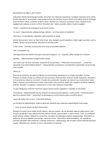 Opowiadanie do zdjęcia „Mam talent” Usłyszałam dźwięk dzwoniącego budzika. Zerwałam się z łóżka jak najszybciej i zaczęłam szykować się do szkoły. Rzadko zdarzało mi się wstawać z taką przyjemnością, ale dziś było inaczej. Dzisiaj miał odbyć się finał szkolnego konkursu Mam Talent, w którym wzięłam udział. Ubrałam się i starannie uczesałam włosy. Zależało mi by wyglądać jak najlepiej, w końcu to finał. Musiałam dać z siebie wszystko, także w kwestii wyglądu. -Cześć! – zawołałam do krzątającej się po kuchni mamy. -O, cześć! –odpowiedziała odwzajemniając uśmiech - Co chcesz zjeść na śniadanie? -Nie jestem na razie głodna -odparłam- zjem śniadanie w szkole. Jednak dotrzymanie słowa nie było takie łatwe. Gdy stanęłam przed budynkiem szkoły nagle poczułam ucisk w żołądku. Bardzo się stresowałam. Weszłam do szkolnej szatni. -Cześć, Daria! - zawołała zauważywszy mnie moja przyjaciółka Malwina. -Hej!- przywitałam się. -Dlaczego jesteś taka blada? Stresujesz się przed występem, co? – zapytała, jakby czytając mi w myślach. -Zgadłaś…- odpowiedziałam przygaszonym tonem. -Nie martw się! Tak dużo ćwiczyłaś, na pewno się nie pomylisz! – Próbowała mnie pocieszyć - …a poza tym naprawdę masz talent! Będzie dobrze! – odpowiedziała zauważywszy, że poprzednia wypowiedź nie pocieszyła mnie zanadto. -Wiesz, ja… Przerwał mi dzwonek. Zaczęłam panikować jeszcze bardziej, ponieważ już za chwilę miał odbyć się finał. Wszyscy uczniowie zaczęli się schodzić do hali sportowej. Postanowiłam przebrać się jak najszybciej, aby potem móc przećwiczyć układ po raz ostatni. Poszłam do przebieralni. Zaczęłam się ubierać się w mój kostium- białe body i zwiewną, jasnoniebieską narzutkę. Poprawiłam swój starannie upięty kok i wpięłam we włosy niebieską kokardę. Wyszłam na zaplecze. Czekała tam na mnie moja najlepsza przyjaciółka. -O rany! Wyglądasz świetnie! Powinnaś wygrać samym swoim wyglądem!- zawołała na mój widok. -Przesadzasz - odpowiedziałam bardzo drżącym od zdenerwowania głosem z nutką paniki. – Konkurencja jest ogromna, popatrz tylko! – wskazałam na śpiewającą na scenie dziewczynkę o anielskim głosie. -Jesteś dla siebie zbyt surowa - stwierdziła Malwina. Już chciałam jej odpowiedzieć, kiedy po głośnych oklaskach pani Jaworska zapowiedziała mój występ. -… zaraz na scenie pojawi się Daria Skowronek! Wyszłam na scenę. Serce waliło mi jak młotem, cała się trzęsłam, ale nie dawałam tego po sobie poznać. Gdy muzyka zaczęła grać moje zdenerwowanie jednak zniknęło. Zapomniałam o całym stresie, o tym, że występuję przed setkami widzów. Robiłam to, co kocham. Zaczęłam od idealnego przejścia szpagatowego. Zerknęłam na widownię. Wszyscy oglądali mój występ z zapartym tchem. Wykonałam układ bezbłędnie, ale największy zachwyt wzbudziło salto machowe z rozbiegu wykonane z wielką gracją. Gdy muzyka ucichła wybuchły donośne owacje. Ukłoniłam się i zeszłam ze sceny z powrotem na zaplecze. -To było cudowne!- podsumowała mój występ Malwina kiedy wychodziłyśmy z hali.- Nigdy nie widziałam czegoś podobnego! Naprawdę dałaś z siebie wszystko! Nie musimy czekać na werdykt, jestem pewna, że wygrasz! -Dzięki, ale nie jestem tego taka pewna – odpowiedziałam z nutą wątpliwości w głosie – Wprawdzie nie widziałam wszystkich występów, ale ta Anka z czwartej „C” podobno wspaniale tańczy, a Gośka… -…ale to, kto był lepszy okaże się już za pół godziny, więc przestań się zadręczać!- przerwała mi przyjaciółka. Owe pół godziny ciągnęło się niczym wieczność. Atmosfera była bardzo napięta. W końcu na scenę wyszła pani Jaworska, aby ogłosić werdykt. -Po długim oczekiwaniu nadeszła pora ogłosić werdykt jury! Trzecie miejsce zajęła Anna Majewska! Moje serce uderzało coraz prędzej. -… drugie Mateusz Makarewicz! Przyjaciółka złapała mnie za rękę. -… a najwyższe, pierwsze miejsce zajęła… -kobieta przerwała dla zbudowania napięcia. Teraz Malwina z całej siły ściskała moją rękę. Stresowała się tak mocno jak ja. -DARIA SKOWRONEK! Przyjaciółka aż pisnęła z radości, rzuciła mi się na szyję i przytuliła mocno. Po sali rozbrzmiewały gromkie brawa. Całe zdenerwowanie spłynęło ze mnie zastąpione przez ogromną euforię. Wygrałam! Dwa miesiące przygotowań nie poszły na Marnę! -Jestem z ciebie taka dumna, Daria! – powiedziała do mnie Malwina, gdy wychodziłyśmy ze szkoły. Na naszej drodze stanął niespodziewanie mężczyzna w dżinsowej marynarce i czerwonej apaszce. Wyglądał na wpływowego człowieka. -Ty jesteś Daria, tak? – zwrócił się do mnie. -Tak, to ja. -Nazywam się Karol Wilk, jestem dyrektorem szkoły baletowej we Wrocławiu. Twój występ był niewiarygodny i chciałem ci powiedzieć, że od teraz możesz przychodzić na lekcje – rzekł mężczyzna. – Oczywiście, jeśli będziesz zainteresowana – dodał po chwili. - O-oczywiście, ż-że chcę! – wyjąkałam z wielkim wysiłkiem. -Tu jest moja wizytówka z numerem telefonu. Zadzwoń, kiedy będziesz chciała dowiedzieć się czegoś więcej. No, to widzimy się na zajęciach! Odszedł. Przez chwilę stałam w miejscu nie rozumiejąc, co się stało. Właśnie spełniły się moje marzenia. Nigdy bym się nie spodziewała, że dostanę się do najlepszej szkoły baletowej w Polsce. -Malwina?- zwróciłam się z szerokim uśmiechem do stojącej obok mnie przyjaciółki.-Czyli jednak byłam lepsza od Anki! Ty jednak zawsze masz rację! -Wiem!- odpowiedziała z dziarskim uśmiechem na twarzy. Zuzanna Wanowicz kl. VI b