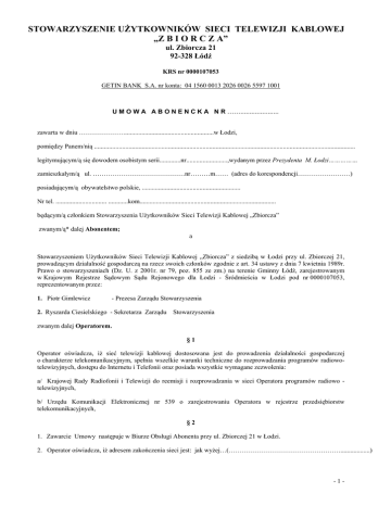 STOWARZYSZENIE UŻYTKOWNIKÓW SIECI TELEWIZJI KABLOWEJ „Z B I O R C Z A” ul. Zbiorcza 21 92-328 Łódź KRS nr 0000107053 GETIN BANK S.A. nr konta: 04 1560 0013 2026 0026 5597 1001 U M O W A A B O N E N C K A N R ……..................... zawarta w dniu …………………......................................................w Łodzi, pomiędzy Panem/nią ............................................................................................................................................................... legitymującym/ą się dowodem osobistym serii.............nr.........................,wydanym przez Prezydenta M. Łodzi…………… zamieszkałym/ą ul. ……………………………………nr………m…… (adres do korespondencji……………………) posiadającym/ą obywatelstwo polskie, ............................................................ Nr tel. ............................... ............kom................................................................................... będącym/ą członkiem Stowarzyszenia Użytkowników Sieci Telewizji Kablowej „Zbiorcza” zwanym/ą* dalej Abonentem; a Stowarzyszeniem Użytkowników Sieci Telewizji Kablowej „Zbiorcza” z siedzibą w Łodzi przy ul. Zbiorczej 21, prowadzącym działalność gospodarczą na rzecz swoich członków zgodnie z art. 34 ustawy z dnia 7 kwietnia 1989r. Prawo o stowarzyszeniach (Dz. U. z 2001r. nr 79, poz. 855 ze zm.) na terenie Gminny Łódź, zarejestrowanym w Krajowym Rejestrze Sądowym Sądu Rejonowego dla Łodzi - Śródmieścia w Łodzi pod nr 0000107053, reprezentowanym przez: 1. Piotr Gimlewicz - Prezesa Zarządu Stowarzyszenia 2. Ryszarda Ciesielskiego - Sekretarza Zarządu Stowarzyszenia zwanym dalej Operatorem. §1 Operator oświadcza, iż sieć telewizji kablowej dostosowana jest do prowadzenia działalności gospodarczej o charakterze telekomunikacyjnym, spełnia wszelkie warunki techniczne do rozprowadzania programów radiowotelewizyjnych, dostępu do Internetu i Telefonii oraz posiada wszystkie wymagane zezwolenia: a/ Krajowej Rady Radiofonii i Telewizji do reemisji i rozprowadzania w sieci Operatora programów radiowo telewizyjnych, b/ Urzędu Komunikacji Elektronicznej nr 539 o zarejestrowaniu Operatora w rejestrze przedsiębiorstw telekomunikacyjnych, §2 1. Zawarcie Umowy następuje w Biurze Obsługi Abonenta przy ul. Zbiorczej 21 w Łodzi. 2. Operator oświadcza, iż adresem zakończenia sieci jest: jak wyżej…(……………………………………………..................) -1- §3 1. Przedmiotem Umowy jest świadczenie przez Operatora na rzecz Abonenta Usług o charakterze telekomunikacyjnym w ramach łączącego obie strony stosunku prawnego. Zakres obowiązków Operatora wynikających z zawarcia niniejszej Umowy określony został w § 19 ust.3 Regulaminu; 2. Operator zobowiązuje się do świadczenia na rzecz Abonenta Usług w zakresie: a/ wykonania instalacji urządzeń telekomunikacyjnych w lokalu Abonenta; b/ usuwania usterek, konserwacji i modernizacji urządzeń oraz sieci telekomunikacyjnej; c/ przyłączenia wskazanego przez Abonenta lokalu do sieci telekomunikacyjnej; d/ zapewnienia Abonentowi przesyłu sygnału programów radiowych i telewizyjnych objętych pakietem rozszerzonym zgodnym z Ofertą programową, przy czym Operator oświadcza, iż w jego ofercie znajduje się pakiet rozszerzony i pakiet socjalny* e/ zapewnienia Abonentowi dostępu do sieci telefonicznej i internetowej.* 3. Minimalna gwarantowana przez Operatora liczba programów telewizyjnych w jednym pakiecie wynosi 50. §4 1. Niniejsza Umowa zostaje zawarta na czas nieoznaczony/oznaczony do dnia .......................................................*, wchodzi w życie z dniem jej podpisania, przy czym termin rozpoczęcia świadczenia Usługi jest termin jej aktywacji wynoszący 7 dni od dnia zawarcia Umowy 2. Umowa zawarta na czas nieoznaczony może zostać rozwiązana przez każdą ze stron, z zachowaniem miesięcznego okresu wypowiedzenia, ze skutkiem na koniec miesiąca kalendarzowego, na warunkach określonych w Regulaminie; 3. Umowa zawarta na czas oznaczony uważana będzie za przedłużoną na czas nieokreślony, o ile Abonent nie wyrazi innego oświadczenia woli w terminie co najmniej 30 dni przed upływem okresu na jaki umowa została zawarta. 4. Szczegółowe warunki zawarcia Umowy, jej realizacji, zawieszenia oraz rozwiązania określa Regulamin odpowiednio w rozdziałach IV, V, VI i VII. §5 1 Abonent oświadcza, iż posiada pełną zdolność do czynności prawnych oraz tytuł prawny do lokalu, w którym ma być świadczona Usługa Operatora, upoważniający go do podejmowania decyzji w zakresie instalacji i eksploatacji sieci telekomunikacyjnej w tym lokalu; 2. Abonent zobowiązuje się w zamian za świadczenie Usług Operatora, do uiszczania abonamentu, w wysokości zgodnej z obowiązującym Cennikiem, na zasadach określonych w Regulaminie, płatnego z góry do 15-go dnia każdego miesiąca kalendarzowego w kasie Operatora lub na wskazany przez niego rachunek bankowy. Abonent zobowiązuje się do uiszczenia pierwszego abonamentu za miesiąc kalendarzowy następujący po miesiącu rozpoczęcia świadczenia Usługi przez Operatora. W razie uchybienia terminowi płatności Abonent zobowiązuje się do zapłaty na rzecz Operatora ustawowych odsetek. 3. Abonent ma prawo uiścić abonament za przyszłe miesiące z góry, nie więcej jednak niż za 12 kolejnych miesięcy kalendarzowych. Gwarantuje to Abonentowi zachowanie niezmienności uiszczonych opłat – w wysokości obowiązującej w miesiącu dokonywania wpłaty; 4. Szczegółowe zasady dotyczące sposobu i wysokości opłat należnych Operatorowi, jak również skutki opóźnienia w ich spłacie reguluje Cennik oraz Regulamin w Rozdziale X. §6 1. Na wysokość opłaty abonamentowej mają wpływ opłaty licencyjne za programy, za prawa autorskie i prawa pokrewne, za energię elektryczną, operacje b
