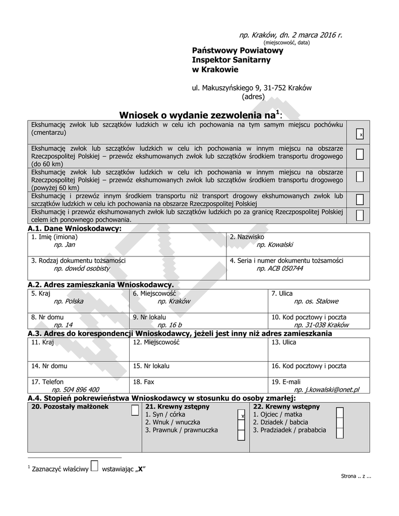 np. Kraków, dn. 2 marca 2016 r. (miejscowość, data) Państwowy Powiatowy Inspektor Sanitarny w Krakowie ul. Makuszyńskiego 9, 31-752 Kraków (adres) Wniosek o wydanie zezwolenia na1: Ekshumację zwłok lub szczątków ludzkich w celu ich pochowania na tym samym miejscu pochówku (cmentarzu) x Ekshumację zwłok lub szczątków ludzkich w celu ich pochowania w innym miejscu na obszarze Rzeczpospolitej Polskiej – przewóz ekshumowanych zwłok lub szczątków środkiem transportu drogowego (do 60 km) Ekshumację zwłok lub szczątków ludzkich w celu ich pochowania w innym miejscu na obszarze Rzeczpospolitej Polskiej – przewóz ekshumowanych zwłok lub szczątków środkiem transportu drogowego (powyżej 60 km) Ekshumację i przewóz innym środkiem transportu niż transport drogowy ekshumowanych zwłok lub szczątków ludzkich w celu ich pochowania na obszarze Rzeczpospolitej Polskiej Ekshumację i przewóz ekshumowanych zwłok lub szczątków ludzkich po za granicę Rzeczpospolitej Polskiej celem ich ponownego pochowania. A.1. Dane Wnioskodawcy: 1. Imię (imiona) 2. Nazwisko 3. Rodzaj dokumentu tożsamości 4. Seria i numer dokumentu tożsamości np. Jan np. Kowalski np. dowód osobisty np. ACB 050744 A.2. Adres zamieszkania Wnioskodawcy. 5. Kraj np. Polska 6. Miejscowość 7. Ulica 9. Nr lokalu 10. Kod pocztowy i poczta np. Kraków 8. Nr domu np. 14 np. 16 b np. os. Stalowe np. 31-038 Kraków A.3. Adres do korespondencji Wnioskodawcy, jeżeli jest inny niż adres zamieszkania 11. Kraj 12. Miejscowość 13. Ulica 14. Nr domu 15. Nr lokalu 16. Kod pocztowy i poczta 17. Telefon 18. Fax 19. E-mali np. 504 896 400 np. [email protected] A.4. Stopień pokrewieństwa Wnioskodawcy w stosunku do osoby zmarłej: 20. Pozostały małżonek 1 Zaznaczyć właściwy wstawiając „X” 21. Krewny zstępny 1. Syn / córka 2. Wnuk / wnuczka 3. Prawnuk / prawnuczka x 22. Krewny wstępny 1. Ojciec / matka 2. Dziadek / babcia 3. Pradziadek / prababcia Strona .. z ... 23. Krewny boczny do 4 stopnia pokrewieństwa: 1. Brat / siostra 2. Siostrzeniec / siostrzenica 24. Powinowaty w linii prostej do 1 stopnia: 3. Bratanek / bratanica 4. Brat ojca / brat matki 5. Siostra ojca lub matki 6. Brat cioteczny / siostra cioteczna (kuzyn / kuzynka) 25. Inna osoba 1. Teść / teściowa 2. Zięć / synowa A.5. Liczba osób zmarłych, których zwłoki/szczątki będą ekshumowane z jednego grobu np. 2016 A.6. Planowany termin przeprowadzenia ekshumacji - rok np. 1 B.1. Dane osoby zmarłej. 26. Imię (imiona) 27. Nazwisko 28. Nazwisko rodowe 29. Data i miejsce urodzenia np. Maria np. Kowalska np. Nowak 30. Ostatnie miejsce zamieszkania np. 19.09.1948 r. Kraków 2 31. Data i miejsce zgonu 3 np. 04.01.2013 r. Kraków 32. Przyczyną zgonu nie była choroba zakaźna : Tak Nie B.2. Miejsce aktualnego pochówku osoby zmarłej. 33. Kraj 34. Województwo 35. Powiat 36. Miejscowość 37. Nazwa cmentarza 38. Ulica 39. Grób ziemny 40. Katakumby 41. Kolumbaria np. Polska np. małopolskie np. Kraków np. Cmentarz Grębałów w Krakowie x np. m. Kraków np. Darwina 42. Grób murowany B.3. Miejsce przyszłego pochówku osoby zmarłej. 43. Kraj np. Polska 46. Miejscowość np. Kraków 44. Województwo 45. Powiat 47. Nazwa cmentarza 48. Ulica * np. Wóycickiego *np. mazowieckie np. małopolskie *np. Cmentarz Komunalny Północny w Warszawie np. Cmentarz Grębałów w Krakowie *np. m. Warszawa np. m. Kraków np. Darwina B.4. Środek transportu, którym przewiezione zostaną zwłoki lub szczątki. 49. Nie dotyczy – pochówek na tym samym cmentarzu 50. Transport drogowy (karawan) 51. Transport kolejowy 52. Transport lotniczy 53. Transport wodny 2 Pole wypełnia się tylko w przypadku, gdy ekshumowane zwłoki lub szczątki będą przewożone (§ 2 rozporządzenie Ministra Zdrowia z dnia 27 grudnia 2007 r. w sprawie wydawania pozwoleń i zaświadczeń na przewóz zwłok i szczątków ludzkich (Dz. U. Nr 249, poz. 1866)): 1) koleją, samolotami i statkami w granicach Rzeczypospolitej Polskiej, 2) poza granice Rzeczypospolitej Polskiej, w przypadku gdy zgon nastąpił na terytorium Rzeczypospolitej Polskiej 3 Pole wypełnia się tylko w przypadku, gdy ekshumowane zwłoki lub szczątki mają być ekshumowane przed upływem 2 lat od dnia zgonu Strona .. z ... C. Uzasadnienie przeprowadzenia ekshumacji. np. – uporządkowanie grobowca – przeniesienie do grobowca rodzinnego D. Dane osób najbliższej rodziny osoby zmarłej, po za Wnioskodawcą, uprawnionych do pochowania zwłok, o których mowa w art. 10 ust. 1 pkt 1-5 ustawy z dnia 31 stycznia 1959 roku o cmentarzach i chowaniu zmarłych tj.: pozostały małżonek, krewni zstępni, krewni wstępni, krewni boczni do 4 stopnia pokrewieństwa, powinowaci w linii prostej do 1 stopnia. 1. Imię (imiona) np. Robert 2. Nazwisko np. Kowalski 3. Stopień pokrewieństwa np. mąż 4. Adres zamieszkania np. 31-052 Kraków, os. Urocze 5/12 5. Imię (imiona) np. Karolina 6. Nazwisko np. Lupa 7. Stopień pokrewieństwa np. córka 8. Adres zamieszkania np. 31-052 Kraków, os. Urocze 5/12 9. Imię (imiona) np. Filip 10. Nazwisko np. Kowalski 11. Stopień pokrewieństwa np. wnuk 12. Adres zamieszkania np. 31-038 Kraków, os. Stalowe 14/16b 13. Imię (imiona) np. Karol 14. Nazwisko np. Kowalski 15. Stopień pokrewieństwa np. wnuk 16. Adres zamieszkania np. 30-120 Kraków, os. Hutnicze 4/8 17. Imię (imiona) np. Joanna 18. Nazwisko np. Kwiatkowska 19. Stopień pokrewieństwa np. wnuczka 20. Adres zamieszkania Strona .. z ... np. 30-222 Kraków, os. Krakowiaków 14/128 E. Oświadczenie. Działając na podstawie art. 75 § 2 ustawy z dnia 14 czerwca 1960 r. – Kodeks postępowania administracyjnego (tekst jednolity Dz. U. z 2013 r. poz. 267 ze zm.), pouczony o odpowiedzialności karnej za fałszywe zeznania z art. 233 ustawy z dnia 6 czerwca 1997 r. – Kodeks karny (Dz. U. Nr 88, poz. 553 ze zm.), Ja niżej podpisany, jako uprawniony do złożenia wniosku o wydanie zezwolenia na ekshumację zwłok oświadcz