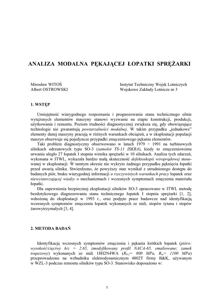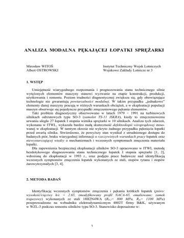 ANALIZA MODALNA PĘKAJĄCEJ ŁOPATKI SPRĘŻARKI Mirosław WITOŚ Albert OSTROWSKI Instytut Techniczny Wojsk Lotniczych Wojskowe Zakłady Lotnicze nr 3 1. WSTĘP Umiejętność wiarygodnego rozpoznania i prognozowania stanu technicznego silnie wytężonych elementów maszyny stanowi wyzwanie na etapie konstrukcji, produkcji, użytkowania i remontu. Poziom trudności diagnostycznej zwiększa się, gdy obowiązujące technologie nie gwarantują powtarzalności modalnej. W takim przypadku „jednakowe” elementy danej maszyny pracują w różnych warunkach obciążeń, a w eksploatacji populacji maszyn obserwuje się pojedyncze przypadki zmęczeniowego pękania elementów. Taki problem diagnostyczny obserwowano w latach 1979 ÷ 1991 na turbinowych silnikach odrzutowych typu SO-3 (samolot TS-11 ISKRA), kiedy to zmęczeniowemu urwaniu uległo 27 łopatek I stopnia wirnika sprężarki w 10 silnikach. Analiza tych zdarzeń, wykonana w ITWL, wykazała bardzo małą skuteczność defektoskopii wiroprądowej stosowanej w eksploatacji. W tamtym okresie nie wykryto żadnego przypadku pęknięcia łopatki przed awarią silnika. Stwierdzono, że powyższy stan wynikał z utrudnionego dostępu do badanych piór, braku wiarygodnej informacji o rzeczywistych warunkach pracy łopatek oraz niewystarczającej wiedzy o mechanizmach i wczesnych symptomach zmęczenia materiału łopatki. Dla zapewnienia bezpiecznej eksploatacji silników SO-3 opracowano w ITWL metodę bezdotykowego diagnozowania stanu technicznego łopatek I stopnia sprężarki [1, 2], wdrożoną do eksploatacji w 1993 r., oraz podjęto prace badawcze nad identyfikacją wczesnych symptomów zmęczenia łopatek wykonanych ze stali, stopów tytanu i stopów żarowytrzymałych [3, 4]. 2. METODA BADAŃ Identyfikację wczesnych symptomów zmęczenia i pękania krótkich łopatek (pióro: wysokość/cięciwy h/c = 2.65, zmodyfikowany profil NACA-65, emaliowane; zamek trapezowy) wykonanych ze stali 18H2N4WA (R0.2= 800 MPa, Rm= 1100 MPa) przeprowadzono na wzbudniku elektrodynamicznym 4802T firmy B&K, używanym w WZL-3 podczas remontu silników typu SO-3. Stanowisko doposażono w: 1 - laserowy układ pomiaru odległości MicroTrackTMII z głowicę pomiarową LTC-120-40 firmy MTI Instrument [5]; - moduł VR-8500 zawierający trzy 24-bitowe przetworniki A/C oraz programowo sterowany generator sygnału wymuszającego i oprogramowanie VibrationView firmy Vibration Research Corporation [6]. Ideą optycznej metody pomiaru drgań łopatki jest proporcjonalne odwzorowanie amplitudy przemieszczeń powierzchni pióra, podświetlanej laserem, na matrycy CMOS głowicy pomiarowej. Na wyjściu analogowego układu pomiarowego otrzymywany jest sygnał napięciowy, którego pasmo częstotliwości ograniczono filtrem dolnopasmowym do 20 kHz. Czułość toru pomiarowego wynosi 100 mV/mm. Szczegółowa analiza zarejestrowanych danych (plików ASCII) była realizowana z wykorzystaniem programu EXCEL. Podczas identyfikacji właściwości modalnych łopatki bazowano na transmitancji operatorowej G (ω ) = Y (ω ) X (ω ) ⎡ mm ⎤ ⎢⎣ mm ⎥⎦ (1) gdzie X(ω) – amplituda wymuszeń sinusoidalnych głowicy wzbudnika; Y(ω) – amplituda drgań łopatki w zadanej odległości od zamka i krawędzi. 3. WYNIKI BADAŃ Badania zrealizowano w trzech etapach, podczas których: - zweryfikowano metodę pomiarową; - zidentyfikowano symptomy pęknięcia stalowej łopatki na krzywej rezonansowej; - zidentyfikowano wczesne symptomy zmęczenia materiału łopatki. 3.1. Wpływ warunków pomiaru na charakterystykę rezonansową łopatki Analizie poddano podstawowe czynniki metrologiczne, których nie można było zaniedbać przy dokładnym badaniu charakterystyki rezonansowej danego modu łopatki. Ich wpływ na analizowane parametry zestawiono w tabeli 1. Tabela 1. Wpływ czynników metrologicznych na charakterystykę rezonansową łopatki. Parametr Czynnik metrologiczny charakterystyki rezonansowej Kształt krzywej rezonansowej Szybkość zmian częstotliwości wymuszającej Poziom wymuszeń Wzmocnienie w rezonansie Położenie punktu pomiarowego na powierzchni pióra Poziom wymuszeń Wzajemne ustawienie głowicy pomiarowej i łopatki Częstotliwość rezonansowa Szybkość zmian częstotliwości wymuszającej Poziom wymuszeń Warunki mocowania łopatki w głowicy wzbudnika 2 Stwierdzono, że zastosowana metoda badań gwarantuje wiarygodne wyniki pomiaru amplitudy, częstotliwości i fazy drgań łopatki przy amplitudzie przemieszczeń pióra powyżej 2 µm. Wiarygodne odwzorowanie kształtu krzywej rezonansowej uzyskano przy szybkości zmian częstotliwości wymuszającej do: 2.5 Hz/min – dla I modu (giętego, Qs >350) i 1.0 Hz/min – dla III modu (skrętnego, Qs > 1000). 3.2. Dotychczasowe symptomy pękniętej łopatki W produkcji i remoncie silnika SO-3 stan techniczny wszystkich łopatek I stopnia sprężarki oceniany jest na podstawie pomiaru częstotliwości drgań własnych I modu i wyników defektoskopii magnetycznej. Podejrzane o pęknięcie łopatki weryfikowane są metodą defektoskopii fluoroscencyjnej. Trzy łopatki, losowo wybrane z badanej populacji (każdego silnika/serii produkcyjnej), poddawane są próbie zmęczeniowej na częstotliwości I modu (σ = 490 MPa, 2x106 cykli) [7]. Symptomem diagnostycznym pęknięcia pióra i wybrakowania badanej populacji łopatek jest zmniejszenie częstotliwości drgań o więcej niż 3 Hz. Wiarygodność wyników próby zmęczeniowej, odniesiona do badanej populacji łopatek, maleje podczas kolejnych remontów silnika. Obowiązujący warunek zmiany częstotliwości o 3 Hz odwzorowuje rozwinięte pęknięcie pióra o długości 2 ÷ 10 mm (wartość zależna od położenia ogniska pęknięcia). Podczas pracy silnika SO-3 (w remoncie i eksploatacji) oceniane są rzeczywiste warunki pracy łopatek i bieżący ich stan techniczny. Symptomem diagnostycznym wczesnej fazy pęknięcia obciążonego pióra łopatki jest zmniejszenie cz
