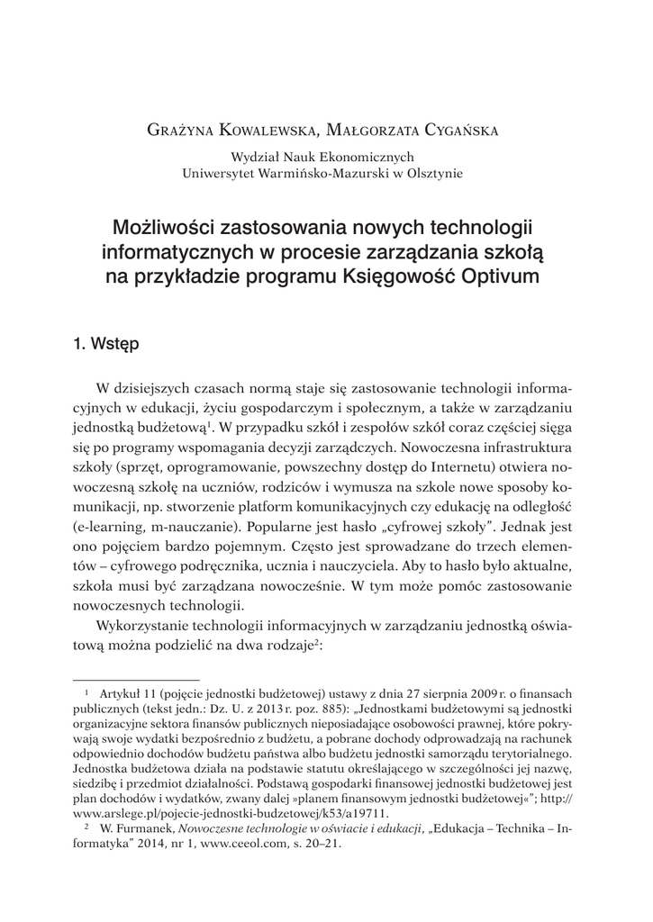 Grażyna Kowalewska, Małgorzata Cygańska Wydział Nauk Ekonomicznych Uniwersytet Warmińsko-Mazurski w Olsztynie Możliwości zastosowania nowych technologii informatycznych w procesie zarządzania szkołą na przykładzie programu Księgowość Optivum 1. Wstęp W dzisiejszych czasach normą staje się zastosowanie technologii informacyjnych w edukacji, życiu gospodarczym i społecznym, a także w zarządzaniu jednostką budżetową1. W przypadku szkół i zespołów szkół coraz częściej sięga się po programy wspomagania decyzji zarządczych. Nowoczesna infrastruktura szkoły (sprzęt, oprogramowanie, powszechny dostęp do Internetu) otwiera nowoczesną szkołę na uczniów, rodziców i wymusza na szkole nowe sposoby komunikacji, np. stworzenie platform komunikacyjnych czy edukację na odległość (e-learning, m-nauczanie). Popularne jest hasło „cyfrowej szkoły”. Jednak jest ono pojęciem bardzo pojemnym. Często jest sprowadzane do trzech elementów – cyfrowego podręcznika, ucznia i nauczyciela. Aby to hasło było aktualne, szkoła musi być zarządzana nowocześnie. W tym może pomóc zastosowanie nowoczesnych technologii. Wykorzystanie technologii informacyjnych w zarządzaniu jednostką oświatową można podzielić na dwa rodzaje2: 1 Artykuł 11 (pojęcie jednostki budżetowej) ustawy z dnia 27 sierpnia 2009 r. o finansach publicznych (tekst jedn.: Dz. U. z 2013 r. poz. 885): „Jednostkami budżetowymi są jednostki organizacyjne sektora finansów publicznych nieposiadające osobowości prawnej, które pokrywają swoje wydatki bezpośrednio z budżetu, a pobrane dochody odprowadzają na rachunek odpowiednio dochodów budżetu państwa albo budżetu jednostki samorządu terytorialnego. Jednostka budżetowa działa na podstawie statutu określającego w szczególności jej nazwę, siedzibę i przedmiot działalności. Podstawą gospodarki finansowej jednostki budżetowej jest plan dochodów i wydatków, zwany dalej »planem finansowym jednostki budżetowej«”; http:// www.arslege.pl/pojecie-jednostki-budzetowej/k53/a19711. 2 W. Furmanek, Nowoczesne technologie w oświacie i edukacji, „Edukacja – Technika – Informatyka” 2014, nr 1, www.ceeol.com, s. 20–21. 372 Grażyna Kowalewska, Małgorzata Cygańska • nadzorowanie procesu wychowawczo-dydaktycznego, można tu zaliczyć dane o uczniach, planie lekcji i zastępstw, arkusz organizacyjny; • planowanie i wspomaganie prac administracyjnych, zwłaszcza działu finansowo-księgowego, kadr. Sztandarowym przykładem zastosowania technologii informatycznych w zarządzaniu oświatą na poziomie całego kraju jest System Informacji Oświatowej (SIO)3. Był on stworzony po to, aby otrzymać jedną, spójną bazę informacji z zakresu sprawozdawczości statystycznej. Zawiera dane na temat: zajmowanego terenu; posiadanych pomieszczeń; wyposażenia oraz kosztów prowadzenia jednostki; ewidencji nauczycieli oraz pracowników niepedagogicznych (również dane dotyczące wynagrodzenia); uczniów; absolwentów i spełniania obowiązku nauki. Szkoły jedynie gromadzą te informacje, nie muszą ich samodzielnie analizować i interpretować. Dane te są dostępne dla wszystkich instytucji publicznych. Nowym trendem w szkolnictwie jest wprowadzanie zintegrowanych systemów zarządzania oświatą. Przykładem potwierdzającym może być wdrożony przez Gminę Miejską Kraków projekt Zintegrowanego Systemu Zarządzania Oświatą4. W ramach tego projektu został stworzony zintegrowany system informatyczny oraz zakupiono platformę sprzętową, zapewniającą jednolity system oprogramowania i przepływu informacji pomiędzy 351 szkołami i placówkami oświatowymi, zespołami ekonomiki oświaty a Wydziałem Edukacji Urzędu Miasta Krakowa w zakresie organizacji pracy, bazy danych ogólnych oraz spraw: kadrowych, płacowych i finansowych. Ze względów finansowych nie wszystkie gminy stać na takie rozwiązanie modelowe. W przypadku gminy Olsztyn jednostki oświatowe korzystają z 769 programów komputerowych wchodzących w skład pakietów. Najczęściej korzystają z oprogramowania firm: Vulcan, ProgMan i Librus. W 76 jednostkach są używane 24 rodzaje oprogramowania, w tym: arkusz organizacji (wszystkie jednostki), księgowość (70 jednostek), płace (70 jednostek), kadry (67 jednostek), świadectwa (40 jednostek), sekretariat (40 jednostek)5. Rachunkowość pełni funkcję informacyjną w kontekście procesów zarządczych, dlatego integralną część pakietów wspomagających zarządzanie stanowią moduły finansowe, w skład których wchodzą programy księgowe. Księgi Powołany do życia 1 stycznia 2005 r. na mocy ustawy o systemie informacji oświatowej (Dz. U z 2004 r. Nr 49, poz. 463). 4 https://www.bip.krakow.pl/?dok_id=18477 [odczyt 16.07.2015]. 5 https://www.olsztyn.eu/fileadmin/katalogi...proj.../ocena_polityki_2011.doc [odczyt 16.07.2015]. 3 Możliwości zastosowania nowych technologii informatycznych w procesie... 373 rachunkowe mogą być prowadzone ręcznie, ale obecnie, ze względu na postęp technologiczny, ta metoda jest coraz rzadziej stosowana6. Literatura dotycząca informatyzacji jednostek oświatowych nie jest bogata, zwłaszcza ta dotycząca opisanego oprogramowania. Jednakże dyskusja nad wprowadzeniem nowych technologii do szkół toczy się już od jakiegoś czasu i jest aktualna. Definicja nowych technologii w szkolnictwie może być rozumiana różnorako. W wąskim zakresie przez to pojęcie można rozumieć jedynie zastosowanie technologii w dydaktyce, np. wykorzystanie tablic interaktywnych czy instrumentarium technologii informacyjnych w e-learningu7. O zastosowaniu technologii informacyjnych w oświacie w szerszym znaczeniu zaczął pisać R. Pachociński8. Wskazał on nie tylko możliwości zastosowania technologii informacyjnych w zarządzaniu szkołą jako całością, ale również praktyczne jej użycie np. w księgowości. Potrzeba zastosowania nowoczesnych technologii9 jest cz