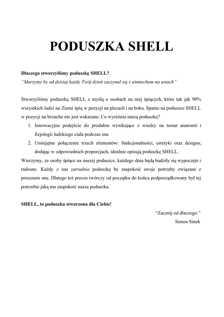 PODUSZKA SHELL Dlaczego stworzyliśmy poduszkę SHELL? “Marzymy by od dzisiaj każdy Twój dzień zaczynał się z uśmiechem na ustach” Stworzyliśmy poduszkę SHELL z myślą o osobach na niej śpiących, które tak jak 90% wszystkich ludzi na Ziemi śpią w pozycji na plecach i na boku. Spanie na poduszce SHELL w pozycji na brzuchu nie jest wskazane. Co wyróżnia naszą poduszkę? 1. Innowacyjne podejście do produktu wynikające z wiedzy na temat anatomii i fizjologii ludzkiego ciała podczas snu 2. Umiejętne połączenie trzech elementów: funkcjonalności, estetyki oraz designu, dodając w odpowiednich proporcjach, idealnie opisują poduszkę SHELL. Wierzymy, ze osoby śpiące na naszej poduszce, każdego dnia będą budziły się wypoczęte i radosne. Każdy z nas zatrudnia poduszkę by zaspokoić swoje potrzeby związane z procesem snu. Dlatego też proces twórczy od początku do końca podporządkowany był tej potrzebie jaką ma zaspokoić nasza poduszka. SHELL, to poduszka stworzona dla Ciebie! “Zacznij od dlaczego.” Simon Sinek ANATOMIA – POZYCJA NA PLECACH Większość poduszek dostępnych na światowym rynku nie powinna być zastosowana w przypadku spania w pozycji na plecach, gdyż ich kształt uniemożliwia zachowanie neutralnej pozycji kręgosłupa szyjnego. Prawidłowa pozycja kręgosłupa oraz kończyn w posturologii określana jest poprzez wyznaczenie linii ucho staw skokowy. W neutralnych, fizjologicznych warunkach linia ta powinna przebiegać przez ucho, bark, miednicę, staw kolanowy i staw skokowy (oznaczona na żółto). Kolejną linię wyznaczają plecy i pośladki (oznaczona kolorem zielonym). Odchylenie głowy w stosunku do linii plecypośladki powinno wynosić u osoby z prawidłową sylwetką ciała maksymalnie 3 cm. W momencie, gdy głowa zostaje zbyt mocno oddalona od linii plecypośladki (fachowo ten stan określany jest protrakcją odcinka szyjnego) – dochodzi do zmian patologicznych w obrębie szyi, które rzutują nie tylko na asymetryczne napięcie mięśni w obrębie karku, ale również przenoszą się na dalsze odcinki kręgosłupa. Ciężar ciała przenosi się ku przodowi, odcinek szyjny kręgosłupa ulega wypłaszczeniu zanika fizjologiczna lordoza szyjna. W wyniku kompensaty dochodzi do pogłębienia wygięcia kifotycznego kręgosłupa piersiowego oraz do pogłębienia lordozy lędźwiowej. Miednica ulega nadmiernemu przodopochyleniu. Wszystkie te zmiany ukazano na rysunku poniżej. Należy pamiętać, że jest to zaledwie jeden z możliwych scenariuszy mogących wyniknąć z nieprawidłowego ustawienia głowy. Bowiem u różnych osób napięcia mogą przenosić się i kompensować w odmienny sposób, dając inny obraz kliniczny, zawsze jednak odbiegający od fizjologii. Protrakcja głowy, czyli jej nadmierne wysunięcie ku przodowi skutkuje wieloma efektami ubocznymi. W związku z wypłaszczeniem lordozy szyjnej kręgosłupa dochodzi do nieprawidłowego rozłożenia sił na krążki międzykręgowe, co skutkować może dyskopatiami oraz stanami zwyrodnieniowymi kręgów szyjnych. Wysunięty dysk może uciskać na nerwy, powodując bóle lub drętwienie kończyn. Ponadto dochodzi do nieprawidłowego napięcia poszczególnych mięśni w obrębie samej szyi. Złe ustawienie głowy może również zaburzać przepływ krwi przez naczynia krwionośne. Osobom z nieprawidłowym ustawieniem głowy mogą towarzyszyć liczne dolegliwości, takie jak bóle głowy oraz karku, szumy uszne, zawroty głowy, migreny, zaburzenia wzroku a nawet nudności czy omdlenia. Na rysunkach poniżej ukazano dwa ułożenia głowy, nieprawidłowe (głowa w protrakcji) oraz prawidłowe (naturalna lordoza szyjna). Naturalne, fizjologiczne ustawienie głowy i kręgosłupa szyjnego jest zatem niezwykle istotnym czynnikiem dla zdrowia. Pozycja fizjologiczna powinna być również odwzorowana podczas snu. Jak wspomniano na wstępie, większość poduszek dostępnych na światowych rynkach, w tym również poduszek o charakterze ortopedycznym uniemożliwia zachowanie prawidłowego ułożenia kręgosłupa szyjnego podczas spania w pozycji na wznak . Poduszki te są zbyt wysokie, powodując wysuwanie głowy ku przodowi protrakcję. INNOWACJA – REWOLUCJA Poduszka SHELL w miejscu spoczynku guza potylicznego ma zaledwie 3 cm materiału, co pozwala na naturalne, fizjologiczne ułożenie głowy w pozycji spania na plecach. Jest to zupełnie zrewolucjonizowane podejście do snu. Na wysokości odcinka szyjnego w poduszce SHELL zastosowany został specjalny profil, dostosowany do neutralnej, naturalnej pozycji poszczególnych kręgów. Leżąc na plecach na poduszce SHELL głowa spoczywa w owalnym zagłębieniu, dostosowanym do kształtu czaszki co powoduje zmniejszenie nacisku punktowego na guz potyliczny i równomierne rozłożenie go na tył czaszki. Profil szyjny (wzniesienie pod kręgosłupem szyjnym) dopasowany został do fizjologicznego kształtu lordozy szyjnej. Dla zwiększenia komfortu w poduszce SHELL zastosowano łagodne zejście profilu szyjnego oraz jego szerokie wyprofilowanie dla stawów barkowych. Dzięki temu poduszka nie opiera się na ramionach, umożliwiając swobodne oddychanie oraz maksymalne rozluźnienie mięśni karku. ANTOMIA – POZYCJA NA BOKU Wiele reklam karmi nas nieprawidłowymi i mylnymi wiadomościami dotyczącymi ustawienia ciała podczas snu w pozycji na boku. Na większości rysunków ukazujących śpiące na boku osoby sylwetka ciała jest wyprostowana, ramiona ułożone wzdłuż ciała, nogi wyprostowane a ciężar klatki piersiowej ułożony bezpośrednio na kości ramieniowej. Te piękne rysunki ukazują nam obraz zupełnie prostej sylwetki, w której nasze ciało przybiera idealnie symetryczną pozycję: Prawie nigdy nie śpimy w takiej pozycji! Nawet jeśli uśniemy w ten sposób – po kilku minutach nasze ciało ułoży się asymetrycznie. W idealnym świecie reklamy, śpiąc w pozycji zupełnie wyprostowanej tradycyjna poduszka 