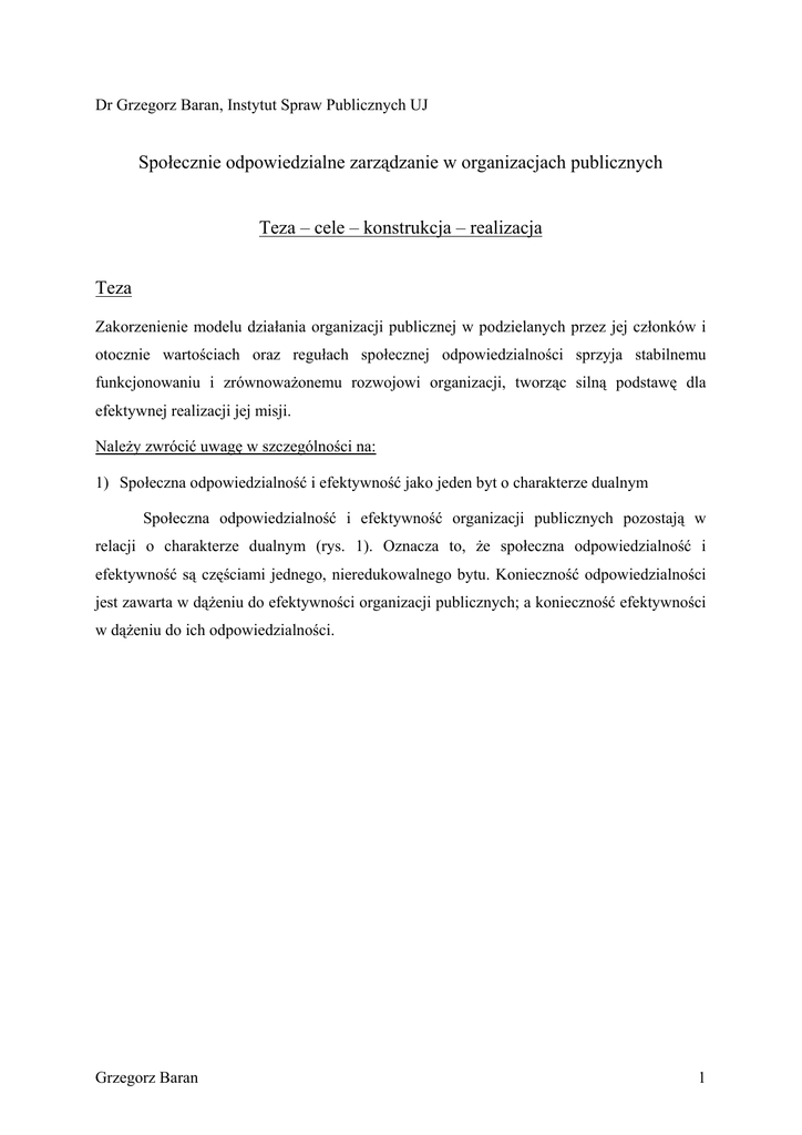 Dr Grzegorz Baran, Instytut Spraw Publicznych UJ Społecznie odpowiedzialne zarządzanie w organizacjach publicznych Teza – cele – konstrukcja – realizacja Teza Zakorzenienie modelu działania organizacji publicznej w podzielanych przez jej członków i otocznie wartościach oraz regułach społecznej odpowiedzialności sprzyja stabilnemu funkcjonowaniu i zrównoważonemu rozwojowi organizacji, tworząc silną podstawę dla efektywnej realizacji jej misji. Należy zwrócić uwagę w szczególności na: 1) Społeczna odpowiedzialność i efektywność jako jeden byt o charakterze dualnym Społeczna odpowiedzialność i efektywność organizacji publicznych pozostają w relacji o charakterze dualnym (rys. 1). Oznacza to, że społeczna odpowiedzialność i efektywność są częściami jednego, nieredukowalnego bytu. Konieczność odpowiedzialności jest zawarta w dążeniu do efektywności organizacji publicznych; a konieczność efektywności w dążeniu do ich odpowiedzialności. Grzegorz Baran 1 Rysunek 1. Dualny charakter relacji pomiędzy społeczną odpowiedzialnością i efektywnością organizacji publicznych Efektywność Dynamiczne napięcie/dopasowanie Odpowiedzialność Źródło: Opracowanie własne. W ramach przedstawionej dualnej zależności istnieje dynamiczne, nieredukowalne napięcie pomiędzy społeczną odpowiedzialnością i efektywnością w ramach wspólnej struktury, które z kolei przekłada się na napięcie pomiędzy organizacją publiczną i jej otoczeniem (rys. 1). Niezrozumienie istoty tego napięcia może prowadzić do sytuacji, w których zarządzanie zostanie zbytnio skupione na dążeniu do wysokiej efektywności kosztem odpowiedzialności za ważne dla organizacji i realizacji jej społecznej misji wartości, co z kolei przełoży się na obniżenie efektywności w długim okresie. 2) Społeczna odpowiedzialność a przewaga konkurencyjna Model działania organizacji publicznych oparty o reguły społecznej odpowiedzialności jest stabilną podstawą dla budowania trwałej przewagi konkurencyjnej organizacji, co warunkuje wysoką efektywność realizacji misji. Społeczną odpowiedzialność w tym kontekście należy ująć dynamicznie jako zdolność odpowiadania: (a) za otoczenie, (b) na to, co dzieje się w otoczeniu, (c) wobec otoczenia. Przewagę konkurencyjną należy rozumieć jako wiązkę kluczowych kompetencji, opisujących strategiczne umiejętności, czyli to co i na bazie jakich zasobów organizacja potrafi robić naprawdę dobrze. Kluczowe kompetencje są uzewnętrzniane w formie procesów prowadzących do mobilizacji i odtwarzania zasobów w celu budowania przewagi konkurencyjnej. Same kompetencje są Grzegorz Baran 2 bowiem trudne do oznaczenia i widoczne dopiero w postaci procesów. Nie chodzi tu jednak o procesy jako ściśle zaprojektowaną sekwencję działań prowadzących do realizacji postawionego celu. Rozumienie kompetencji jako procesów odnosi się do dynamicznego charakteru tych umiejętności efektywnego pozyskiwania, wykorzystywania i odtwarzania zasobów. 3) Łańcuch i sieć tworzenia wartości jako przeniesienie dynamicznego napięcia pomiędzy odpowiedzialnością i efektywnością na proces zarządzania Rysunek 2. Łańcuch tworzenia wartości i wynikająca z niego konstrukcja pracy ODPOWIEDZIALNOŚĆ ZA PLANOWANIE Zrównoważone wykorzystanie i odtwarzanie zasobów ORGANIZOWANIE Kapitał społeczny oraz jego mobilizację KIEROWANIE Przejrzystość i społeczną legitymizację działań WARTOŚCI Wybór najlepszych pomysłów i projektów KONTROLA Rozdział 1. Odpowiedzialność organizacji publicznych podstawą zarządzania zakorzenionego w społecznie podzielanych wartościach Rozdział 2. Odpowiedzialność za wybór najlepszych pomysłów, projektów i decyzji w procesie planowania i budowy strategii w organizacjach publicznych Rozdział 3. Odpowiedzialność za mobilizację oraz zrównoważone wykorzystanie i odtwarzanie zasobów Rozdział 4. Odpowiedzialność za kapitał społeczny oraz jego mobilizację do budowania przewagi konkurencyjnej Rozdział 5. Odpowiedzialność za przejrzystość i społeczną legitymizację podejmowanych działań Źródło: Opracowanie własne Przejście od łańcucha tworzenia wartości znanego z teorii zarządzania strategicznego (m.in. M.E. Porter, K. Obłój) do sieci tworzenia wartości (rys. 3) ma znaczenie symboliczne Grzegorz Baran 3 dla zobrazowania zmian w zarządzaniu, których należy dokonać dla dalszego zwiększenia jego efektywności. Rysunek 3. Sieć tworzenia wartości Sieć tworzenia wartości Odpowiedzialność za przejrzystość i legitymizację działań Mobilizacja oraz zrównoważone wykorzystanie i odtwarzanie zasobów Społecznie podzielane WARTOŚCI Odpowiedzialność za kapitał społeczny i jego mobilizację Odpowiedzialność za wybór najlepszych pomysłów, projektów i decyzji Źródło: Opracowanie własne. Myślenie w kategoriach łańcucha działań wymusza projektowanie kolejnych etapów działań – od planowania, przez organizowanie i kierowanie do kontroli. Zarządzanie strategiczne po pierwsze powinno być zbudowane w oparciu o zasady równoległości myślenia, a po drugie jako zarządzanie otwarte. Stąd proponuje się przejście od łańcucha wartości w kierunku sieci tworzenia wartości. Sieć tworzenia wartości sugeruje otwartość na inne organizacje i społeczeństwo w ogóle w tworzeniu wspólnych wartości, za które odpowiedzialna jest organizacja publiczna. Funkcjonując w sieci, organizacja publiczna może dzielić odpowiedzialność za pewne wartości (rys. 4). Podejście to zarysowuje nowe perspektywy rozwoju zarządzania w sektorze publicznym otwartego na współpracę i budowanie sieci współpracy z innymi partnerami w oparciu o reguły społecznej odpowiedzialności. Grzegorz Baran 4 Rysunek 4. Współodpowiedzialność we współpracy organizacji publicznych w sieci tworzenia wartości Media Przejrzystość działa