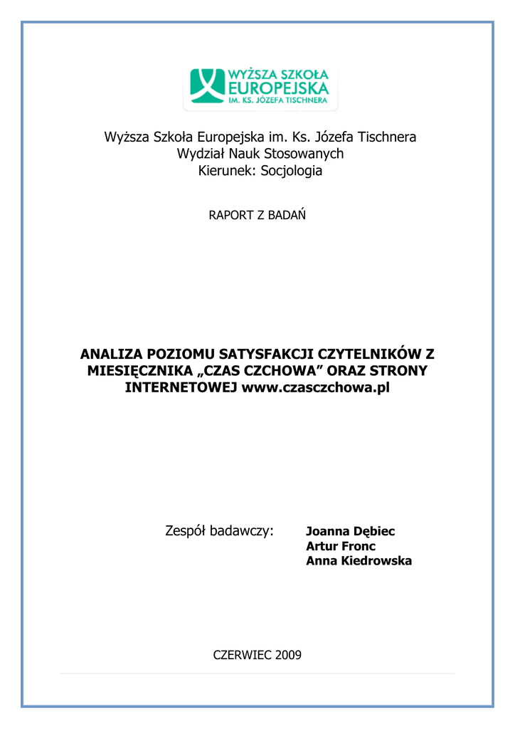 WyŜsza Szkoła Europejska im. Ks. Józefa Tischnera Wydział Nauk Stosowanych Kierunek: Socjologia RAPORT Z BADAŃ ANALIZA POZIOMU SATYSFAKCJI CZYTELNIKÓW Z MIESIĘCZNIKA „CZAS CZCHOWA” ORAZ STRONY INTERNETOWEJ www.czasczchowa.pl Zespół badawczy: CZERWIEC 2009 Joanna Dębiec Artur Fronc Anna Kiedrowska KRAKÓW Spis treści I. Główne wnioski i rekomendacje...................................................................................................... 2 II. Wstęp............................................................................................................................................... 5 1. Cel i uzasadnienie badań ............................................................................................................. 5 2. Zastosowana metodologia .......................................................................................................... 6 a) Wyniki pretestu ....................................................................................................................... 8 3. Promocja badań........................................................................................................................... 9 4. Realizacja badań ........................................................................................................................ 11 5. Charakterystyka respondentów ................................................................................................ 12 6. Harmonogram prac ................................................................. Błąd! Nie zdefiniowano zakładki. III. Wyniki badań ................................................................................................................................. 14 1. Nawyki czytelnicze..................................................................................................................... 14 b) Ogólne nawyki czytelnicze..................................................................................................... 14 c) Nawyki czytelnicze dotyczące Czasu Czchowa ..................................................................... 15 2. Ważność a satysfakcja ............................................................................................................... 21 a) Sugestie czytelników ............................................................................................................. 22 3. Strona internetowa ................................................................................................................... 29 4. Popularność wydawnictwa........................................................................................................ 33 a) Kontakt z redakcją ................................................................................................................. 33 b) Zainteresowanie prenumeratą.............................................................................................. 34 Spis tabel Spis wykresów 1|Strona I. Główne wnioski i rekomendacje Wnioski są przedstawione w podziale na następujące działy: Ogólne nawyki czytelnicze, Nawyki czytelnicze dotyczące Czasu Czchowa, Ważność a satysfakcja, Sugestie czytelników, Strona internetowa oraz Popularność wydawnictwa. Taką samą kolejność otrzymały wyniki badań omówione szerzej w rozdziale III. Ogólne nawyki czytelnicze • Najczęściej czytany dziennik przez badanych to „Dziennik Polska Europa Świat 80 proc. respondentów. Kolejnymi co do popularności, wydawanymi codzienne, gazetami są „Dziennik Polski” oraz „Polska Gazeta Krakowska”. Ważne podkreślenia dla naszych badań jest to, iż są to gazety regionalne dostępne na ograniczonym obszarze to jest w Małopolsce i na Podkarpaciu. Jest to istotna informacja dla wydawcy „Czasu Czchowa”, gdyż wskazuje na przywiązanie respondentów do regionu i potrzebę posiadania informacji lokalnych. Nawyki czytelnicze dotyczące Czasu Czchowa • Ponad połowa respondentów wskazała jako powód, dla którego czyta „Czas Czchowa” odpowiedź „Ponieważ jest to gazeta czchowska”; taki sam odsetek badanych wskazało też na informacje lokalne. • Blisko połowa przebadanych respondentów to stali czytelnicy, którzy kupują gazetę regularnie co miesiąc. Grupa czytelników, która nie czyta drukowanego wydania gazety, a jedynie odwiedza jej stronę internetową stanowi 12,5 proc. wszystkich respondentów. Warto zwrócić uwagę na fakt, iż większość ankiet została wypełniona przez Internet – co oznacza, że znaczny odsetek badanych zarówno kupuje gazetę drukowaną, jak i odwiedza stronę internetową. Taki rezultat podkreśla fakt integralności oraz komplementarności obu nośników. Pewne zróżnicowanie treści w obu nośnikach zdaje się być dobrze obranym kierunkiem wzajemnej promocji. • Najchętniej czytane działy to : Wydarzenia – 55 proc. badanych, Samorządność lokalna –39 proc., Ocalić od zapomnienia – 37 proc. Dużym zaskoczeniem może okazać się całkiem dobry wynik dla rubryk traktujących o tradycji i historii lokalnej. Tematyką ta zajmują się następujące działy: Ocalić od zapomnienia, Stara fotografia oraz Zwyczaje, obrzędy, tradycje. Wskazało je odpowiednio 37, 19 i 14 procent badanych. • Blisko połowa respondentów (42 proc.) byłoby usatysfakcjonowanych informacjami pochodzącymi z obszaru gminy Czchów i gmin sąsiednich. Ponad 70 2|Strona proc. badanych oczekujących informacji z gminy Czchów i jej sąsiednich gmin mieszka poza Czchowem. Jest to sygnał dla redakcji, że ograniczenie informacji do samej gminy Czchów nie jest przez tych czytelników pożądane. Ważność a satysfakcja • • Dla większości respondentów rzetelna informacja w gazecie jest najważniejsza; równocześnie oceniają rzetelność informacji w „Czasie Czchowa” na poziomie średniej Warto zwracać uwagę przy przygotowywaniu kolejnych numerów na jakość szaty graficznej oraz aby 