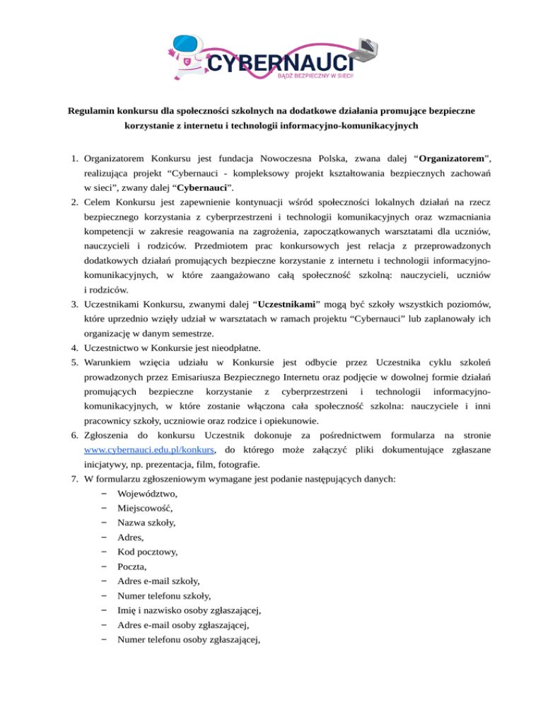 Regulamin konkursu dla społeczności szkolnych na dodatkowe działania promujące bezpieczne korzystanie z internetu i technologii informacyjno-komunikacyjnych 1. Organizatorem Konkursu jest fundacja Nowoczesna Polska, zwana dalej “Organizatorem”, realizująca projekt “Cybernauci - kompleksowy projekt kształtowania bezpiecznych zachowań w sieci”, zwany dalej “Cybernauci”. 2. Celem Konkursu jest zapewnienie kontynuacji wśród społeczności lokalnych działań na rzecz bezpiecznego korzystania z cyberprzestrzeni i technologii komunikacyjnych oraz wzmacniania kompetencji w zakresie reagowania na zagrożenia, zapoczątkowanych warsztatami dla uczniów, nauczycieli i rodziców. Przedmiotem prac konkursowych jest relacja z przeprowadzonych dodatkowych działań promujących bezpieczne korzystanie z internetu i technologii informacyjnokomunikacyjnych, w które zaangażowano całą społeczność szkolną: nauczycieli, uczniów i rodziców. 3. Uczestnikami Konkursu, zwanymi dalej “Uczestnikami” mogą być szkoły wszystkich poziomów, które uprzednio wzięły udział w warsztatach w ramach projektu “Cybernauci” lub zaplanowały ich organizację w danym semestrze. 4. Uczestnictwo w Konkursie jest nieodpłatne. 5. Warunkiem wzięcia udziału w Konkursie jest odbycie przez Uczestnika cyklu szkoleń prowadzonych przez Emisariusza Bezpiecznego Internetu oraz podjęcie w dowolnej formie działań promujących bezpieczne korzystanie z cyberprzestrzeni i technologii informacyjno- komunikacyjnych, w które zostanie włączona cała społeczność szkolna: nauczyciele i inni pracownicy szkoły, uczniowie oraz rodzice i opiekunowie. 6. Zgłoszenia do konkursu Uczestnik dokonuje za pośrednictwem formularza na stronie www.cybernauci.edu.pl/konkurs, do którego może załączyć pliki dokumentujące zgłaszane inicjatywy, np. prezentacja, film, fotografie. 7. W formularzu zgłoszeniowym wymagane jest podanie następujących danych: − Województwo, − Miejscowość, − Nazwa szkoły, − Adres, − Kod pocztowy, − Poczta, − Adres e-mail szkoły, − Numer telefonu szkoły, − Imię i nazwisko osoby zgłaszającej, − Adres e-mail osoby zgłaszającej, − Numer telefonu osoby zgłaszającej, − Krótki opis inicjatywy, − Rodzaj inicjatywy, − Czas trwania inicjatywy, − Opis inicjatywy (max 1800 znaków), − Liczba uczestników, − Charakterystyka uczestników, − Jak uczniowie zostali zaangażowani w inicjatywę? − Jak rodzice zostali zaangażowani w inicjatywę? − Jak nauczyciele zostali zaangażowani w inicjatywę? − Co jest największym efektem inicjatywy? Co społeczność szkolna zyskała dzięki niej? − Co uległoby zmianie, gdyby inicjatywa organizowana była ponownie? − Rady i wskazówki dla społeczności szkolnych, które chciałyby realizować podobne przedsięwzięcie, − Materiały, które zostały wykorzystane (krótki opis, linki), − Informacja o udzieleniu przez osoby uprawnione wolnej licencji Creative Commons Uznanie autorstwa – Na tych samych warunkach 4.0 do zgłaszanej relacji. Treść licencji dostępna jest pod adresem: https://creativecommons.org/licenses/by-sa/4.0/deed.pl. 8. Każdy Uczestnik może przesłać dowolną liczbę zgłoszeń. 9. Oceny zgłoszonych relacji dokona Jury wybrane przez Organizatora. W skład Jury wchodzić będą co najmniej trzy osoby. 10.Podczas oceny Jury będzie brało pod uwagę następujące kryteria: oryginalność inicjatywy, zaangażowanie różnych grup społeczności szkolnej, jakość i estetyka zgłoszonej relacji. 11.Konkurs będzie organizowany w następujących przedziałach czasowych: − wrzesień 2016 r. - styczeń 2017 r. (roztrzygnięcie: luty 2017 r.) − luty 2017 r. - czerwiec 2017 r. (rozstrzygnięcie: wrzesień 2017 r.) − wrzesień 2017 r. - styczeń 2018 r. (rozstrzygnięcie: luty 2018 r.) − luty 2018 r.- czerwiec 2018 r. (rozstrzygnięcie: wrzesień 2018 r.) − wrzesień 2018 r. - grudzień 2018 r. (rozstrzygnięcie: grudzień 2018 r.) 12.W każdym przedziale czasowym Jury przyzna trzy równoważne nagrody oraz jedną nagrodę w konkursie podsumowującym podczas wydarzenia zamykającego projekt w 2018 r. Jury może również przyznawać wyróżnienia w postaci zaproszenia na wydarzenie podsumowujące projekt. 13.Jury przyzna nagrody, które zostaną zakupione ze środków Ministra Edukacji Narodowej, o łącznej wartości 75 000 zł. 14.W Konkursie nie mogą brać udziału pracownicy Organizatora, a także osoby, którym powierzono określone prace w związku z opracowaniem lub organizacją Konkursu. W Konkursie nie mogą również brać udziału członkowie najbliższych rodzin osób, o których mowa powyżej (tj. ich małżonkowie, dzieci, rodzice i rodzeństwo). 15.Uczestnik jest zobowiązany zapewnić, aby autorzy zgłaszanej relacji wyrazili zgodę na korzystanie z niej zgodnie z postanowieniami wolnej licencji Creative Commons Uznanie autorstwa – Na tych samych warunkach. 16.Uczestnik jest również zobowiązany zapewnić, aby wszystkie osoby uwiecznione na fotografiach i/lub nagraniach (lub ich przedstawiciele ustawowi – gdy dotyczy) wyraziły zgodę na nagrywanie i następnie rozpowszechnianie ich wizerunków w celach promocyjnych. 17.Administratorem danych osobowych Uczestników jest Organizator. Dane przetwarzane są w celu przeprowadzenia Konkursu. Osoba, której dane dotyczą ma prawo dostępu do treści swoich danych oraz ich poprawiania, a w przypadkach wymienionych w art. 23 ust. 1 pkt 4 i 5 ustawy o ochronie danych osobowych wniesienia pisemnego, umotywowanego żądania zaprzestania przetwarzania jej danych ze względu na jej szczególną sytuację oraz wniesienia sprzeciwu wobec przetwarzania jej danych, gdy administrator danych zamierza je przetwarzać w celach marketingowych lub wobec przekazywania jej danych osobowych innemu administratorowi danych.