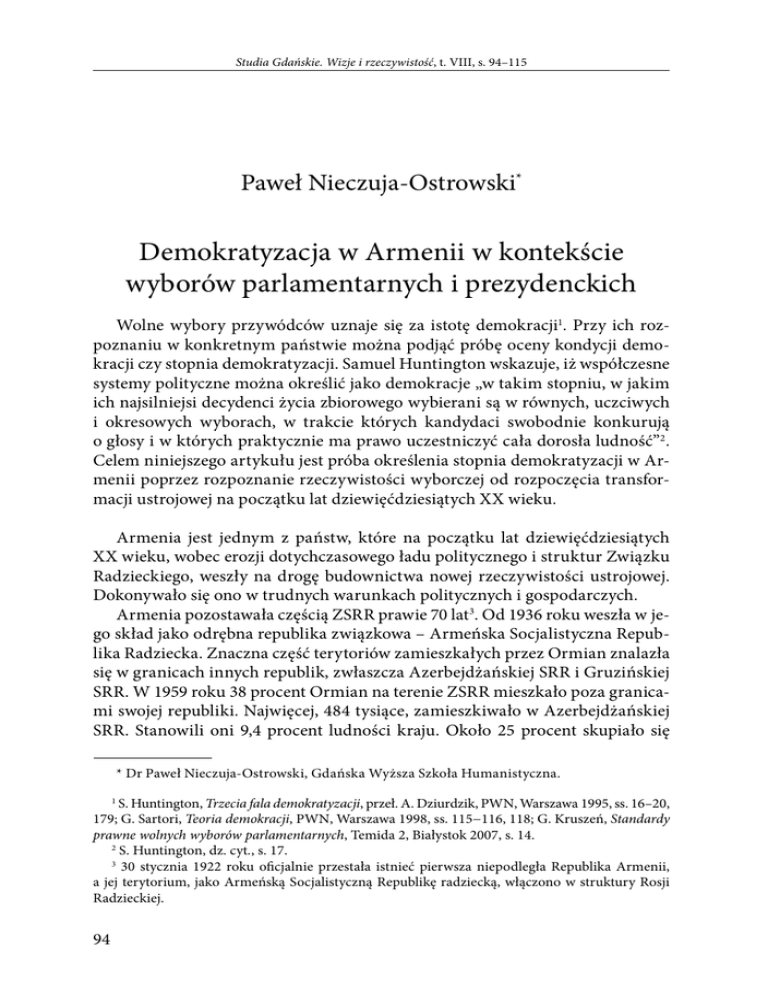 Studia Gdańskie. Wizje i rzeczywistość, t. VIII, s. 94–115 Paweł Nieczuja-Ostrowski* Demokratyzacja w Armenii w kontekście wyborów parlamentarnych i prezydenckich Wolne wybory przywódców uznaje się za istotę demokracji. Przy ich rozpoznaniu w konkretnym państwie można podjąć próbę oceny kondycji demokracji czy stopnia demokratyzacji. Samuel Huntington wskazuje, iż współczesne systemy polityczne można określić jako demokracje „w takim stopniu, w jakim ich najsilniejsi decydenci życia zbiorowego wybierani są w równych, uczciwych i okresowych wyborach, w trakcie których kandydaci swobodnie konkurują o głosy i w których praktycznie ma prawo uczestniczyć cała dorosła ludność”. Celem niniejszego artykułu jest próba określenia stopnia demokratyzacji w Armenii poprzez rozpoznanie rzeczywistości wyborczej od rozpoczęcia transformacji ustrojowej na początku lat dziewięćdziesiątych XX wieku. Armenia jest jednym z państw, które na początku lat dziewięćdziesiątych XX wieku, wobec erozji dotychczasowego ładu politycznego i struktur Związku Radzieckiego, weszły na drogę budownictwa nowej rzeczywistości ustrojowej. Dokonywało się ono w trudnych warunkach politycznych i gospodarczych. Armenia pozostawała częścią ZSRR prawie 70 lat. Od 1936 roku weszła w jego skład jako odrębna republika związkowa – Armeńska Socjalistyczna Republika Radziecka. Znaczna część terytoriów zamieszkałych przez Ormian znalazła się w granicach innych republik, zwłaszcza Azerbejdżańskiej SRR i Gruzińskiej SRR. W 1959 roku 38 procent Ormian na terenie ZSRR mieszkało poza granicami swojej republiki. Najwięcej, 484 tysiące, zamieszkiwało w Azerbejdżańskiej SRR. Stanowili oni 9,4 procent ludności kraju. Około 25 procent skupiało się * Dr Paweł Nieczuja-Ostrowski, Gdańska Wyższa Szkoła Humanistyczna. S. Huntington, Trzecia fala demokratyzacji, przeł. A. Dziurdzik, PWN, Warszawa 1995, ss. 16–20, 179; G. Sartori, Teoria demokracji, PWN, Warszawa 1998, ss. 115−116, 118; G. Kruszeń, Standardy prawne wolnych wyborów parlamentarnych, Temida 2, Białystok 2007, s. 14. S. Huntington, dz. cyt., s. 17. 30 stycznia 1922 roku oficjalnie przestała istnieć pierwsza niepodległa Republika Armenii, a jej terytorium, jako Armeńską Socjalistyczną Republikę radziecką, włączono w struktury Rosji Radzieckiej. 94 Demokratyzacja w Armenii w kontekście wyborów parlamentarnych i prezydenckich w Górskim Karabachu, gdzie stanowili 85 procent mieszkańców. Ludność aglomeracji Baku tworzyli w 16 procentach Ormianie. Według spisu powszechnego w 1989 roku na terytorium Azerbejdżanu zamieszkiwało około 390 tysięcy Ormian, co stanowiło 5,6 procent ludności kraju. W latach osiemdziesiątych XX wieku ujawniły się dążenia czynników oficjalnych Armeńskiej SRR do przyłączenia do republiki Autonomicznego Okręgu Górskiego Karabachu (AOGK) należącego do Azerbejdżańskiej SRR. W wyniku wzrastających na tym tle nastrojów antyormiańskich w Azerbejdżanie doszło w dniach 27−29 lutego 1988 roku do prześladowania Ormian w Sumgaicie. Te i kolejne wystąpienia przeciwko ludności ormiańskiej oraz reakcje z jej strony, w tym oficjalne proklamowanie 12 lipca 1988 roku secesji przez Górski Karabach, doprowadziły do eskalacji konfliktu, który przekształcił się w otwartą wojnę domową, a następnie w wojnę pomiędzy obiema republikami. Kwestia Karabachu stała się ważkim czynnikiem kształtującym politykę Armenii, zarówno zewnętrzną, jak i wewnętrzną. W 1988 roku na fali demonstracji i protestów podejmowanych w celu ochrony konstytucyjnych praw Ormian w Górskim Karabachu wyłonił się Komitet Karabach (Arcachjan Szarżman). W ciągu kilku miesięcy stał się w Armeńskiej SRR potężną siłą polityczną mającą poparcie ogółu społeczeństwa. Czynniki oficjalne ZSRR podjęły próby sparaliżowania działania władz Górskiego Karabachu oraz Komitetu Karabach. W grudniu 1988 roku, wykorzystując trudną sytuację w Armenii spowodowaną tragicznym trzęsieniem ziemi, które spustoszyło północną część republiki i pochłonęło około 25 tysięcy ofiar, wojskowy komendant Erywania aresztował 12 przywódców Komitetu Karabach, między innymi Lewona Ter-Petrosjana (ur. 1945) i Wazgena Manukiana (ur. 1946). Zostali oni natychmiast przewiezieni do moskiewskiego więzienia, gdzie bez rozprawy przetrzymywani byli przez pół roku. W maju 1989 roku pod wpływem nacisków opinii publicznej zostali zwolnieni i w atmosferze tryumfu powrócili do kraju. Komitet Karabach przekształcono w Ormiański Ruch Lernajin Gharabagh − Górski (Górny) Karabach – górzysta część historycznej ormiańskiej krainy, Arcachu; później chanatu karabachskiego. W Gruzińskiej SRR mieszkało 452 tysiące Ormian, to jest 9,7 procent mieszkańców. W Abchaskiej ASRR stanowili oni 16 procent mieszkańców. Także 17 procent mieszkańców stolicy Gruzji Tbilisi było Ormianami. Według spisu powszechnego w 2002 roku w Gruzji mieszkało około 249 tysięcy ludności narodowości ormiańskiej. A. Maryański, Związek Radziecki. Zarys geografii ekonomicznej regionów, PWE, Warszawa 1979, wyd. II zaktualizowane, ss. 60, 367, 369−370, 377, 379−380; The State Statistical Committee of Azerbaijan Republic, www.azstat.org (stan na dzień 25.08.2010 r.); National Statistics Office of Georgia, ww.geostat.ge (stan na dzień 25.08.2010 r.). Co wydarzyło się w Armenii? Wybór z ormiańskiej publikacji niezależnej. Zeszyt 2., Warszawa 1989, s. 7−49; T. Świętochowski, Azerbejdżan, Wydawnictwo TRIO, Warszawa 2006, s. 163. J. Bańbor, J. Berny, D. Kuziel, Konflikty na Kaukazie, DSW MON, Warszawa 1997, s. 65−79; T. Świętochowski, dz. cyt., s. 163−171. 95 Paweł Nieczuja-Ostrowski Ogólnonarodowy (ORO) (Hajoc Hamazgajin Szarżum ), na czele którego stanął Lewon Ter-Petrosjan. Pomimo sprzeciwu władz ZSRR 1 grudnia 1989 roku parlamenty Arm