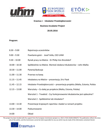 Erasmus + Inkubator Przedsiębiorczości Business Incubator Project 20.05.2016 Program: 8.30 – 9.00 Rejestracja uczestników 9.00 – 9.30 Powitanie gości - Josef Vella, CEO UHM 9.30 – 10.00 Rynek pracy na Malcie - Dr Philip Von Brockdorf 10.00 – 10.30 Spółdzielnie na Malcie. Wartość dodana Inkubatorów – John Mallia 10.30 – 11.00 Pytania/dyskusja 11.00 – 11.30 Przerwa na kawę 11.15 – 11.45 Inkubatory na Malcie – prezentacja, Eric Flask 11.45 – 12.15 Inkubator Przedsiębiorczości – prezentacja projektu (Malta, Estonia, Polska 12.15 – 13.00 Warsztaty – Co dalej po projekcie (Malta, Estonia, Polska) Warsztat 1 - Trwałość - Czy funkcjonowanie Inkubatorów jest opłacalne? Warsztat 2 - Spółdzielnie lub inkubator? 13.00 – 13.30 Prezentacje krajowych raportów z badań w ramach projektu 13.30 – 14.00 Podsumowanie 14.00 Obiad This project has been funded with the support from the European Commission (project no: 2014-1-PL01-KA202-003627). This publication reflects the views only of the author, and the Commission cannot be held responsible for any use which may be made of the information contained therein