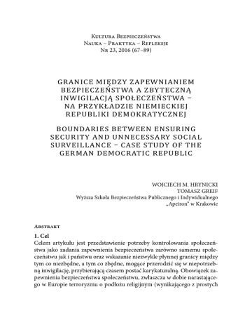 Kultura Bezpieczeństwa Nauka – Praktyka – Refleksje Nr 23, 2016 (67–89) GRANICE MIĘDZY ZAPEWNIANIEM BEZPIECZEŃSTWA A ZBYTECZNĄ INWIGILACJĄ SPOŁECZEŃSTWA – NA PRZYKŁADZIE NIEMIECKIEJ REPUBLIKI DEMOKRATYCZNEJ BOUNDARIES BETWEEN ENSURING SECURITY AND UNNECESSARY SOCIAL SURVEILLANCE – CASE STUDY OF THE GERMAN DEMOCRATIC REPUBLIC Wojciech M. Hrynicki Tomasz Greif Wyższa Szkoła Bezpieczeństwa Publicznego i Indywidualnego „Apeiron” w Krakowie Abstrakt 1. Cel Celem artykułu jest przedstawienie potrzeby kontrolowania społeczeństwa jako zadania zapewnienia bezpieczeństwa zarówno samemu społeczeństwu jak i państwu oraz wskazanie niezwykle płynnej granicy między tym co niezbędne, a tym co zbędne, mogące przerodzić się w niepotrzebną inwigilację, przybierającą czasem postać karykaturalną. Obowiązek zapewnienia bezpieczeństwa społeczeństwu, zwłaszcza w dobie narastającego w Europie terroryzmu o podłożu religijnym (wynikającego z prostych 68 • Wojciech M. Hrynicki, Tomasz Greif relacji zachodzących w społeczeństwie), jest obowiązkiem realizowanym w celu zapewnienia trwałości bytu danej grupy społecznej (narodowej, ponadnarodowej) funkcjonującej w ramach państwa i jako taki powinien być związany z trafnie dobranymi metodami nadzoru. 2. Wprowadzenie Bezpieczeństwo jest nadrzędną potrzebą człowieka i jako takie determinuje inne jego potrzeby oraz motywy podejmowanych działań. Przejawia się nie tylko brakiem występowania zagrożeń (co jest jego zasadniczym założeniem związanym z zapewnieniem bytu), ale także potrzebą działań na rzecz zapewnienia odpowiednich warunków rozwoju, zarówno jednostki jak i mniejszych i większych grup społecznych1. Stąd też dzisiejsze rozumienie bezpieczeństwa nie jest wyłącznie związane z bytem człowieka czy grup społecznych (brakiem zagrożeń), ale musi być rozpatrywane z punktu widzenia jego rozwoju, co determinuje z kolei ewolucję takich kategorii bezpieczeństwa jak bezpieczeństwo gospodarcze, naukowe, kulturowe czy bezpieczeństwo pracy. Jednak te wtórne kategorie bezpieczeństwa, gwarantujące rozwój człowieka i rozmaitych grup społecznych nie będą mogły być realizowane bez wyeliminowania potencjalnych zagrożeń2 bytu człowieka, zwłaszcza związanych z jego istnieniem, czyli życiem i zdrowiem oraz zapewnieniem ciągłości pokoleń. Dla realizacji tego celu, zwłaszcza w dobie narastającego terroryzmu niezbędny jest właściwy nadzór społeczeństwa, coraz bardziej zróżnicowanego kulturowo, w tym religijnie, ale nie może on przybrać formy karykaturalnej, jak to miało na przykład miejsce w Niemieckiej Republice Demokratycznej. 3. Metodologia Autorzy identyfikują potrzeby prowadzenia stałego nadzoru w społeczeństwie, zwłaszcza w obszarze zagrożeń terroryzmem i jednocześnie wskazują na możliwości przekroczenia niezbędnej inwigilacji w sposób prowadzący do jego form karykaturalnych, co miało miejsce w nieistniejącej już Niemieckiej Republice Demokratycznej. Przyjęta metoda historyczna porównawcza pozwala na bezpośrednią analizę potrzeb w obszarze bezpieczeń A. Czop, P. Czop, Konieczność kompleksowych i interdyscyplinarnych działań na rzecz współczesnego bezpieczeństwa w kontekście sektorowości zagrożeń, Kultura Bezpieczeństwa Nauka – Praktyka – Refleksje Nr 22, 2016 (95–111), s. 99‒101. 2 Ibidem, s. 102‒105. 1 GRANICE MIĘDZY ZAPEWNIANIEM BEZPIECZEŃSTWA… • 69 stwa w zestawieniu z potencjalnym zagrożeniem przyjęcia niewłaściwych metod ich zapewnienia. Spojrzenie na obecne zagrożenia bezpieczeństwa społeczeństwa, w tym terrorystyczne w konfrontacji z przesadną inwigilacją, która miała miejsce historycznie w nieistniejącej już ponad dwadzieścia pięć lat Niemieckiej Republice Demokratycznej, zasiewa wątpliwości w obszarze granic potrzebnej i dopuszczalnej inwigilacji społeczeństwa. 4. Wnioski Autorzy dowodzą, że trudno jest postawić sztywną granicę między tym co dozwolone, a tym co niedopuszczalne w inwigilacji społeczeństwa, zwłaszcza w sytuacji zagrożenia terroryzmem. Stąd też działania organów państwa winna cechować daleko idąca ostrożność w doborze metod prowadzonego nadzoru, by państwo demokratyczne nie przybrało form państwa policyjnego. Tym niemniej zgadzają się, że nadzór w postaci dobrze prowadzonej inwigilacji jest jedną z metod zapewnienia bezpieczeństwa jednostce i społeczeństwu. Słowa kluczowe: bezpieczeństwo, bezpieczeństwo publiczne, bezpieczeństwo społeczeństwa, inwigilacja społeczeństwa, potrzeby działania na rzecz bezpieczeństwa społeczeństwa, Niemiecka Republika Demokratyczna Abstract 1. Objective The objective of this article is to present the need to control society in order to ensure security both to the society itself and to the state, and to draw an extremely fluid boundary line between what is necessary and what is unnecessary, which may turn into unnecessary surveillance which sometimes becomes caricatural. The duty to ensure security to the society, particularly in the era of increasing religious terrorism in Europe (resulting from simple relationships in the society), is an obligation aimed at permanence of existence of a given social group (national, supranational) functioning within the state and as such should be connected with aptly chosen methods of supervision. 2. Introduction Security is the overriding need of humans and it determines their other needs and the motives for the actions they take. It manifests itself not 70 • Wojciech M. Hrynicki, Tomasz Greif only in the lack of hazards (which constitutes its basic principle related to the assurance of existence) but also in the need to take action to ensure appropriate conditions for development of individuals as well as smaller and larger social groups. Hence, today’s understanding of security is not exclusively linked with the existence of humans or social grou