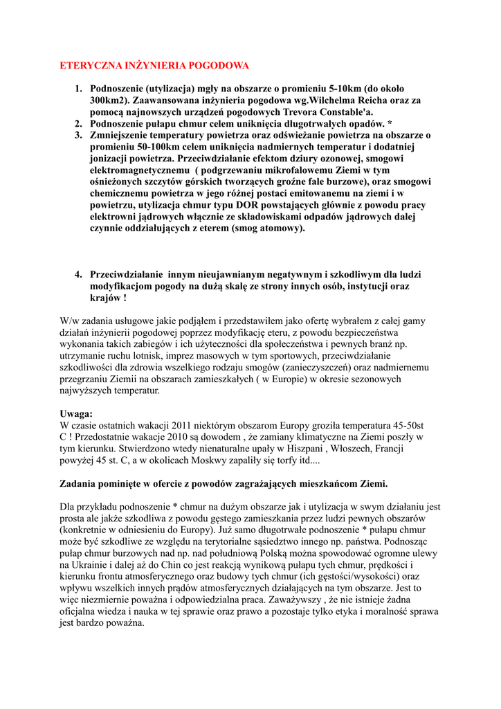 ETERYCZNA INŻYNIERIA POGODOWA 1. Podnoszenie (utylizacja) mgły na obszarze o promieniu 5-10km (do około 300km2). Zaawansowana inżynieria pogodowa wg.Wilchelma Reicha oraz za pomocą najnowszych urządzeń pogodowych Trevora Constable'a. 2. Podnoszenie pułapu chmur celem uniknięcia długotrwałych opadów. * 3. Zmniejszenie temperatury powietrza oraz odświeżanie powietrza na obszarze o promieniu 50-100km celem uniknięcia nadmiernych temperatur i dodatniej jonizacji powietrza. Przeciwdziałanie efektom dziury ozonowej, smogowi elektromagnetycznemu ( podgrzewaniu mikrofalowemu Ziemi w tym ośnieżonych szczytów górskich tworzących groźne fale burzowe), oraz smogowi chemicznemu powietrza w jego różnej postaci emitowanemu na ziemi i w powietrzu, utylizacja chmur typu DOR powstających głównie z powodu pracy elektrowni jądrowych włącznie ze składowiskami odpadów jądrowych dalej czynnie oddziałujących z eterem (smog atomowy). 4. Przeciwdziałanie innym nieujawnianym negatywnym i szkodliwym dla ludzi modyfikacjom pogody na dużą skalę ze strony innych osób, instytucji oraz krajów ! W/w zadania usługowe jakie podjąłem i przedstawiłem jako ofertę wybrałem z całej gamy działań inżynierii pogodowej poprzez modyfikację eteru, z powodu bezpieczeństwa wykonania takich zabiegów i ich użyteczności dla społeczeństwa i pewnych branż np. utrzymanie ruchu lotnisk, imprez masowych w tym sportowych, przeciwdziałanie szkodliwości dla zdrowia wszelkiego rodzaju smogów (zanieczyszczeń) oraz nadmiernemu przegrzaniu Ziemii na obszarach zamieszkałych ( w Europie) w okresie sezonowych najwyższych temperatur. Uwaga: W czasie ostatnich wakacji 2011 niektórym obszarom Europy groziła temperatura 45-50st C ! Przedostatnie wakacje 2010 są dowodem , że zamiany klimatyczne na Ziemi poszły w tym kierunku. Stwierdzono wtedy nienaturalne upały w Hiszpani , Włoszech, Francji powyżej 45 st. C, a w okolicach Moskwy zapaliły się torfy itd.... Zadania pominięte w ofercie z powodów zagrażających mieszkańcom Ziemi. Dla przykładu podnoszenie * chmur na dużym obszarze jak i utylizacja w swym działaniu jest prosta ale jakże szkodliwa z powodu gęstego zamieszkania przez ludzi pewnych obszarów (konkretnie w odniesieniu do Europy). Już samo długotrwałe podnoszenie * pułapu chmur może być szkodliwe ze względu na terytorialne sąsiedztwo innego np. państwa. Podnosząc pułap chmur burzowych nad np. nad południową Polską można spowodować ogromne ulewy na Ukrainie i dalej aż do Chin co jest reakcją wynikową pułapu tych chmur, prędkości i kierunku frontu atmosferycznego oraz budowy tych chmur (ich gęstości/wysokości) oraz wpływu wszelkich innych prądów atmosferycznych działających na tym obszarze. Jest to więc niezmiernie poważna i odpowiedzialna praca. Zaważywszy , że nie istnieje żadna oficjalna wiedza i nauka w tej sprawie oraz prawo a pozostaje tylko etyka i moralność sprawa jest bardzo poważna. Tworzenie chmur podejmował W.Reich w latach 50-tych na bazie powstałych projektów dotyczących niektórych ogromnych terenów pustynnych z dostępem do morza na długim odcinku. W tym zadaniu zawarte są warunki konieczne do takich działań , czyli rozległe obszarowo tereny przeznaczone do nawodnienia i wytworzenia flory i fauny z dużym dostępem do jeziora , morza lub rzeki (ważne jest do akwenu, w którym wody jest bardzo dużo albo woda płynie bądź przepływa) Rozległość terenów pustynnych przy tego typu działaniach gwarantuje bezpieczeństwo dla mieszkańców sąsiadujących z tymi terenami. Znam projekty takiego uzdatniania pustyń podjęte przez W.Reicha oraz J.DeMeo od roku1952. Sposób utylizacji chmur burzowych nr1. Utylizacja chmur może być prowadzona wielokierunkowo np. długotrwałe działanie cloudbusterami klasycznymi niedopuszacza do przejścia chmur i frontów burzowych w rejon takich działań z powodu silnego naładowania ziemi ładunkiem eteru-orgonu. Wtedy też działając w długim czasie doprowadzić można do suszy oraz znacznego obniżenia temperatury co np. w okresie zimy i okresach przejściowych nie jest dla nikogo korzystne ze względu na koszty ogrzewania itd.. Uwaga ; urządzenia z prostymi i miękkimi rurami oraz z dodatkowo generatorem spowalniającym eter-orgon dokonują zmiany w pogodzie w bardzo subtelny i spokojny sposób w odróżnieniu od klasycznych cloudbusterów wykonanych ze stali (szybkich uziemionych wodą) więc zmiany temperaturowe nie są gwałtownie odczuwalne. Takie urządzenia nadają się w pewnych niedługich okresach czasu do ochrony przed gwałtownymi burzami, do utylizacji smogu chemicznego , elektromagnetycznego i atomowego powietrza ale przy dłuższym działaniu mogą powodować susze. Brak opadów uzyskuje się przez przyciągnięcie do Ziemi dużego ładunku eteru , który przez generatory zatrzymany jest na czas ich działania przy Ziemi. Sposób utylizacji chmur burzowych nr 2. Można utylizować chmury oraz całe ciągi frontów burzowych w ciągu krótkiego czasu ustawiając „baterię” cloudbusterów na linii kilku kilometrów. Np. zgodnie z ruchem frontu atmosferycznego w Europie z zachodu na wschód (zgodnie z opływem wokół Ziemii eteruorgonu z zachodu na wschód-eter porusza się nieco szybciej niż obracająca się Ziemia-eter pociąga Ziemię ), więc chcąc utylizować duży front nadciągający od strony Niemiec ustawiając linię cloudbusterów na odcinku kilku kilometrów (cloudbusterów szybkich), ściągając (przemieszczając) ładunek energi eteru-orgonu do Ziemii , pozbawiamy nadchodzące chmury ich przyczyny spójności i cała masa wody zlewa się na byłe obszary wschodnich Niemiec przynosząc klęskę powodzi ! Analogiczna sytuacja może nastąpić przesuwając to zasymulowane zdarzenie o jedną granicę dalej na wschód od Polski. Sposób utylizacji chmur burzowych nr 3. Duże chmury burzowe można „przeciągnąć” przemieścić w inn