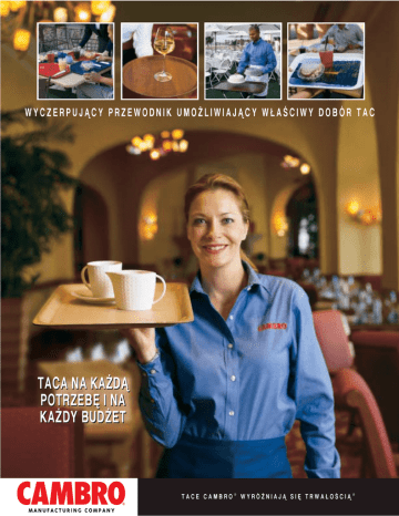 WYCZERPUJÑCY PRZEWODNIK UMO˚LIWIAJÑCY W¸AÂCIWY DOBÓR TAC TACA NA KA˚DÑ POTRZEB¢ I NA KA˚DY BUD˚ET TACE CAMBRO® WYRÓ˚NIAJÑ SI¢ TRWA¸OÂCIÑ® WST¢P DO TAC CAMBRO® Najwi´kszy na Êwiecie asortyment tac Firma Cambro zosta∏a za∏o˝ona ponad pi´çdziesiàt lat temu przez braci Billa i Argyle'a Campbell, którzy wynaleêli i zacz´li sprzedawaç tace Camtray®. Tace Camtray zdoby∏y sobie szybko uznanie fachowców prowadzàcych placówki ˝ywienia zbiorowego i sta∏y si´ standardowym elementem wyposa˝enia tych placówek. Obecnie Cambro nadal jest czo∏owym ich dostawcà. Rozszerzony asortyment tac Cambro obejmuje najwi´kszy wybór materia∏ów, rozmiarów, kolorów i kszta∏tów po ró˝nych cenach. Dzi´ki temu mo˝na znaleêç tac´ na ka˝dà okazj´ i na ka˝dà kieszeƒ. Zapraszamy do zapoznania si´ z rozszerzonym asortymentem i wybrania najodpowiedniejszych dla siebie tac Cambro. PRZEWODNIK PO PRODUKTACH TACE POLIESTROWE TACE Z W¸ÓKNA SZKLANEGO TACE DREWNIANE 3-5 6-9 10-11 12-13 TACE LAMINOWANE TACE POLIPROPYLENOWE TACE TERMICZNE TACE SEGMENTOWANE 14-17 18-19 20 21 PERSONALIZACJA INFORMACJA O PRODUKTACH 22-23 24-27 Cambro wytwarza ponad 14,000 produktów dla przemys∏u ˝ywienia zbiorowego. Aby uzyskaç ich pe∏ny spis, prosimy zwróciç si´ o BEZP¸ATNY katalog wyrobów do swojego przedstawiciela sprzeda˝y Cambro. OBJAÂNIENIE SYMBOLI ® W ca∏ym katalogu Cambro znajdujà si´ ∏atwo rozpoznawalne symbole okreÊlajàce funkcje i przeznaczenie wyrobów Cambro: Zatwierdzone przez National Odpowiednie dla Sanitation Foundation. NSF produktów zatwierdza produkty spe∏niajàce jej ˝ywnoÊciowych kryteria sanitarne. Uk∏adalne w sterty Nadajà si´ do zmywarek mechanicznych Dost´pna personalizacja Liczba lat gwarancji GWARANCJE 1. Przed st∏uczeniem przy normalnym u˝ytkowaniu 2. Przy normalnym u˝ytkowaniu 3. Przed rozwarstwieniem przy normalnym u˝ytkowaniu Tace Versa, tace Versa dekorowane, tace Versa dekorowane z powierzchniami antypoÊlizgowymi Tace Camtray® Tace Camtread® 1. Przed st∏uczeniem przy normalnym u˝ytkowaniu 2. Gwarancja zale˝na od czasu u˝ytkowania Tace Versa Lite Asortyment tac drewnianych, laminowanych, dla restauracji szybkiej obs∏ugi, Polytread® Tablotherm, 1596CW, 10146DCW and 10146DCP 1. Przeciw obni˝eniu jakoʶci powierzchni antypoÊlizgowej podczas normalnego u˝ytkowania Tace Versa dekorowane z powierzchniami antypoÊlizgowymi Przewodnik po produktach TACE POLIESTROWE TACE DREWNIANE strony 6 - 9 strony 10 - 11 Tace Versa Lite VT/GL Tace Camtray Tace Camtread® SMC-poliester standardowy wzmocniony w∏óknem szklanym Warstwy w∏ókna szklanego + ˝ywica poliestrowa + pr´t aluminiowy Warstwy w∏ókna szklanego + ˝ywica poliestrowa + AntypoÊlizgowa powierzchnia G∏adka Doskona∏a SMC-poliester wysokiej jakoÊci wzmocniony w∏óknem szklanym + powierzchnia melaminowa G∏adka Doskona∏a Tace Versa dekorowane z powierzchniami antypoÊlizgowymi VT/GP SMC-poliester wysokiej jakoÊci wzmocniony w∏óknem szklanym + powierzchnia AntypoÊlizgowa AntypoÊlizgowa Doskona∏a G∏adka Doskona∏a G∏adka Doskona∏a AntypoÊlizgowa gumowana Tak 5 Tak Nie 5 Tak Nie 2 Tak Tak 3 Tak Tak 5 Tak Nie 5 Tak Nadajà si´ do zmywarek mechanicznych Tak - wielokrotnie Tak - wielokrotnie Tak - normalnie Tak - normalnie Tak - wielokrotnie Tak - wielokrotnie OdpornoÊç na chemikalia Test suszenia Test odpornoÊci na szok termiczny OdpornoÊç na st∏uczenie OdpornoÊç na zadrapanie OdpornoÊç na zaplamienie OdpornoÊç na temperatur´ Liczba rozmiarów Liczba kszta∏tów Liczba kolorów Doskona∏a Doskona∏a Doskona∏a Dobra Doskona∏a Dobra Doskona∏a Doskona∏a Doskona∏a Doskona∏a Doskona∏a Doskona∏a Doskona∏a Dobra Doskona∏a Doskona∏a Doskona∏a Doskona∏a Doskona∏a Doskona∏a Doskona∏a Dobra Dobra Dobra Doskona∏a Doskona∏a Dobra Dobra Doskona∏a Doskona∏a Doskona∏a Doskona∏a Dobra Dobra Doskona∏a Dobra -40˚ do +140˚C -40˚ do +100˚C -40˚ do +100˚C -40˚ do +130˚C -10˚ do +82˚C -10˚ do +82˚C 27 10 2 15 52 16 9 3 1 4 6 4 10 15 5 6 74 5 Opis tac Tace Versa VT/GP Tace Versa dekorowane VT/GP Materia∏ SMC-poliester wysokiej jakoÊci wzmocniony w∏óknem szklanym Powierzchnia FunkcjonalnoÊç Zalecane zastosowania Personalizacja Liczba lat gwarancji Separatory suchej sterty* ® Doskona∏a * Êeparatory suchej sterty pozwalajà na swobodny obieg powietrza i doskona∏e uk∏adanie w sterty. Przeglàd materia∏ów Tace poliestrowe – Tace VT/GP* – Tace VT/GP ** dekorowane – Tace VT/GP *** dekorowane i z antypoÊlizgowà powierzchnià Tace poliestrowe wysokiej jakoÊci wykonane sà z solidnej, wzmocnionej maty z d∏ugich w∏ókien szklanych, dodatkowo wzmocnionej dla uzyskania wysokiej odpornoÊci na uderzenie. Barwiona ˝ywica izoftalowo poliestrowa odznacza si´ wysokà odpornoÊcià na chemikalia i promieniowanie ultrafioletowe. *Idealne do podgrzewanych wózków dowo˝àcych posi∏ki. ** Zewn´trzna warstwa melaminy polepsza ochron´ przed zaplamieniem, otarciem i zadrapaniem. ***Idealne do podgrzewanych indukcyjnie wózków dowo˝àcych posi∏ki. Dwuletnia gwarancja na trwa∏oÊç antypoÊlizgoweantypoÊlizgowej powierzchni. Tace Versa Lite Tace z w∏ókna szklanego Standardowe tace poliestrowe sà wykonane z w∏ókna szklanego i ze standardowej ˝ywicy poliestrowej. – Tace Camtray – Tace Camtread Wykonane z w∏ókna szklanego, sà mocne i g∏adkie wewnàtrz, zaÊ ˝ywica poliestrowa zapewnia odpornoÊç na uderzenie, plamy i chemikalia. Gwarancja na 5 lat. Tace Camtread z antypoÊlizgowà powierzchnià gumowanà sà obj´te 5 letnià gwarancjà przed rozwarstwieniem. Przewodnik po produktach TACE POLIESTROWE TACE Z W¸ÓKNA SZKLANEGO strony 12 - 9 strony 14 - 17 Opis tac Tace drewniane g∏adkie Tace drewniane antypoÊlizgowe Tace Corfu laminowane antypoÊlizgowe gumowane Tace Capri laminowane g∏adkie Tace Mykonos laminowane antypoÊlizgowe Tace 