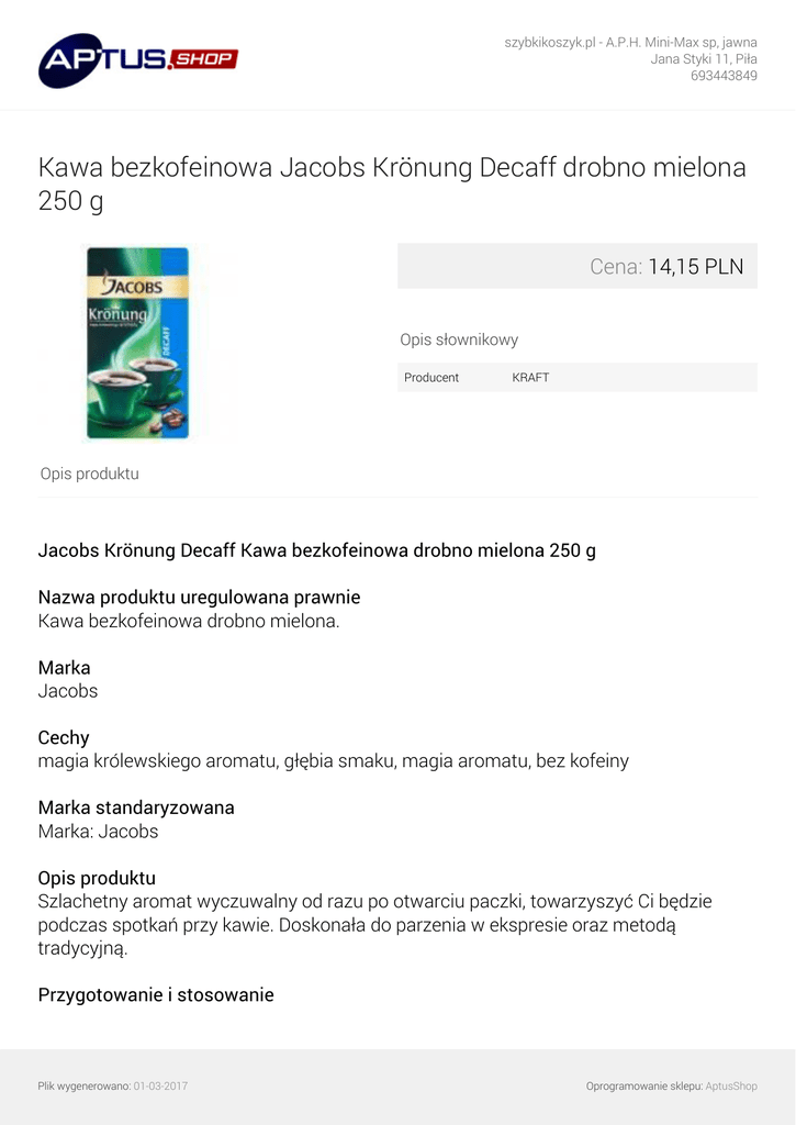 szybkikoszyk.pl - A.P.H. Mini-Max sp, jawna Jana Styki 11, Piła 693443849 Kawa bezkofeinowa Jacobs Krönung Decaff drobno mielona 250 g Cena: 14,15 PLN Opis słownikowy Producent KRAFT Opis produktu Jacobs Krönung Decaff Kawa bezkofeinowa drobno mielona 250 g Nazwa produktu uregulowana prawnie Kawa bezkofeinowa drobno mielona. Marka Jacobs Cechy magia królewskiego aromatu, głębia smaku, magia aromatu, bez kofeiny Marka standaryzowana Marka: Jacobs Opis produktu Szlachetny aromat wyczuwalny od razu po otwarciu paczki, towarzyszyć Ci będzie podczas spotkań przy kawie. Doskonała do parzenia w ekspresie oraz metodą tradycyjną. Przygotowanie i stosowanie Plik wygenerowano: 01-03-2017 Oprogramowanie sklepu: AptusShop szybkikoszyk.pl - A.P.H. Mini-Max sp, jawna Jana Styki 11, Piła 693443849 Kawa idealna na wiele sposobów zalanie gorącą wodą ekspres przelewowy zaparzarka Przechowywanie Po otwarciu przechowywać w suchym i chłodnym miejscu Przepisy Przepis na wyjątkowe chwile we dwoje Do szklanki do latte (pojemność ok. 280 ml) wlej sos karmelowy (20 ml) i syrop orzechowy (10 ml). Dopełnij spienionym mlekiem. Dolej gorącej zaparzonej kawy (50 ml) i rozkoszuj się chwilą z kawą bezkofeinową Jacobs! Rodzaj przechowywania Typ: Przechowywać w temperaturze otoczenia Rozmiar opakowania 250 Jednostka (tekst opisowy) g Średnia miara Średnia miara (e) Jednostka (specyficzna) Jednostka (specyficzna): Gramów Kraj Kraj produkcji: Niemcy Rodzaj opakowania Typ: Pakowane próżniowo Wymiar liczbowy Wymiar liczbowy: 250 Wymiar Wymagana wysokość na półce: 148 Wymagana szerokość na półce: 82 Wymagana głębokość na półce: 46 Plik wygenerowano: 01-03-2017 Oprogramowanie sklepu: AptusShop szybkikoszyk.pl - A.P.H. Mini-Max sp, jawna Jana Styki 11, Piła 693443849 Waga Waga brutto: 262 Sprzedaż jednostkowa Wysokość: 148 Szerokość: 82 Głębokość: 46 Adres zwrotny Mondelez Polska S.A. ul. Domaniewska 49 02-672 Warszawa Infolinia: 801 066 006 Opłata według taryfy lokalnej. Adres dystrybutora Mondelez Polska S.A. ul. Domaniewska 49 02-672 Warszawa Telefon/Fax kontaktowy Infolinia: 801 066 006 Języki na opakowaniu polski Język produktu Główny język opisu: polski Język danych: polski Plik wygenerowano: 01-03-2017 Powered by TCPDF (www.tcpdf.org) Oprogramowanie sklepu: AptusShop