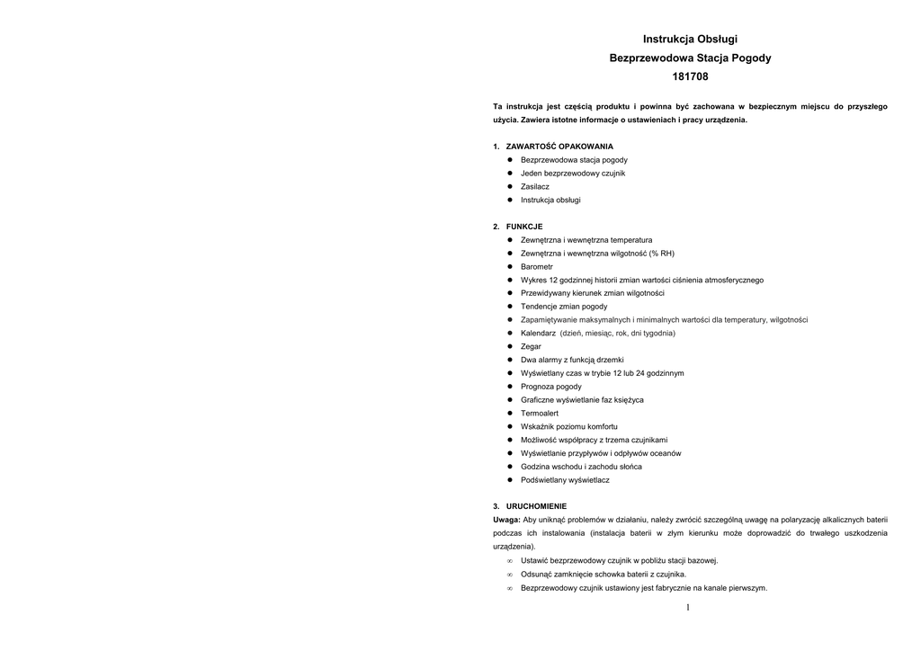 Instrukcja Obsługi Bezprzewodowa Stacja Pogody 181708 Ta instrukcja jest częścią produktu i powinna być zachowana w bezpiecznym miejscu do przyszłego użycia. Zawiera istotne informacje o ustawieniach i pracy urządzenia. 1. ZAWARTOŚĆ OPAKOWANIA Bezprzewodowa stacja pogody Jeden bezprzewodowy czujnik Zasilacz Instrukcja obsługi 2. FUNKCJE Zewnętrzna i wewnętrzna temperatura Zewnętrzna i wewnętrzna wilgotność (% RH) Barometr Wykres 12 godzinnej historii zmian wartości ciśnienia atmosferycznego Przewidywany kierunek zmian wilgotności Tendencje zmian pogody Zapamiętywanie maksymalnych i minimalnych wartości dla temperatury, wilgotności Kalendarz (dzień, miesiąc, rok, dni tygodnia) Zegar Dwa alarmy z funkcją drzemki Wyświetlany czas w trybie 12 lub 24 godzinnym Prognoza pogody Graficzne wyświetlanie faz księżyca Termoalert Wskaźnik poziomu komfortu Możliwość współpracy z trzema czujnikami Wyświetlanie przypływów i odpływów oceanów Godzina wschodu i zachodu słońca Podświetlany wyświetlacz 3. URUCHOMIENIE Uwaga: Aby uniknąć problemów w działaniu, należy zwrócić szczególną uwagę na polaryzację alkalicznych baterii podczas ich instalowania (instalacja baterii w złym kierunku może doprowadzić do trwałego uszkodzenia urządzenia). • Ustawić bezprzewodowy czujnik w pobliżu stacji bazowej. • Odsunąć zamknięcie schowka baterii z czujnika. • Bezprzewodowy czujnik ustawiony jest fabrycznie na kanale pierwszym. 1 • WARUNKI GWARANCJI Włożyć dwie baterie AAA (LR03) do bezprzewodowego czujnika. Uruchomienie stacji bazowej Istnieją dwie opcje zasilania stacji bazowej: 1. za pomocą zasilacza będącego w zestawie: • Podłączyć zasilacz do kontaktu, natomiast drugą końcówkę włożyć w otwór znajdujący się z tyłu termometru. • Po podłączeniu zapalą się na 3 s wszystkie segmenty wyświetlacza LCD. Stacja rozpocznie synchronizację z bezprzewodowym czujnikiem. • Nie naciskać żadnego przycisku przez 3 minuty, poczekać do pojawienia się wszystkich wartości. • Stacja bazowa będzie poszukiwać sygnału radiowego wysyłanego z czujnika zewnętrznego. • Stacja podczas całej pracy na zasilaczu będzie podświetlona. 2. poprzez instalację baterii: • Otworzyć pokrywę baterii znajdującą się na tylnej części stacji bazowej. • Włożyć trzy baterie AAA (LR03) do stacji pogody. Po włożeniu baterii do stacji pogody zapalą się na 3 s wszystkie segmenty wyświetlacza LCD. Stacja rozpocznie synchronizację z bezprzewodowym czujnikiem. • Zamknąć pokrywę baterii. • Stacja bazowa będzie poszukiwać sygnału radiowego wysyłanego z czujnika zewnętrznego. • Zamknąć pokrywę baterii w czujniku bezprzewodowym. • Aby odczytywać zewnętrzną temperaturę należy umieścić czujnik na zewnątrz pomieszczenia. Czujnik 1. Niniejsza gwarancja jest udzielana przez firmę BIOWIN Sp. z o.o. z siedzibą przy ul. Pryncypalnej 129/141; 93-373 Łódź, nazywaną w dalszej części gwarancji Gwarantem. 2. Niniejsza gwarancja dotyczy wyłącznie sprzętu używanego na terytorium Polski. 3. Okres gwarancji wynosi 12 miesięcy od daty zakupu sprzętu. 4. W przypadku wad uniemożliwiających korzystanie ze sprzętu okres gwarancji ulega przedłużeniu o czas od dnia zgłoszenia wady do dnia wykonania naprawy. 5. Gwarancja uprawnia do bezpłatnych napraw nabytego sprzętu, polegających na usunięciu wad fizycznych, które ujawniły się w okresie gwarancyjnym, z zastrzeżeniem punktu 9. 6. Zgłoszenie wady sprzętu powinno zawierać: dowód zakupu towaru; nazwę i model towaru; datę sprzedaży (bez skreśleń i poprawek); podpis i pieczątkę sprzedawcy. 7. Gwarant w terminie 14 dni roboczych od daty zgłoszenia wady ustosunkuje się do zgłoszonej reklamacji. Jeżeli do dokonania naprawy wystąpi konieczność sprowadzenia części zamiennych z zagranicy termin naprawy może ulec przedłużeniu do czasu sprowadzenia niezbędnej elementów, lecz maksymalnie do 30 dni roboczych od daty otrzymania towaru do naprawy. 8. Reklamujący powinien dostarczyć towar odpowiednio zabezpieczony przed uszkodzeniem w czasie transportu. 9. Gwarancja nie obejmuje: uszkodzeń mechanicznych, chemicznych, termicznych i korozji; uszkodzeń spowodowanych działaniem czynników zewnętrznych, niezależnych od producenta, a w szczególności wynikających z użytkowania niezgodnego z Instrukcją Obsługi; usterek powstałych w wyniku niewłaściwego montażu sprzętu samowolnych, dokonywanych przez użytkownika lub inne nieupoważnione osoby napraw, przeróbek lub zmian konstrukcyjnych. 10. Niniejsza gwarancja nie ogranicza, nie zawiesza ani nie wyłącza uprawnień kupującego w stosunku do sprzedawcy, wynikających z niezgodności towaru konsumpcyjnego z umową. 11. W przypadku gdy naprawa, bądź wymiana urządzenia na nowe jest niemożliwa, reklamującemu przysługuje prawo do zwrotu zapłaconej kwoty. będzie mierzył i wysyłał zarejestrowane wartości z miejsca, w którym jest zamontowany. Nazwa i model Data sprzedaży Podpis i pieczątka sprzedawcy Każdorazowo, gdy czujnik zewnętrzny jest zasilony ponownie (np. po wymianie baterii), wysyłany jest do stacji losowy kod ochronny. Następuje synchronizacja obu urządzeń. Zatem, jeśli nastąpi wymiana baterii w czujniku, stacja pogody, aby odzyskać kontakt z czujnikiem również musi być zrestartowana przez chwilowe wyjęcie baterii. Uwaga: Po pojawieniu się na wyświetlaczu wszystkich (wew. i zew.) mierzonych wartości, można umieścić bezprzewodowy czujnik na zewnątrz, a stację w wybranym miejscu. Jeśli na stacji pogody nie pokażą się zewnętrzne pomiary, upewnij się czy czujnik jest w zasięgu stacji lub powtórz procedurę instalacji baterii. Jeśli został naciśnięty jakiś klawisz przed pojawieniem się wszystkich odczytów na wyświetlaczu stacji, należy ponownie przeprowadzić procedurę instalacji baterii. Przed ponownym zainstalowaniem baterii prosimy p