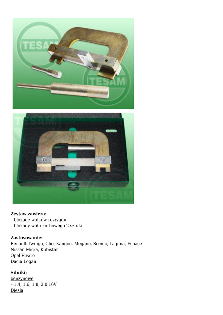 Zestaw zawiera: – blokadę wałków rozrządu – blokady wału korbowego 2 sztuki Zastosowanie: Renault Twingo, Clio, Kangoo, Megane, Scenic, Laguna, Espace Nissan Micra, Kubistar Opel Vivaro Dacia Logan Silniki: benzynowe – 1.4, 1.6, 1.8, 2.0 16V Diesla – 1.5 dCi Kod silnika: – K4J ( 712/713/730/732/750 ), – K4M ( 700/701/720/724/748/760/761/764/782 ), – F4P ( 720/722/760 ), – F4R ( 700/701/730/740/741/744/771/780 ), – D4F ( 704/708/714/730/740/764 ), – D7F ( 700/701/703/710/730 ), – K4M ( 716/760/761/766/782/800/807/812/813 ), – F4P ( 770/771 ), K4J ( 770/780 ), – K4M ( 790/791/792/794/802/804 ), – K4M ( 708/730/732/750/752/753 ), – K9K ( 700/702/704/710/714/718/728/732 ), – K9K ( 722/724/728/729/732/750/752/764/766/768/772 ), – S8U ( 758/770/772 ), – S9W ( 700/702 ), – F5R740, – F3P, – F3R750, – F4RT786, – F8M, – F9Q620, – FMBA/B, – FSR740 Nr katalogowy: S0000034